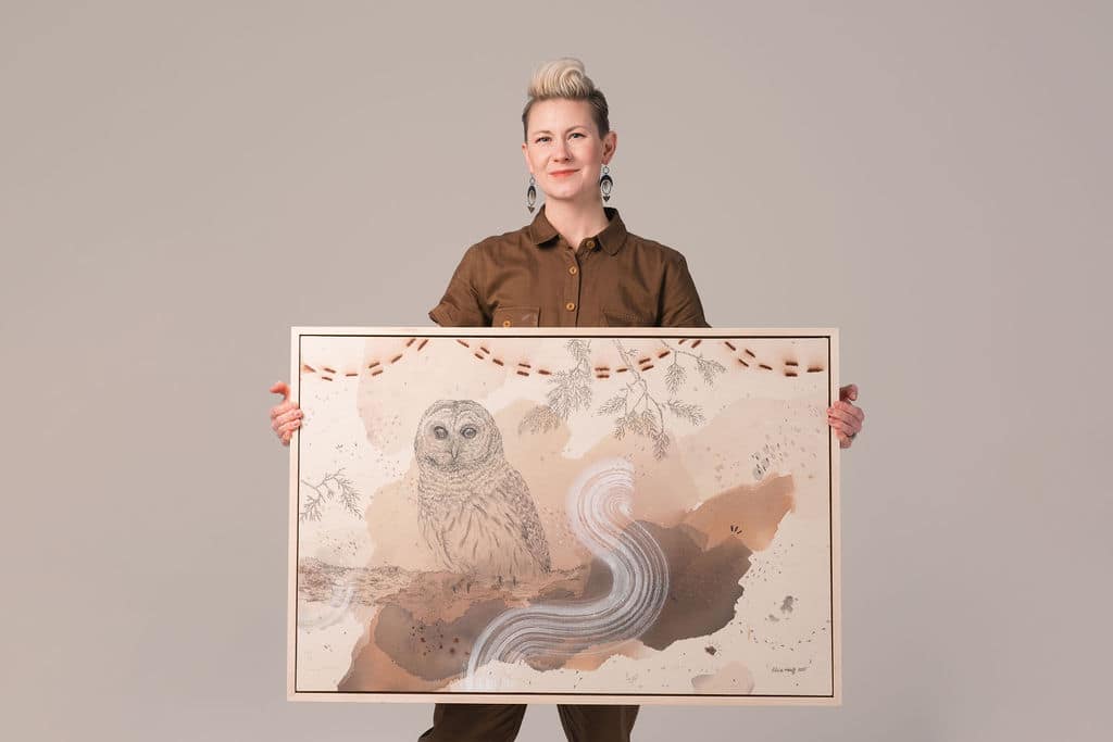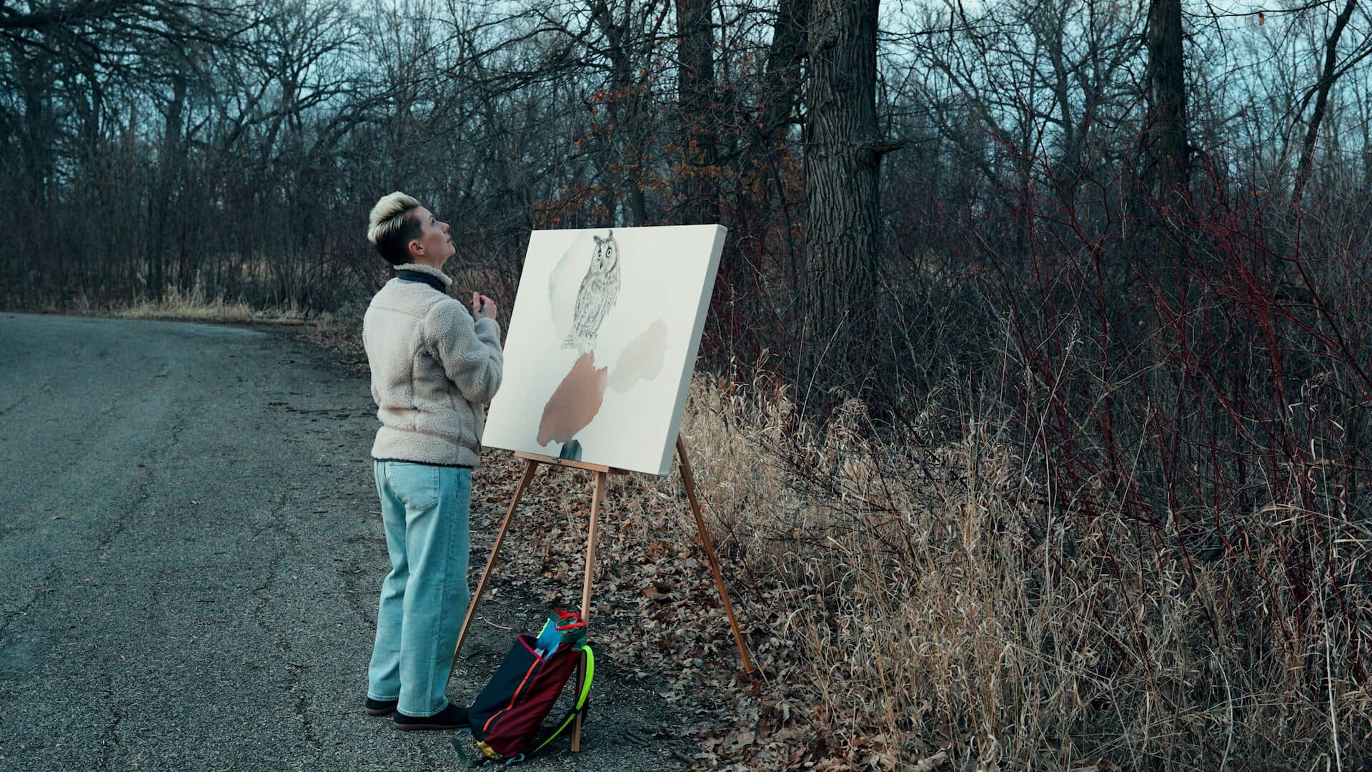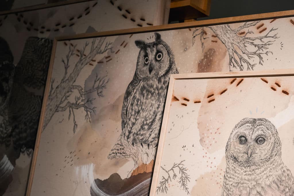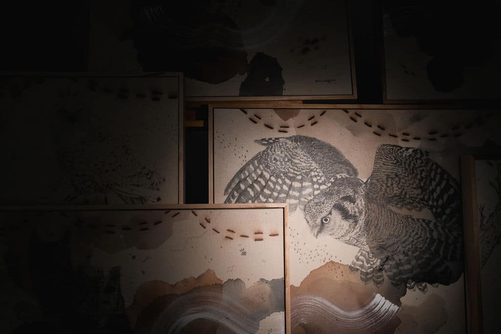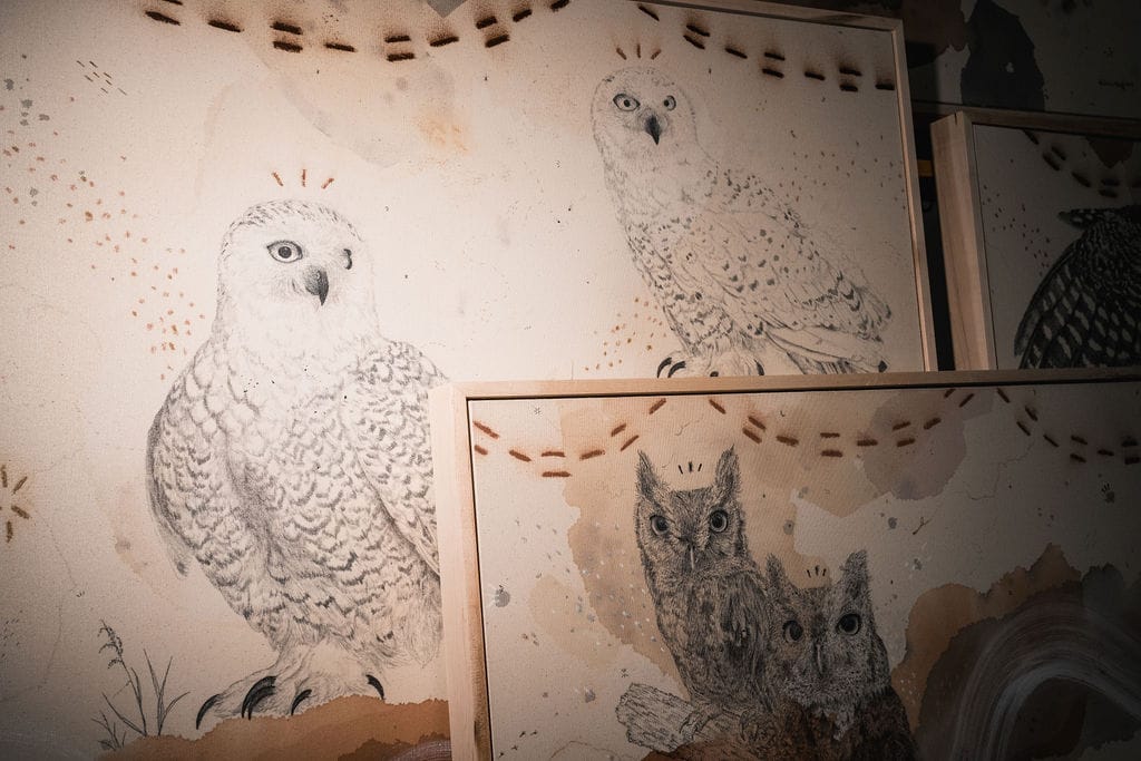 A significant shift was also the desire to visually deepen the work with videography. I wanted folks to feel the energy of this series. To see what an owl might see. I took a work-in-progress and an easel out to south Fargo and drew some gnarly tree branches with Long-Eared owl. It was a beautiful, clear night; with the full moon rising, I put on my headlamp and kept drawing. A big thanks to Nick Deraney of True North Media for capturing this.