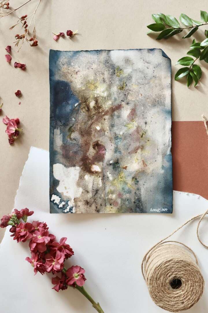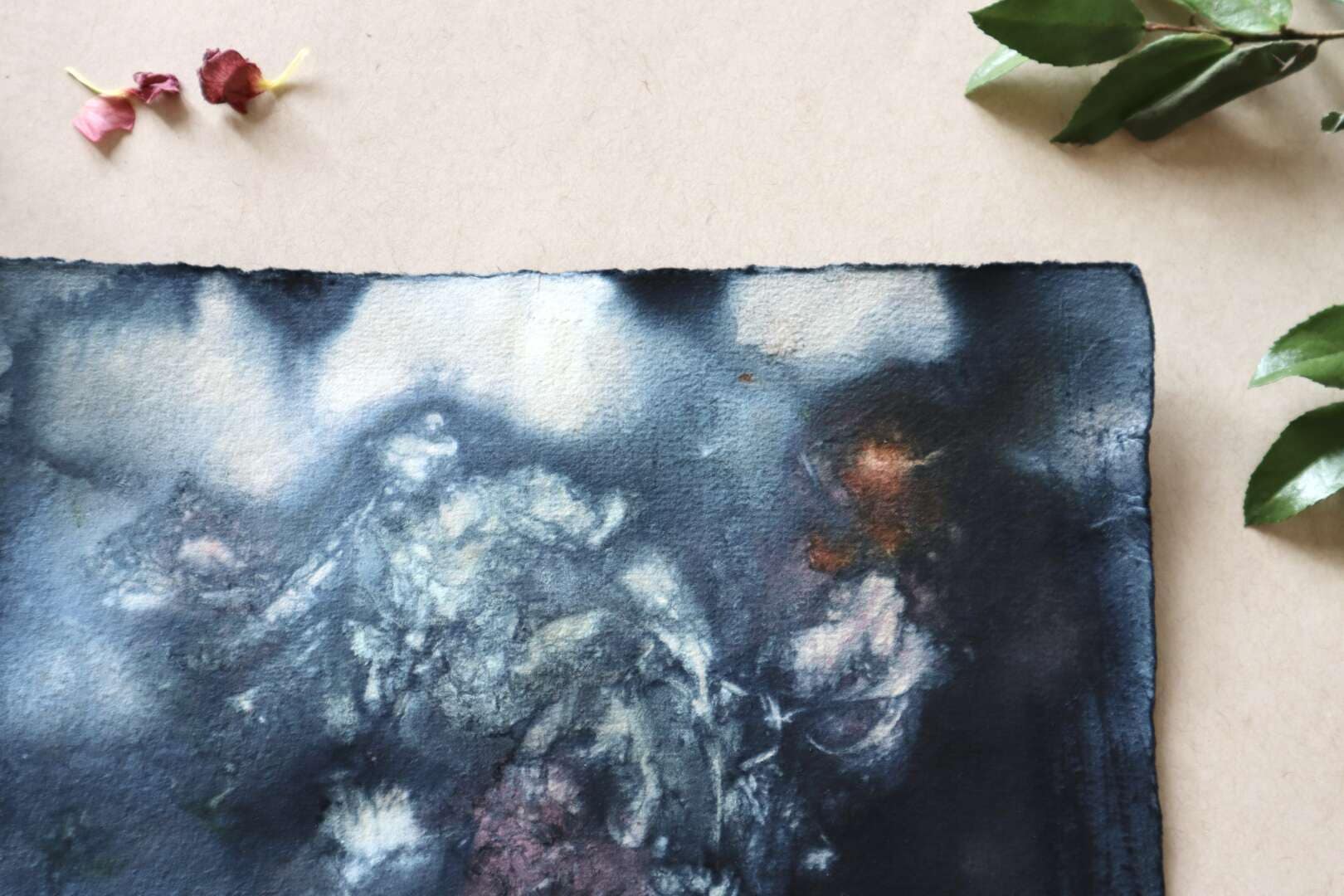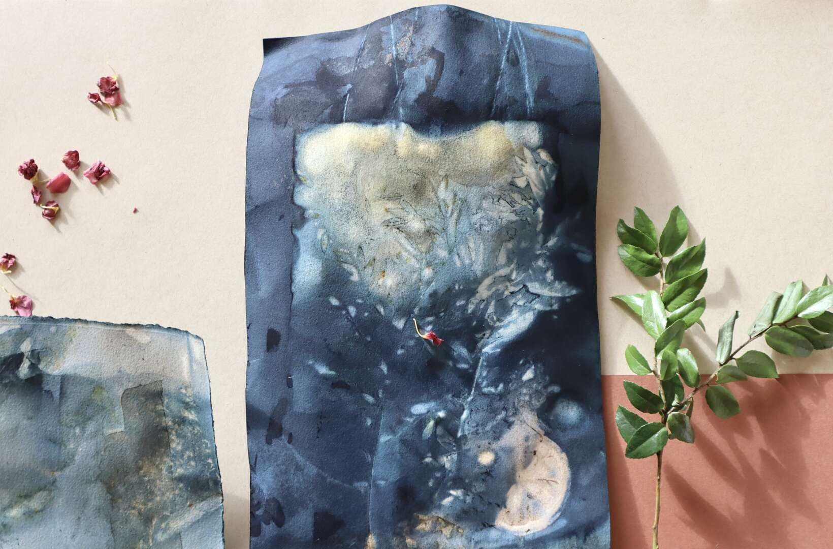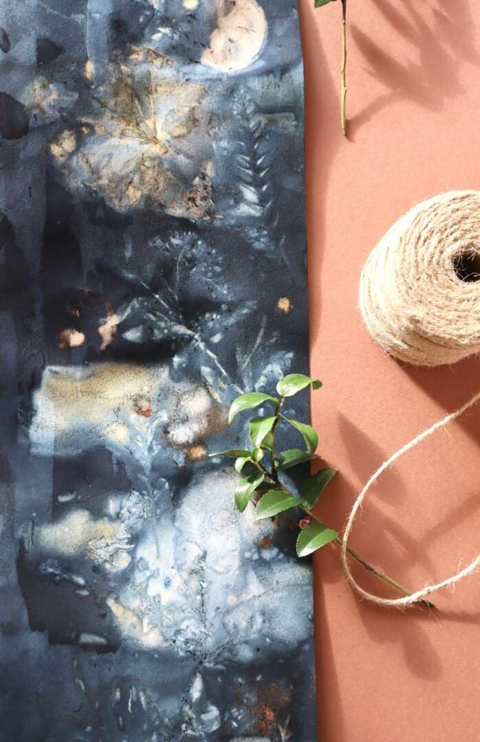 This creative process includes foraging plants for printing in a bundle rolled in layers of French printmaking paper and submerging the bundle in a natural dye bath. Once the prints are dried, they’re ready for beautiful things like this!