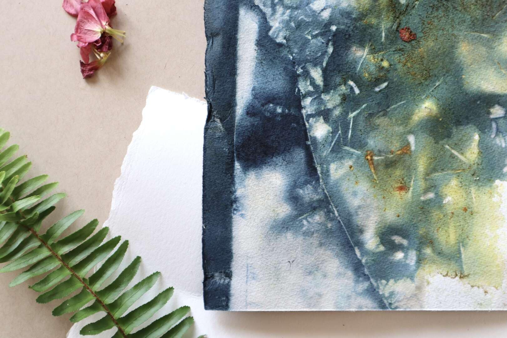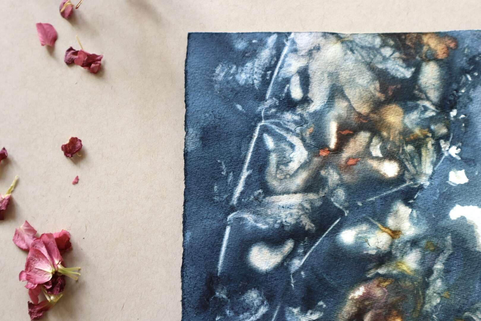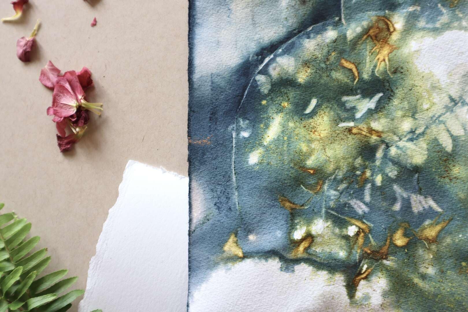 This creative process includes foraging plants for printing in a bundle rolled in layers of French printmaking paper and submerging the bundle in a natural dye bath. Once the prints are dried, they’re ready for beautiful things like this!
