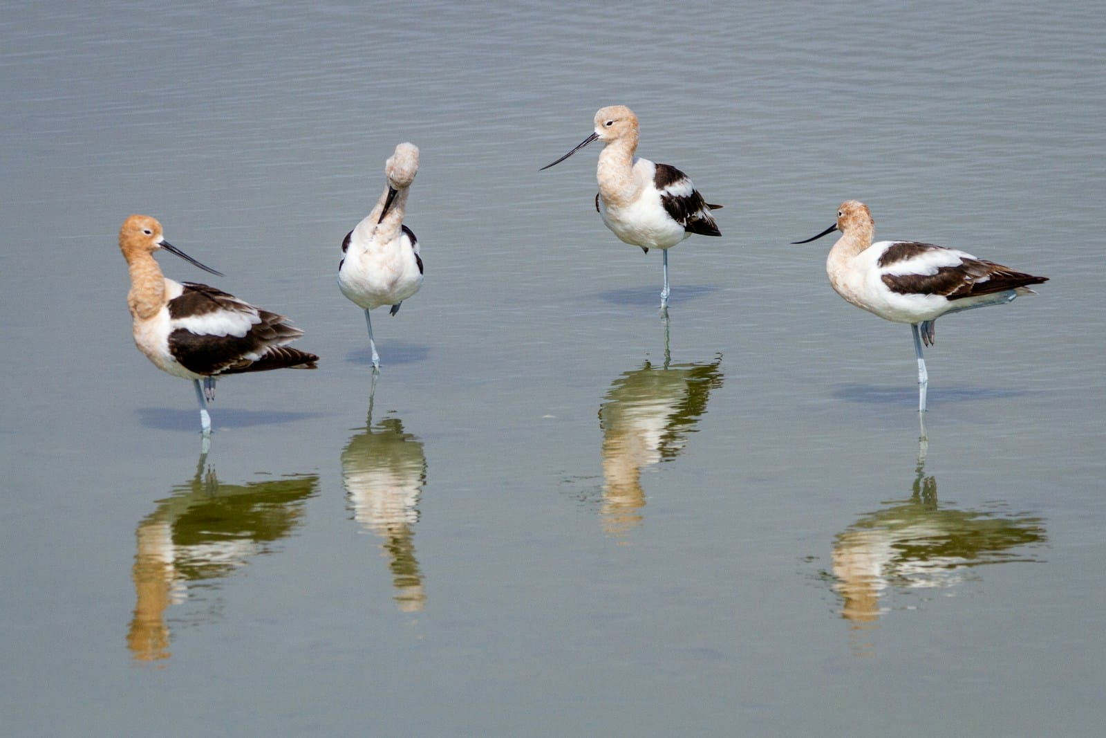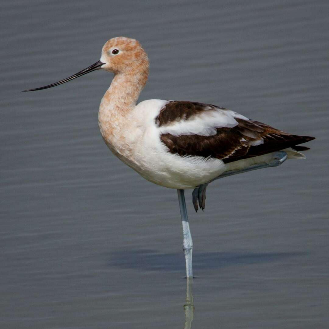 If the Canvasback is the aristocrat of ducks, the Avocet is the aristocrat of stilted shorebirds. In shallow wetlands, their black-and-white bodies, long, upturned bill, and elegant profile stand out among the other wading birds. They generally forage and hang with other shorebirds in open shallow waters. Males and females are similar, with orangey heads and necks, long, upturned beaks, and black and white wings.