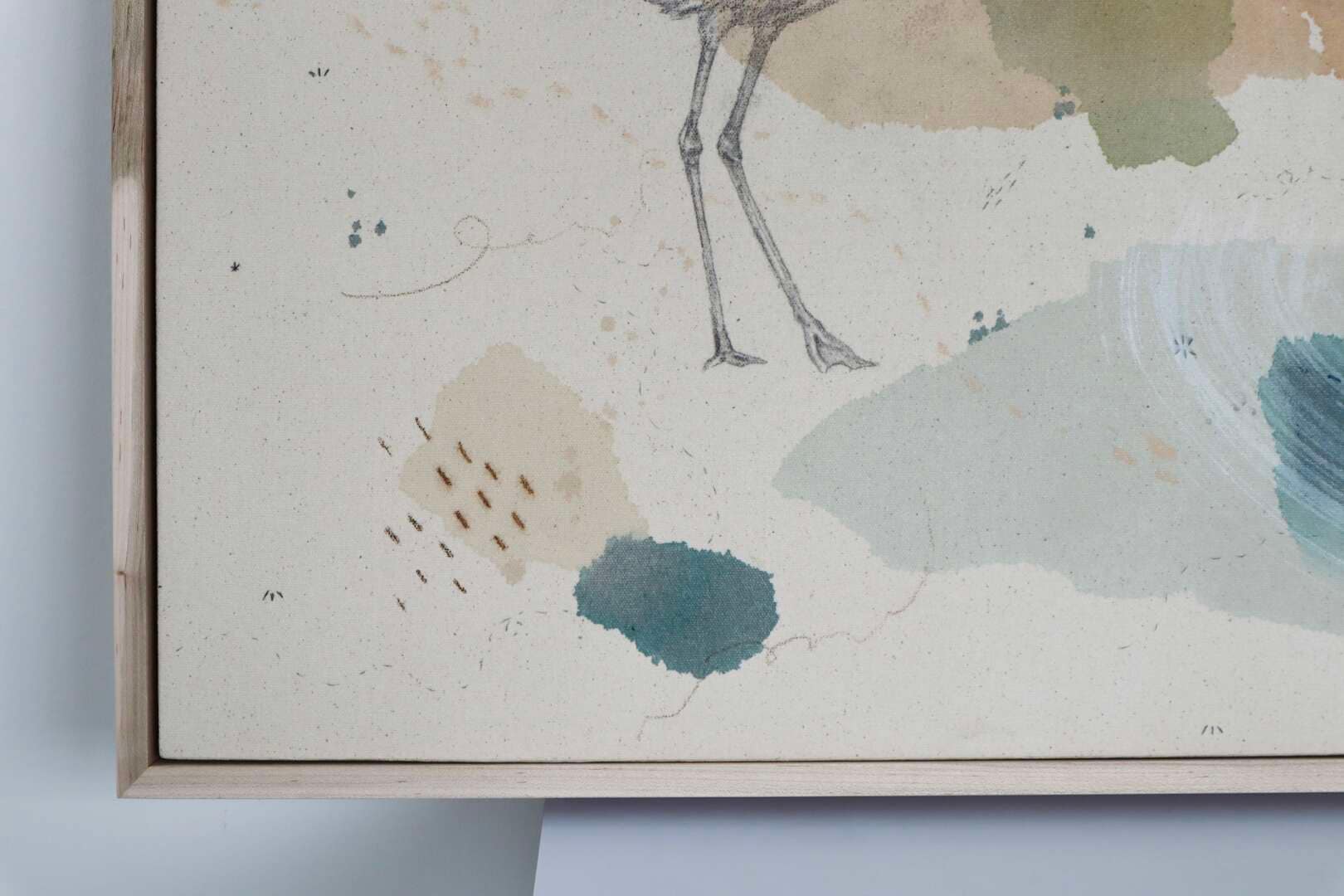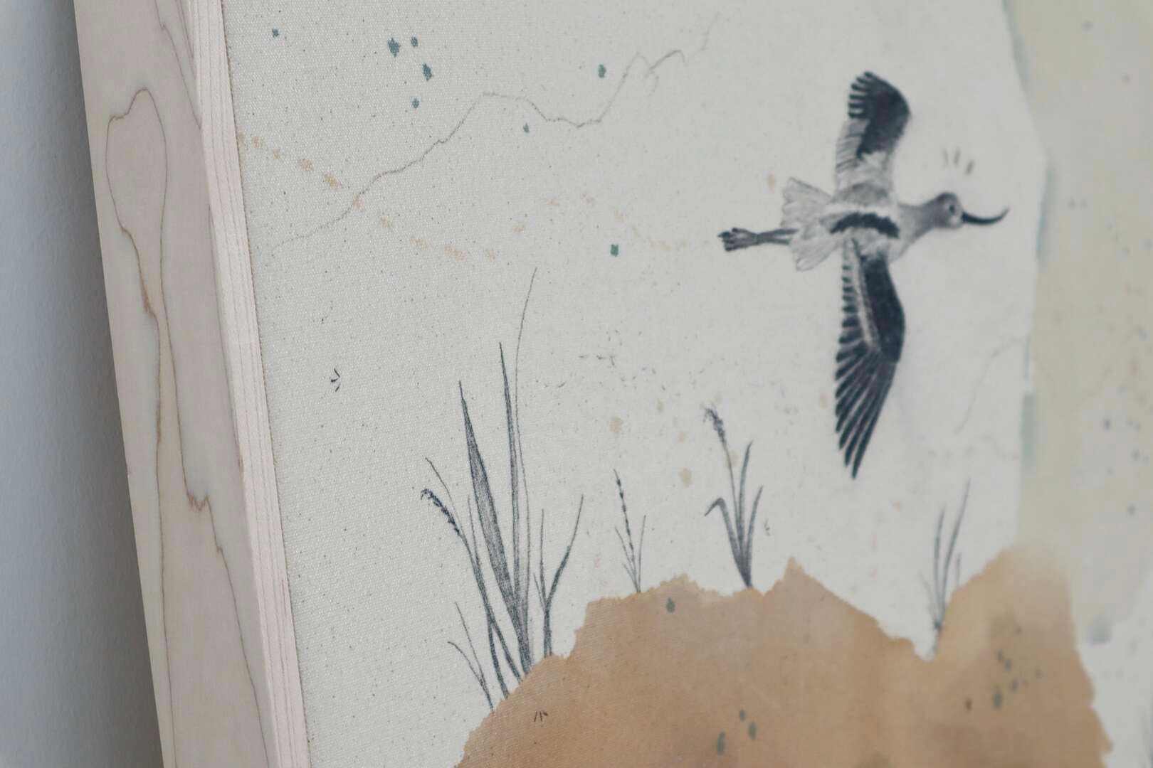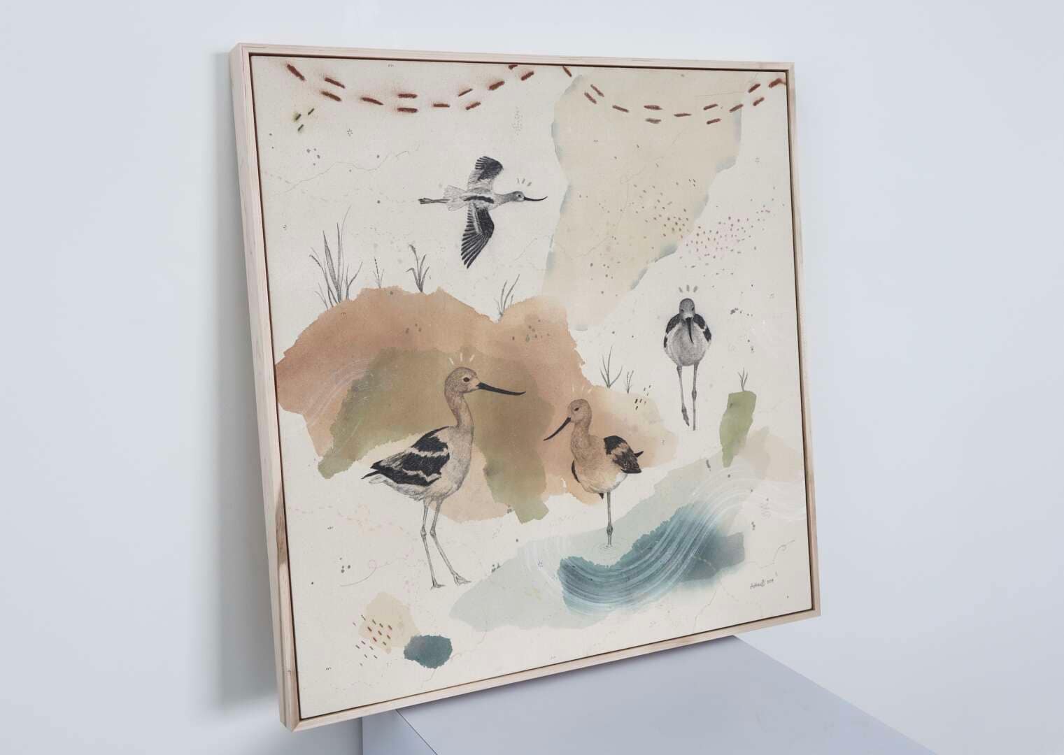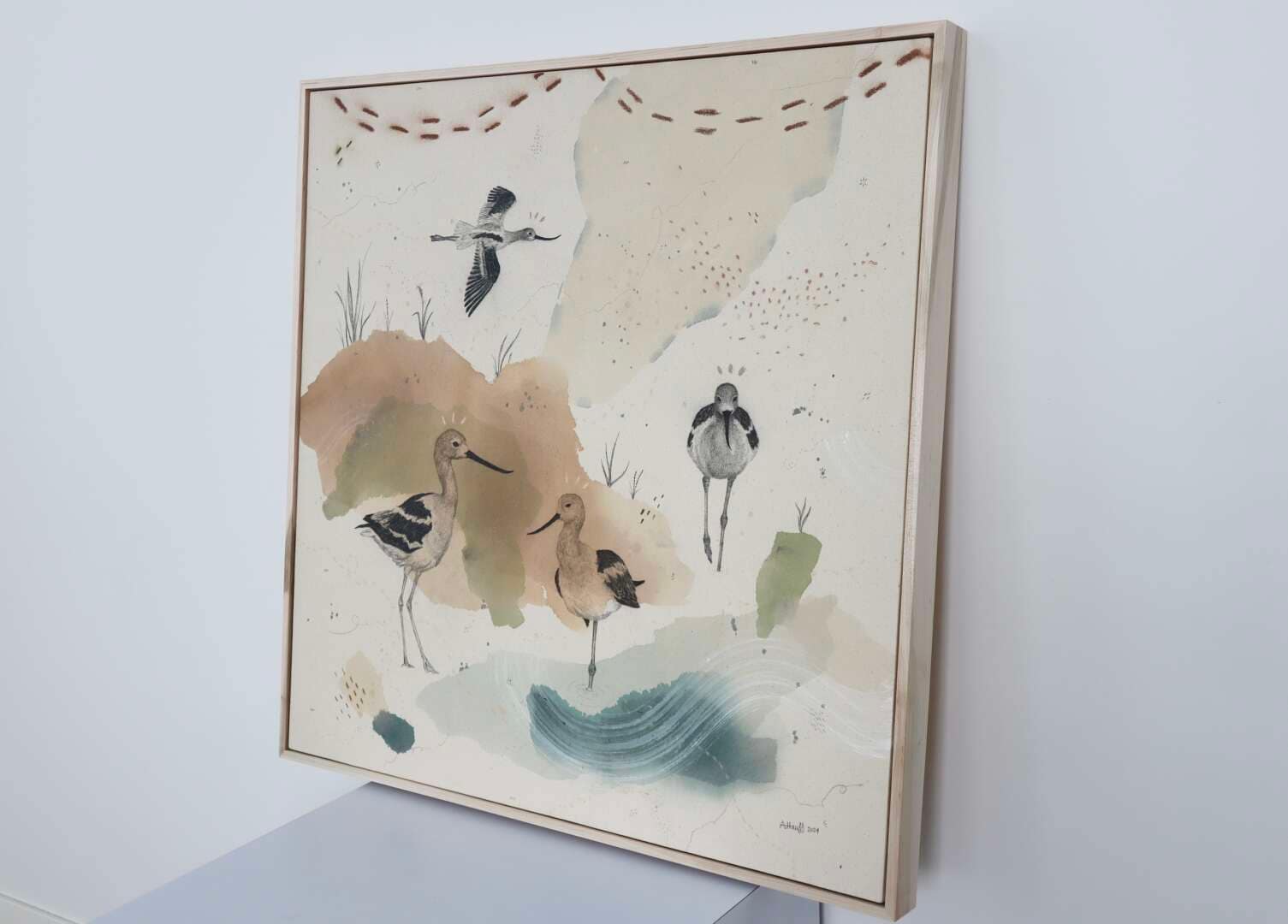 Original mixed media on raw stretched canvas with maple float frame. Alternate hardwood frame available upon request.