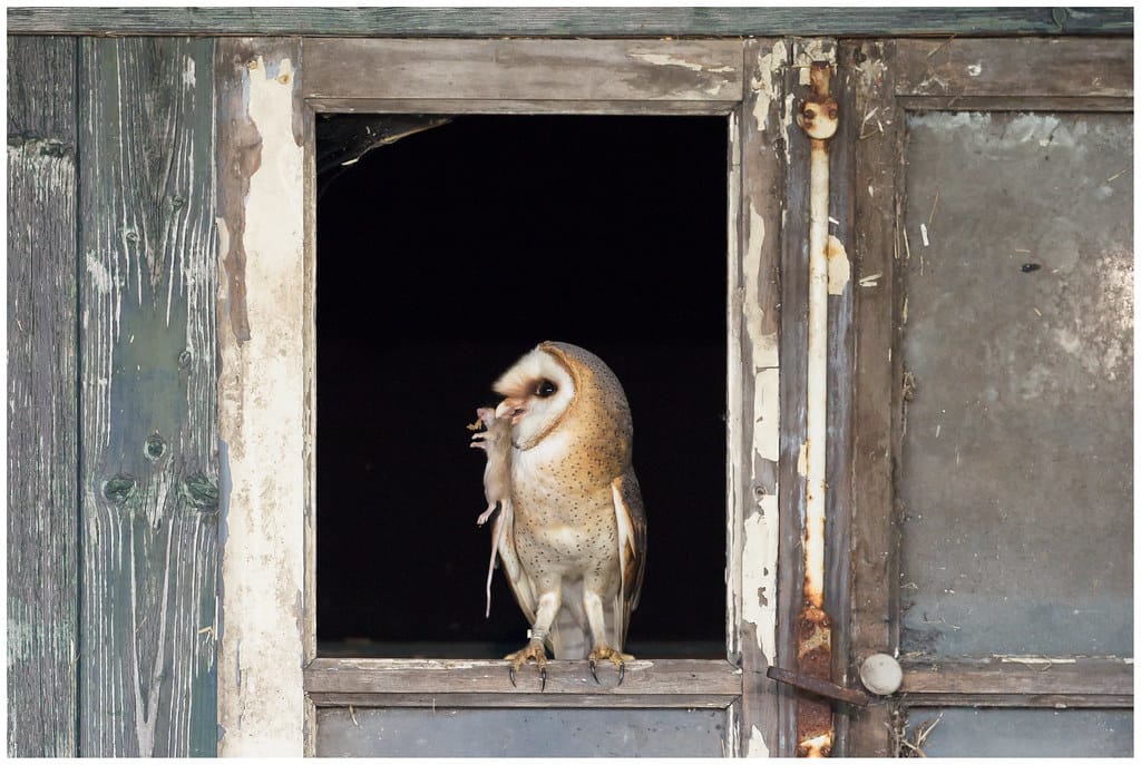 They eat mostly small mammals, particularly rats, mice, voles, lemmings, and other rodents; also shrews, bats, and rabbits. Most of the prey they eat are active at night, so squirrels and chipmunks are relatively safe from these owls. They occasionally eat birds such as starlings, blackbirds, and meadowlarks. Nesting American Barn Owls sometimes store dozens of prey items at the nest site while incubating to feed the young once they hatch. A clutch can range from 2 to 18 eggs, with 1 to 3 broods! That’s a lot of hunting to do.