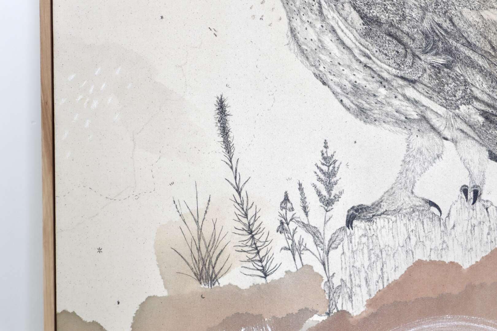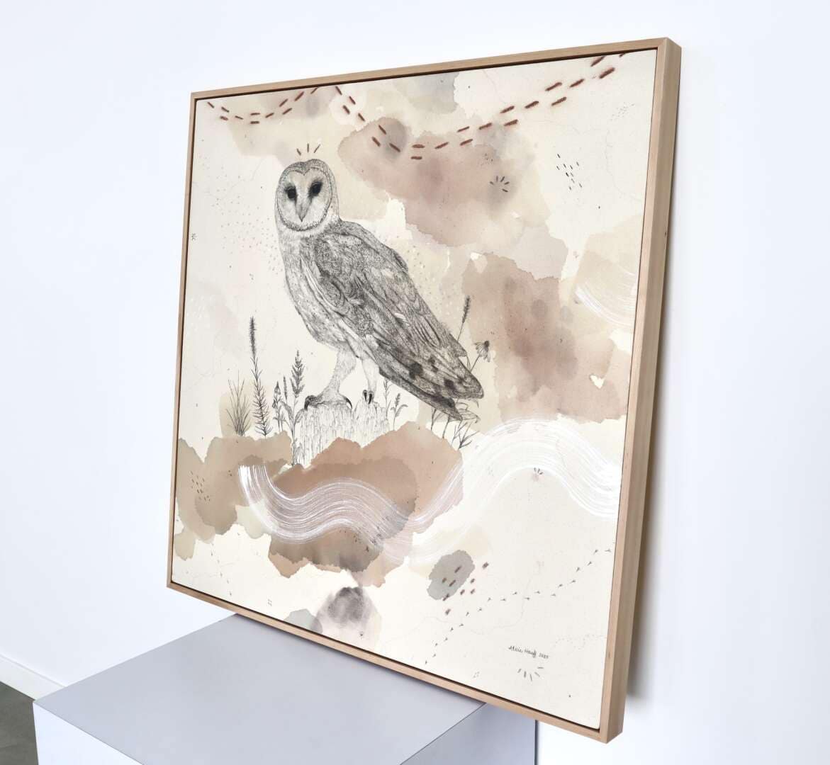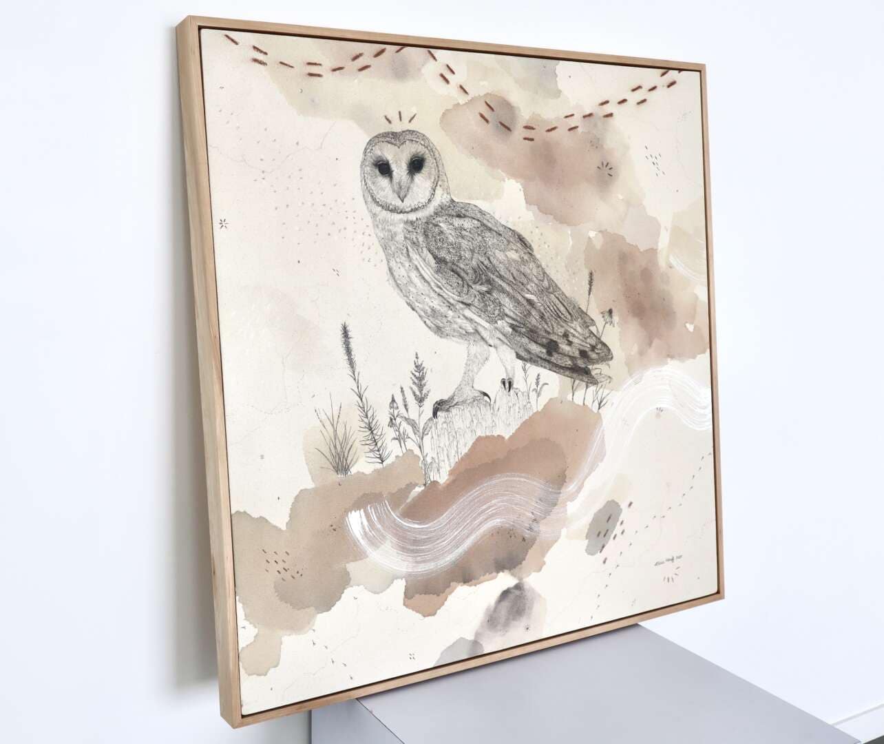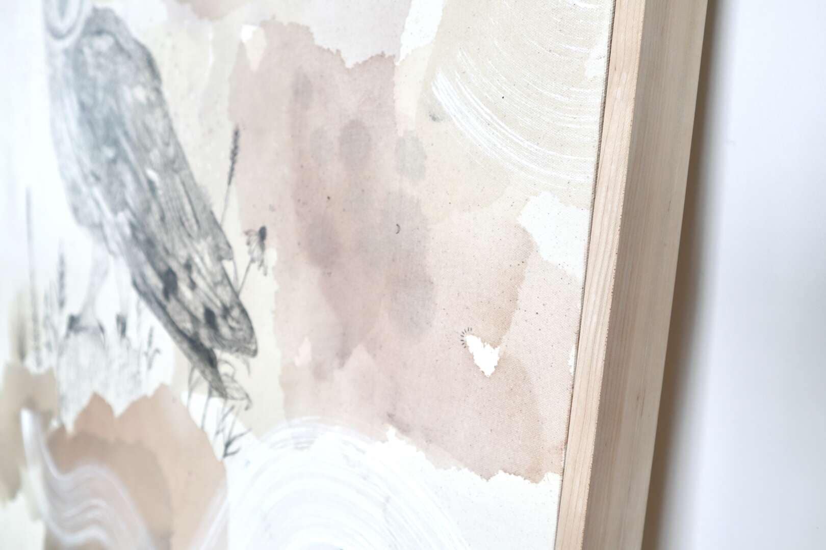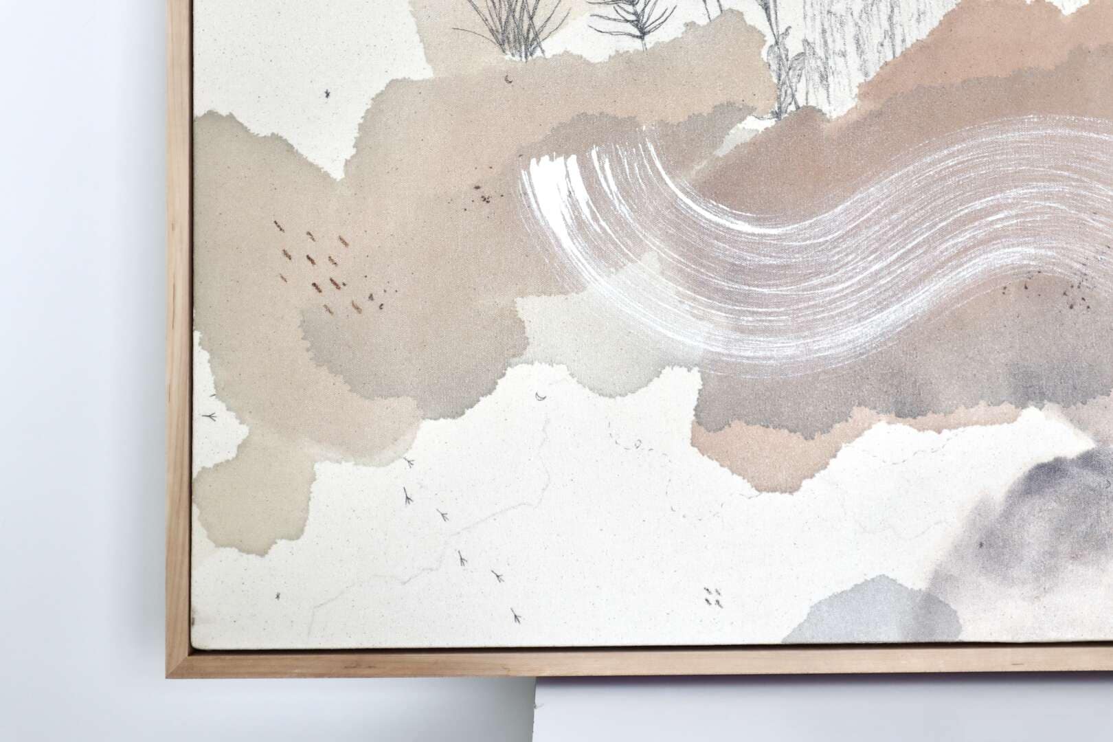 Original mixed media on raw stretched canvas with hard maple float frame.