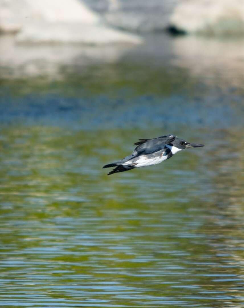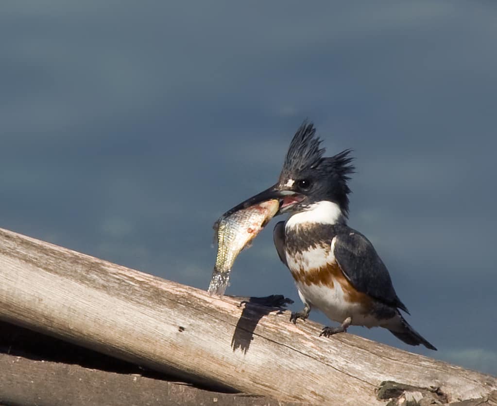 They’re often seen perching along riverbanks and shorelines where the water is clear and there is minimal vegetation. Belted Kingfishers spend most of the year alone until they pair up during the breeding season. Males (and occasionally females) establish territories, which usually conform to the shape of the stream or shoreline. Belted Kingfishers are monogamous in each breeding season but form new pairs yearly. The male feeds the female while courting her. Both members vigorously defend their territory by chasing away intruders while giving loud rattle calls.