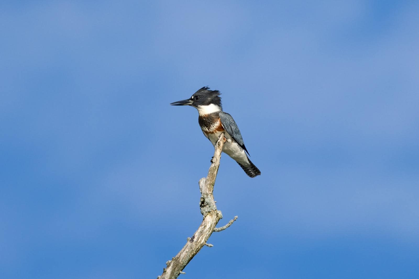 This shorebird will catch your ear right before catching your eye—and his aquatic prey. Belted Kingfishers let you know when you’ve entered their arena with a loud, machine-like rattle that extends their body up and crest forward. You’ll see them eyeing the water carefully for prey, then diving quickly with their large bills ready to catch. Males and females have a ragged crest and powder blue-gray coloration. Males have a blue band across their white chests, and females have both a blue and a coppery chest band.