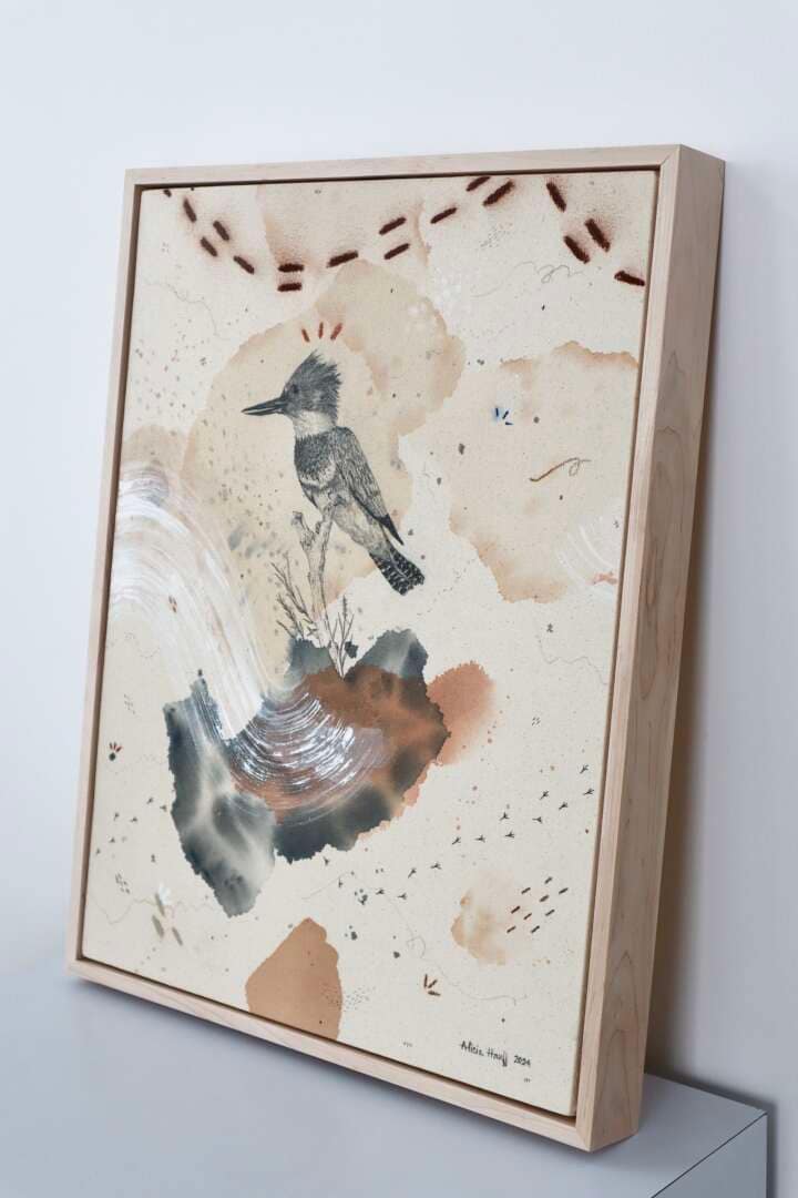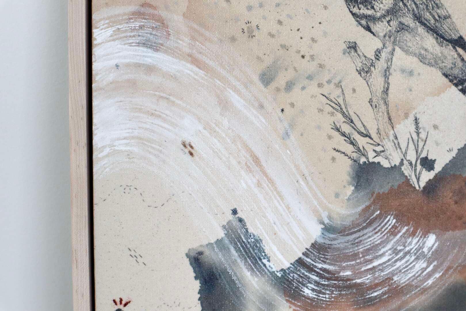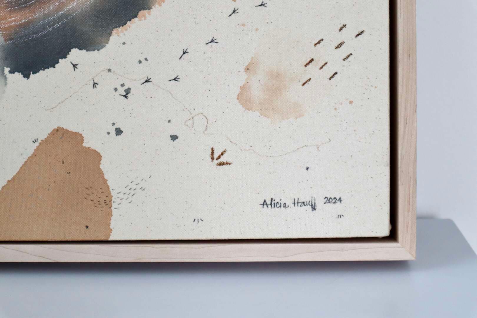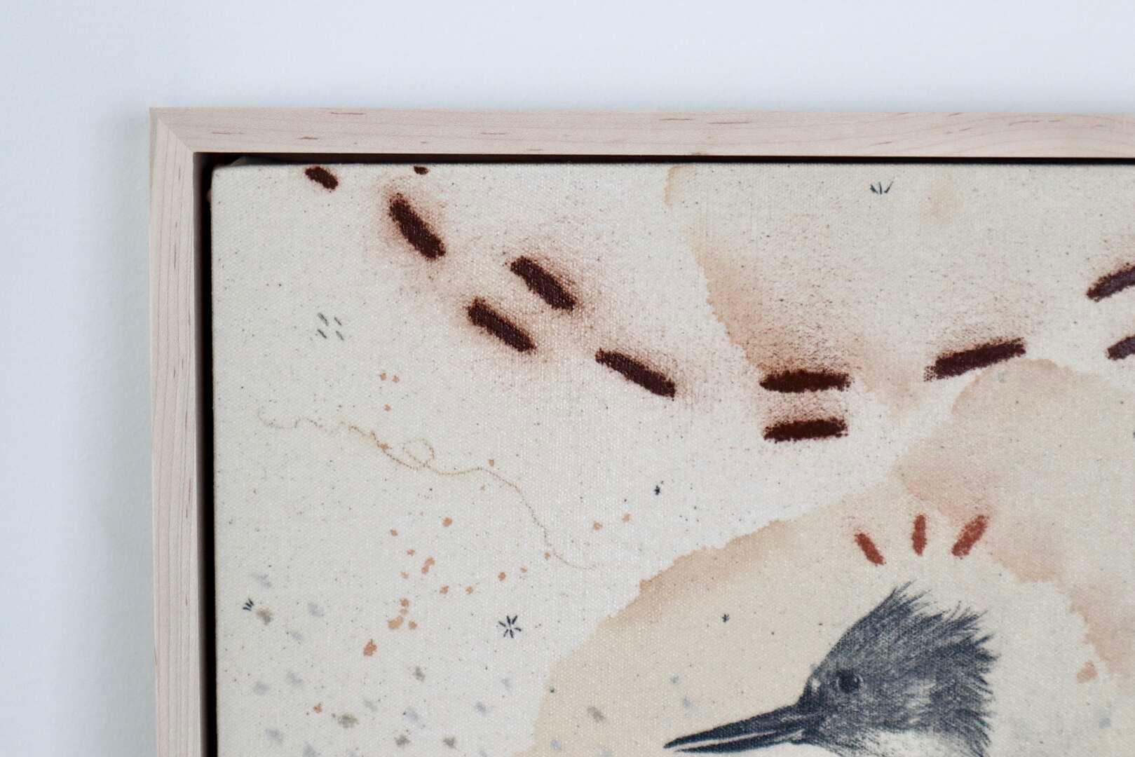Original mixed media on raw stretched canvas with maple float frame.