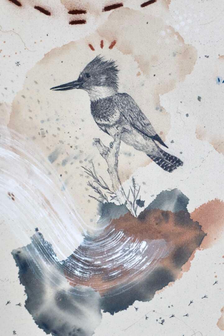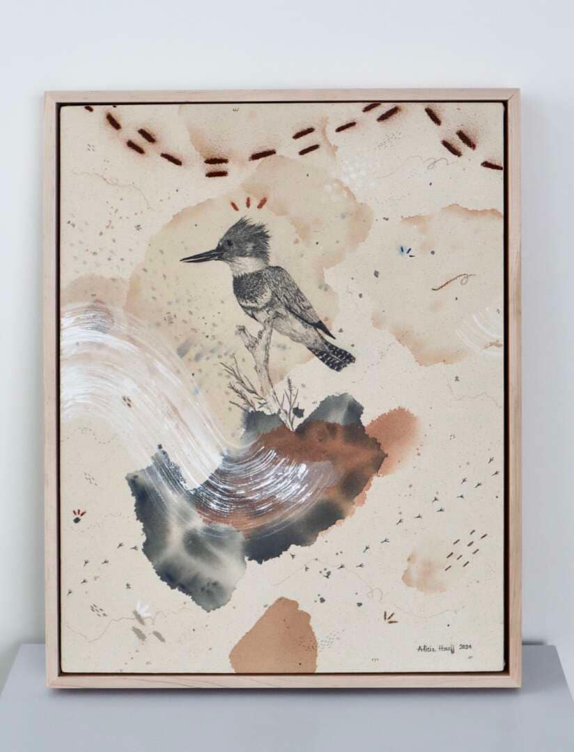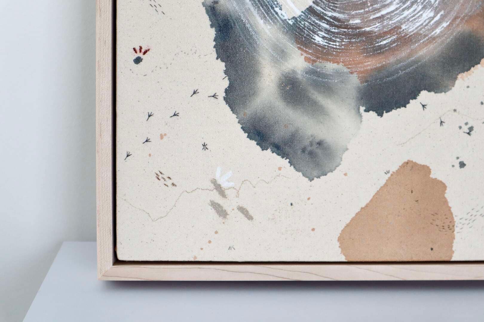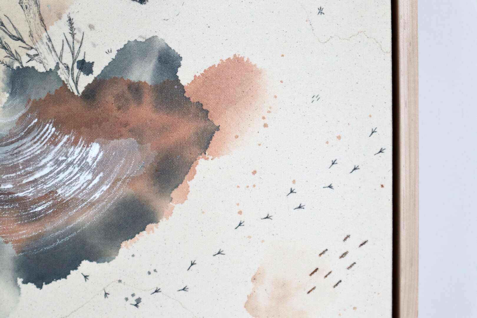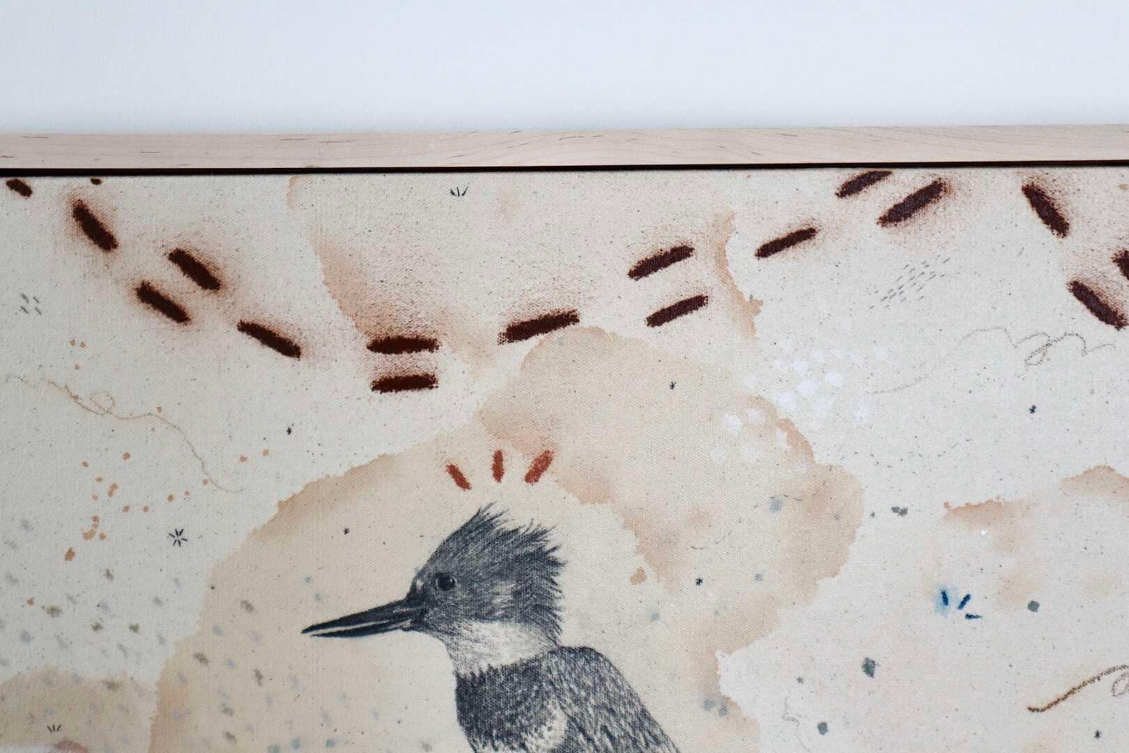 Original mixed media on raw stretched canvas with maple float frame.