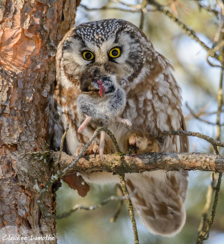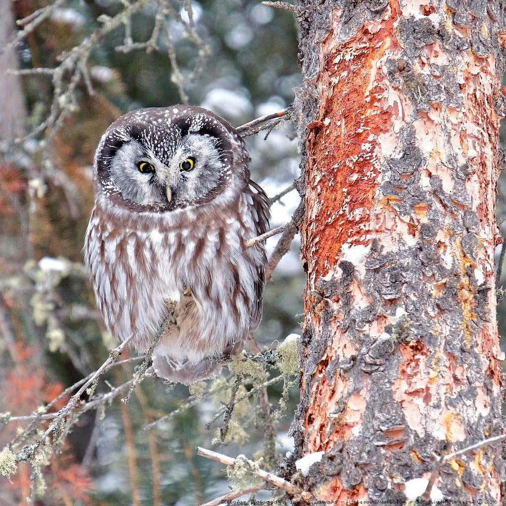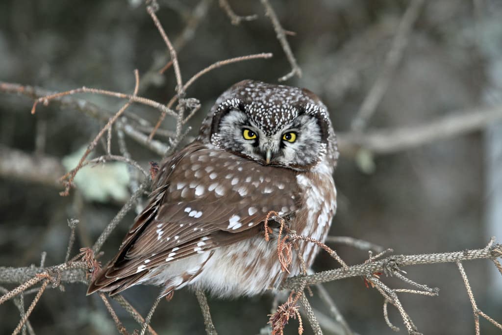 This smaller owl is like a cross between the Northern Hawk and Northern Saw-Whet owls, with a square, black-rimmed pale face and yellow bill. Their calls are a series of trilling toots, often the only way to find this owl in stands of thick conifers in the cold northern latitudes. Boreal Owls eat small mammals, birds, and insects. They hunt at night, except in the far north, where the sun doesn’t set in the summer. From hunting perches, they sit and wait for prey before attacking it with their talons. Like other owls, they cough up pellets of indigestible bones and fur, usually once a day. They roost in a different tree every day. Though nonmigratory, they may be seen further south of their range when food is scarce on their breeding grounds.