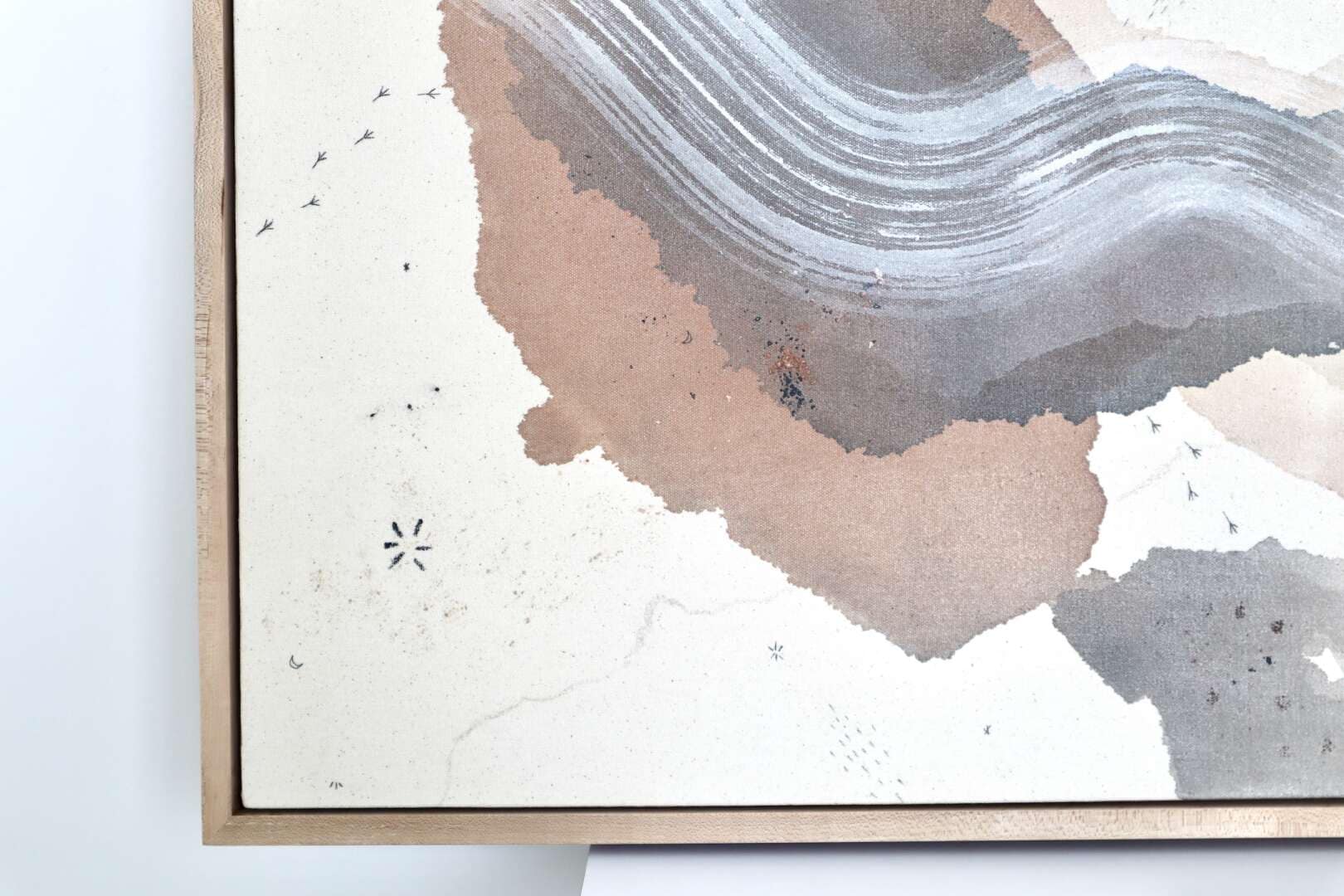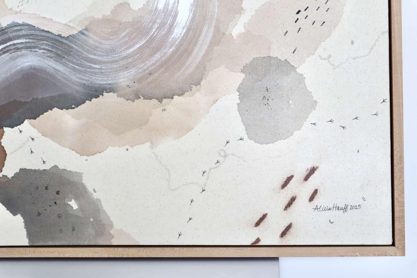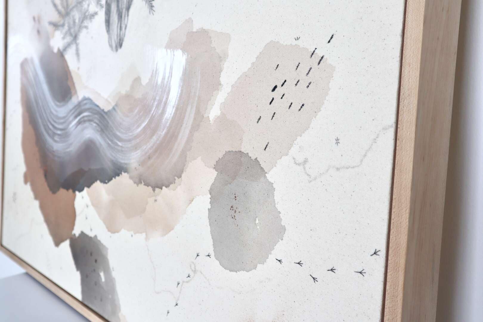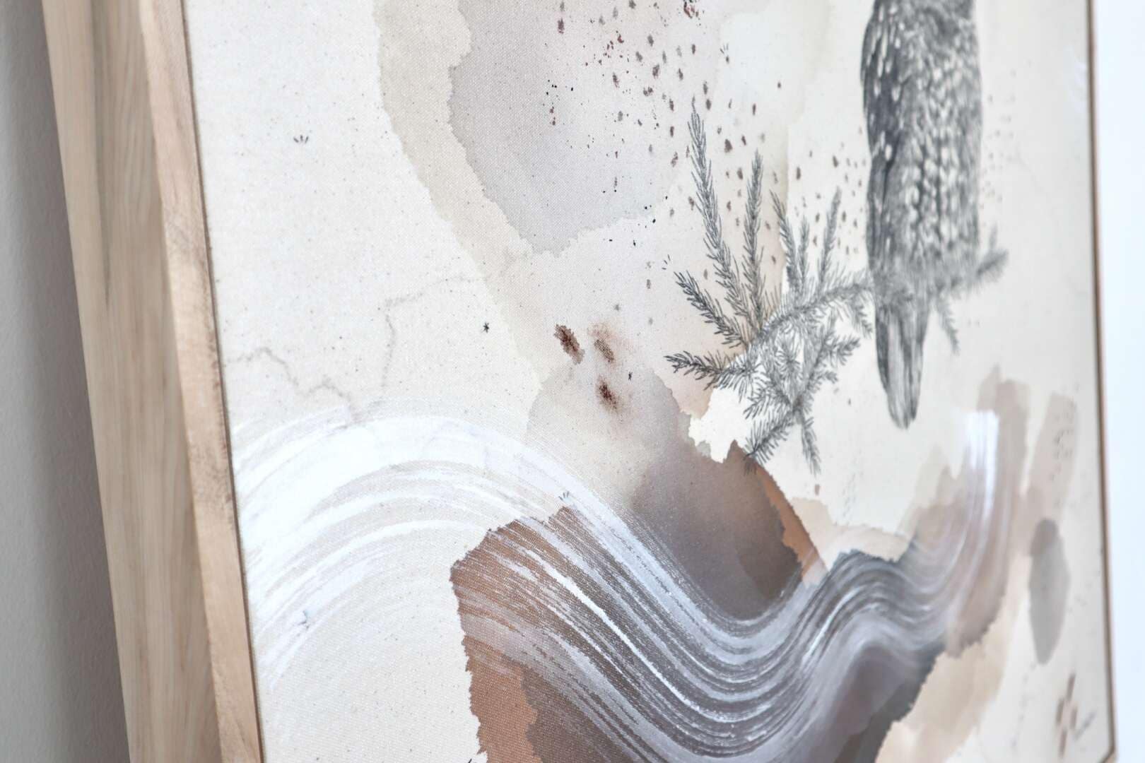 Original mixed media on raw stretched canvas with hard maple float frame.