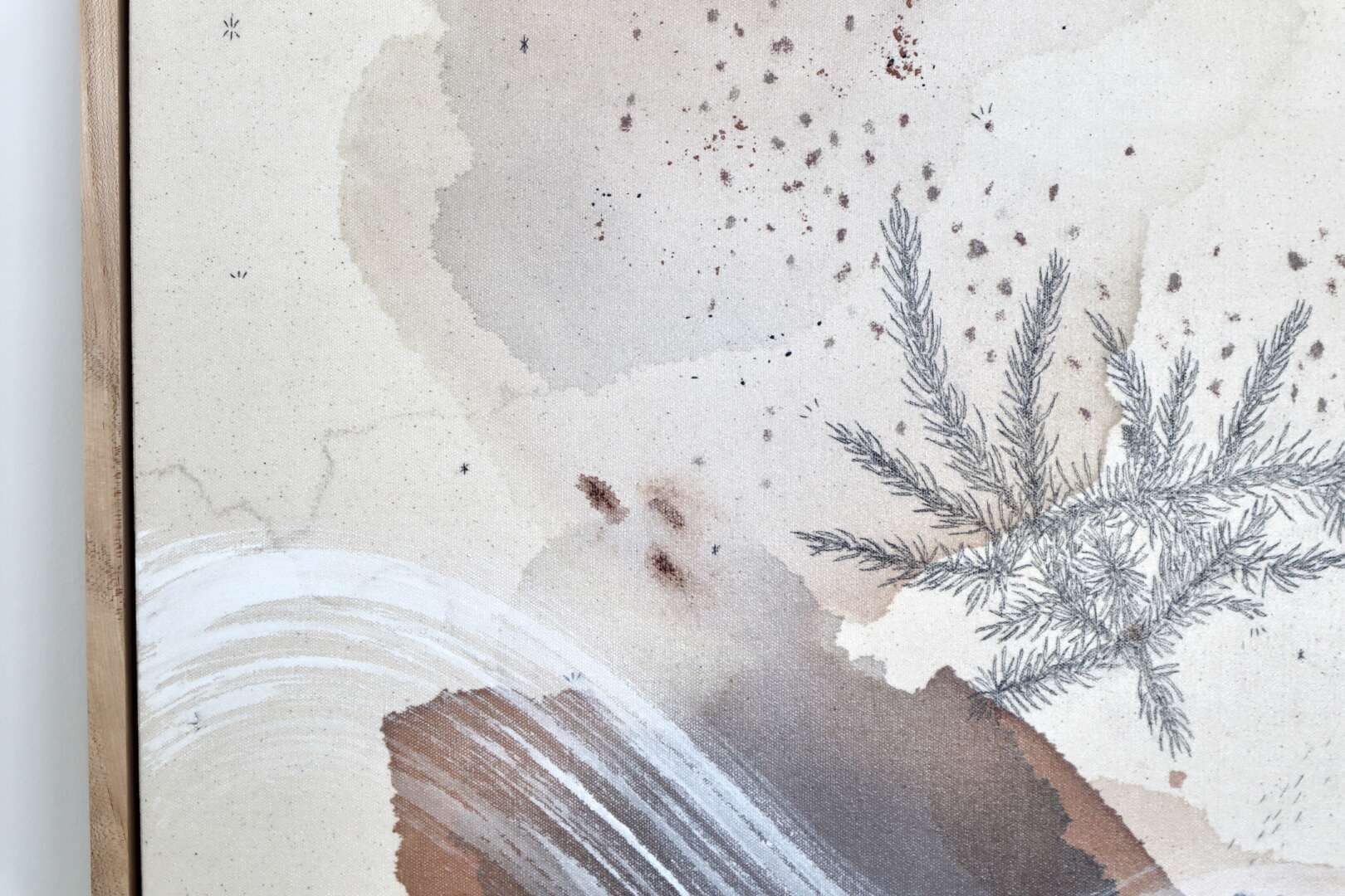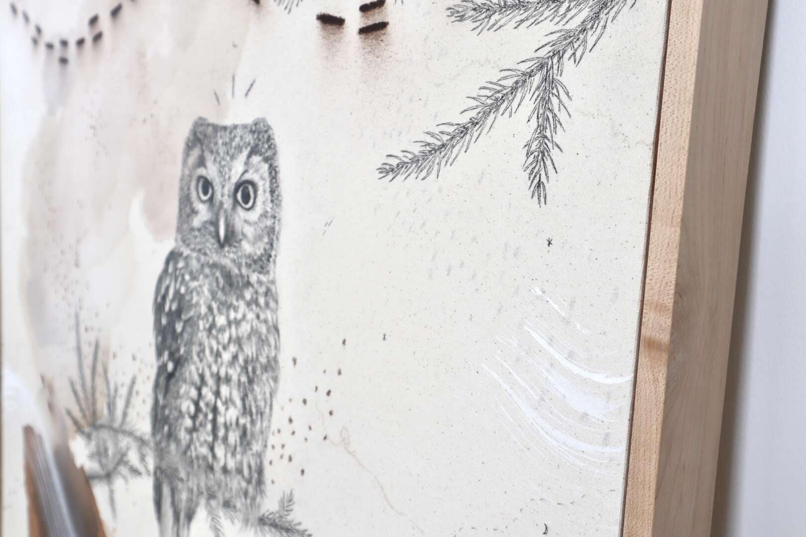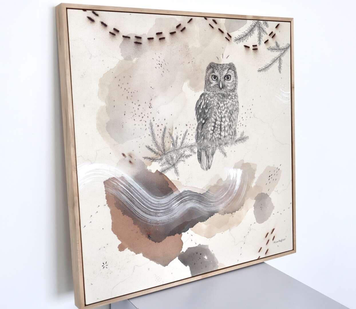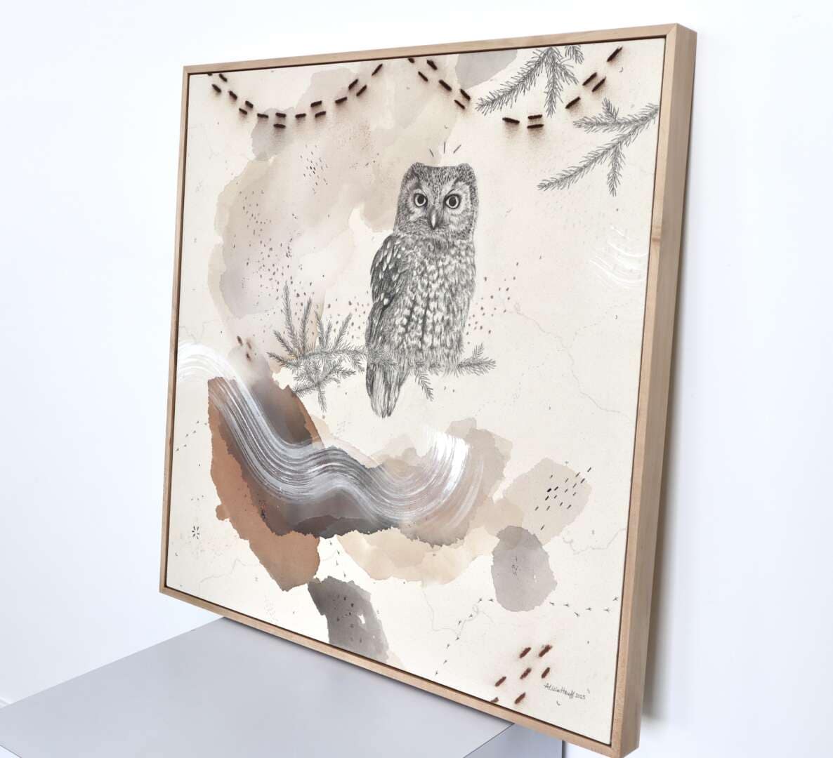 Original mixed media on raw stretched canvas with hard maple float frame.
