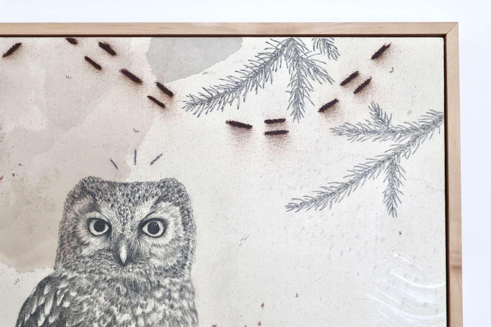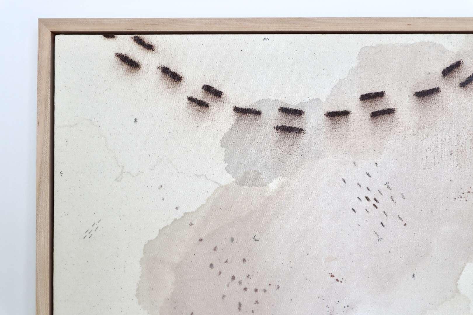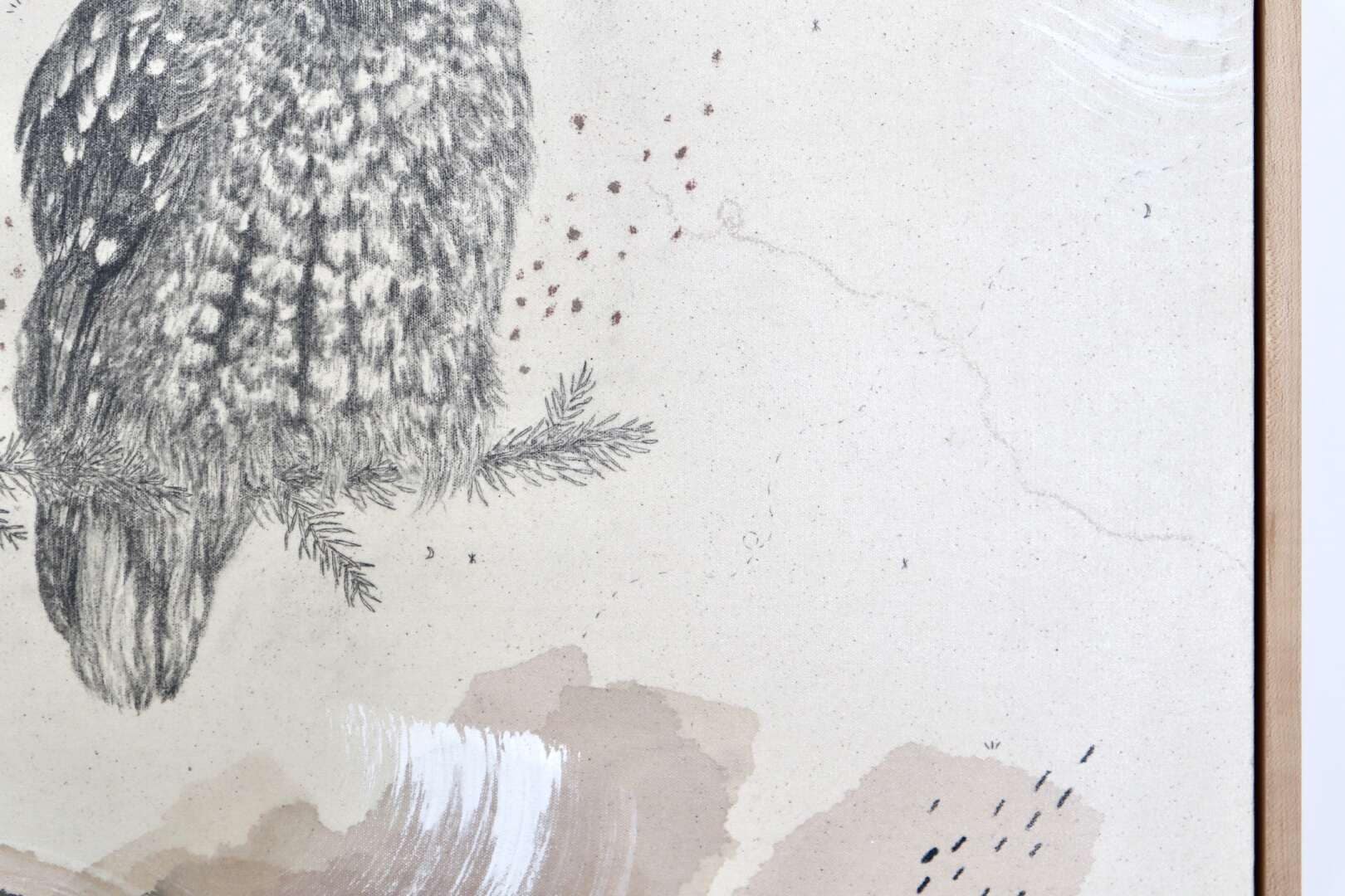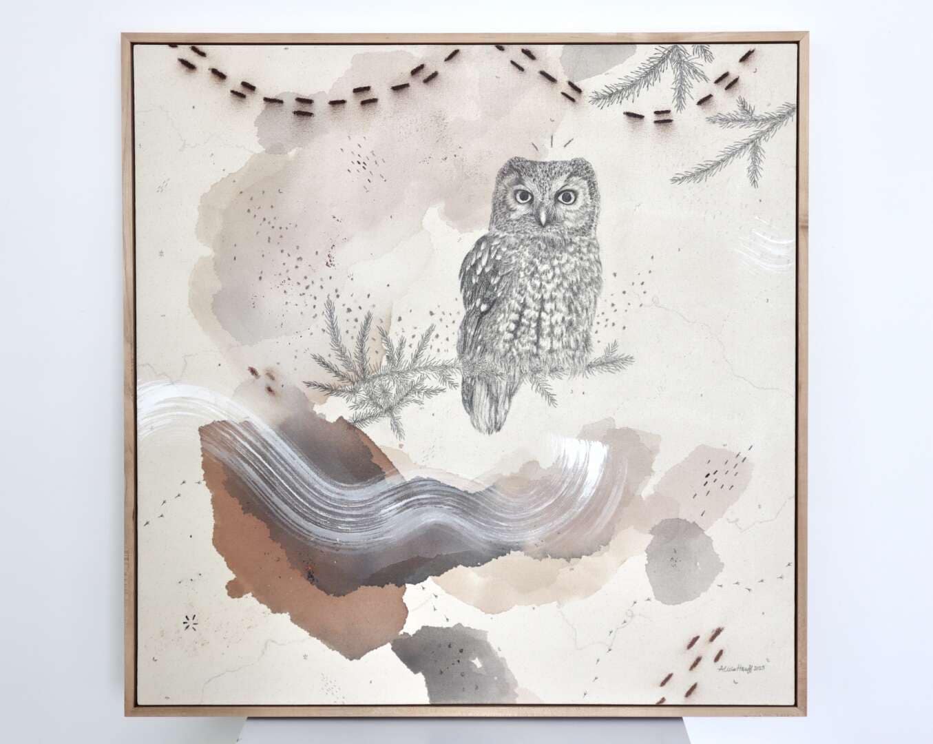 Original mixed media on raw stretched canvas with hard maple float frame.