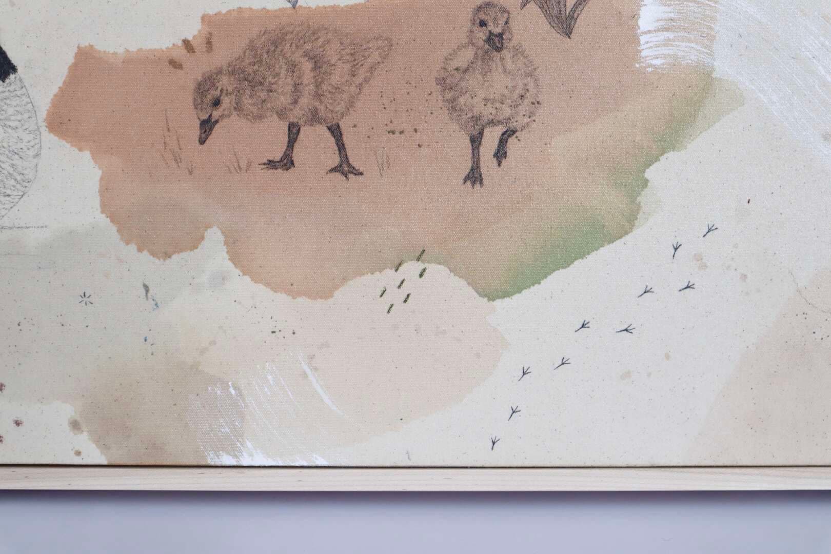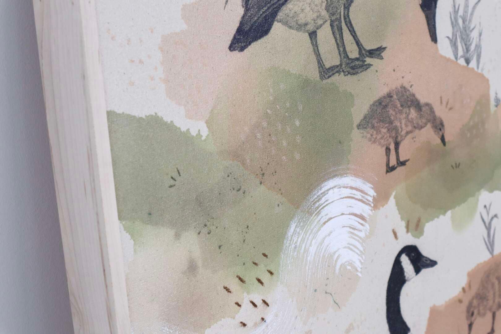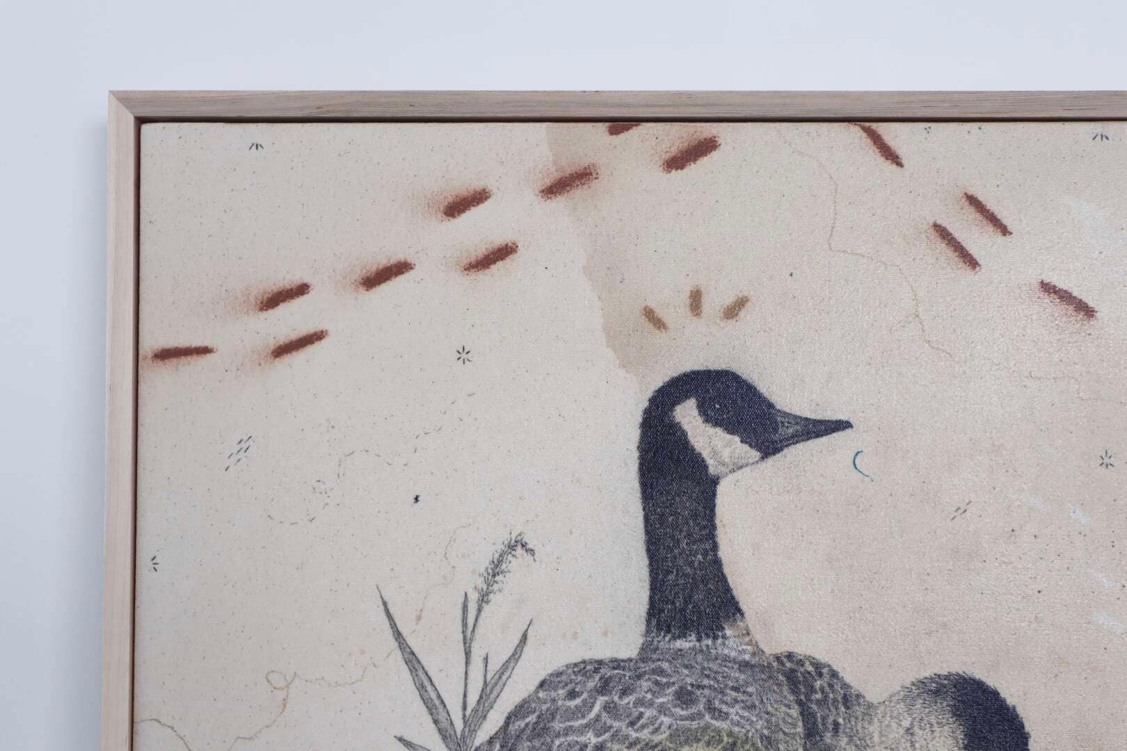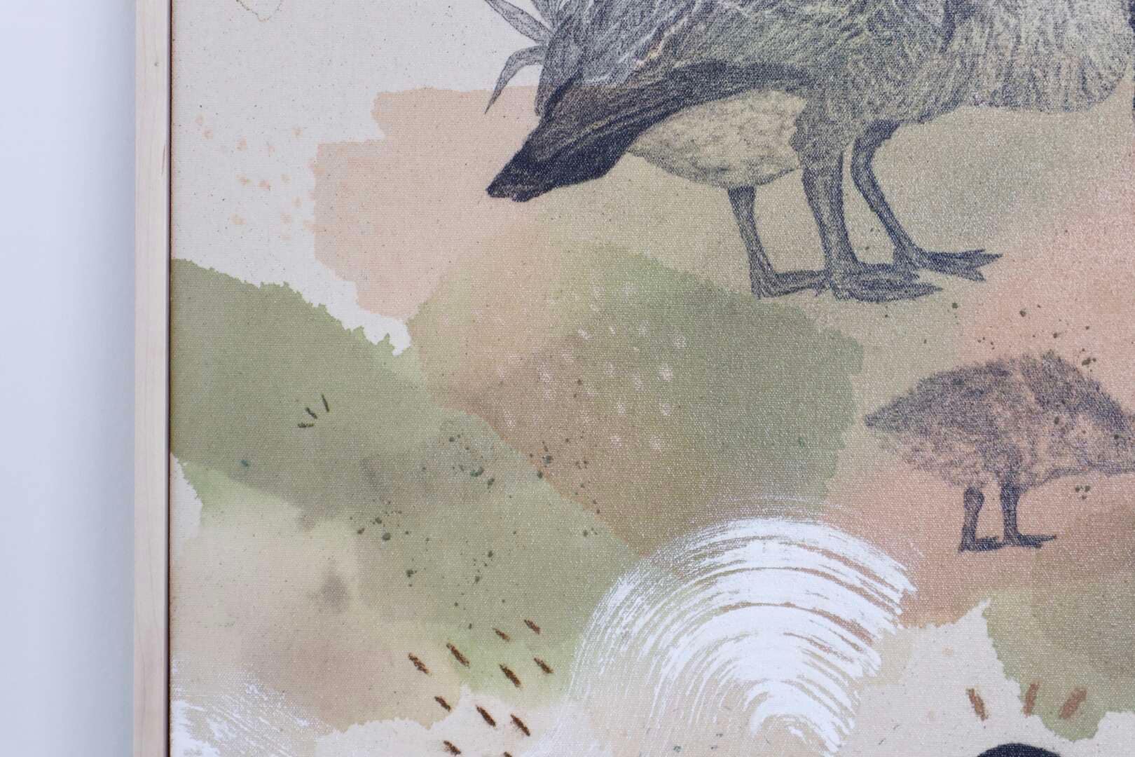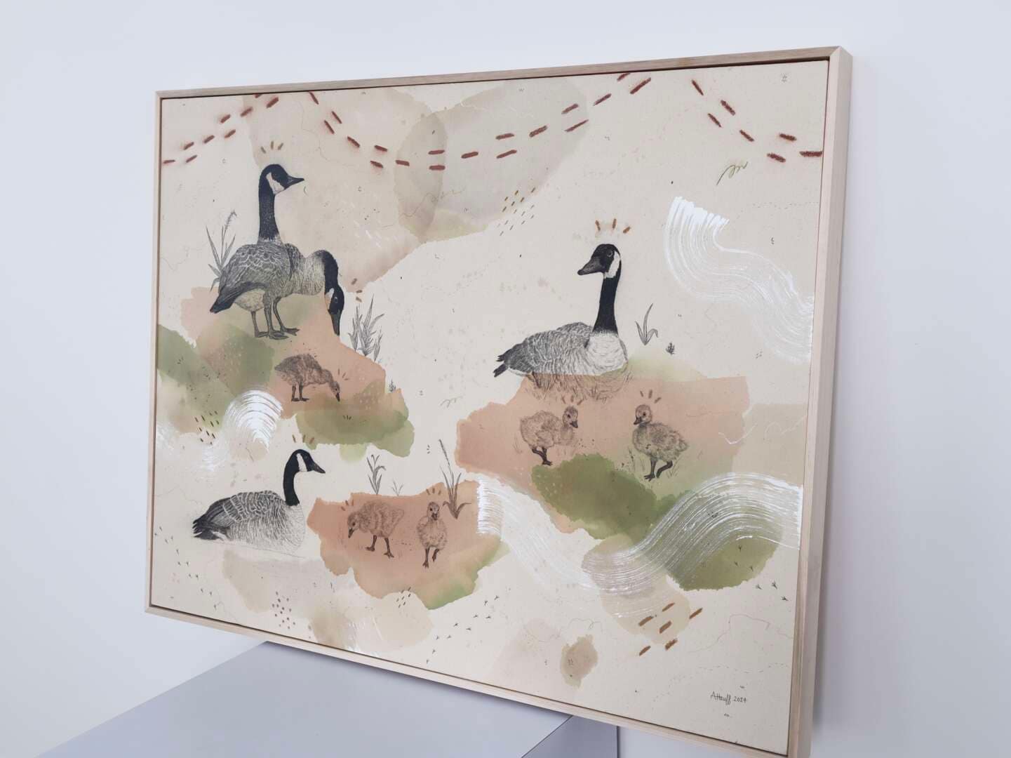 Original mixed media on raw stretched canvas with maple float frame. Alternative hardwood frames available upon request.