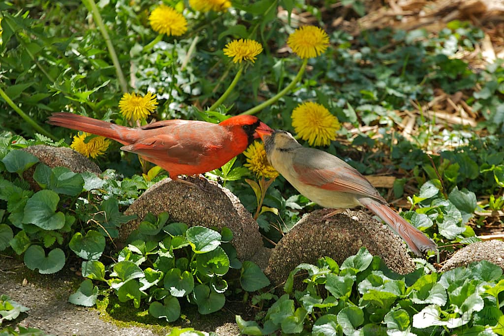 Pairs will visit possible nest sites together, calling back and forth while carrying nesting material. She does most of the work to build a nest in a tree or shrub; he will bring her food while she incubates. She is also among the few female songbirds that will sing, even while she is nesting. Both males and females tend to their young and stay with them as a family after they have fledged. Both fiercely defend their territory, even confusing their reflection for an intruder!