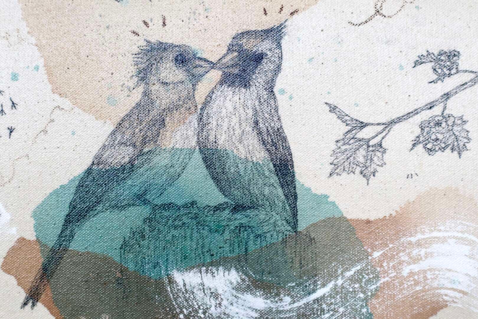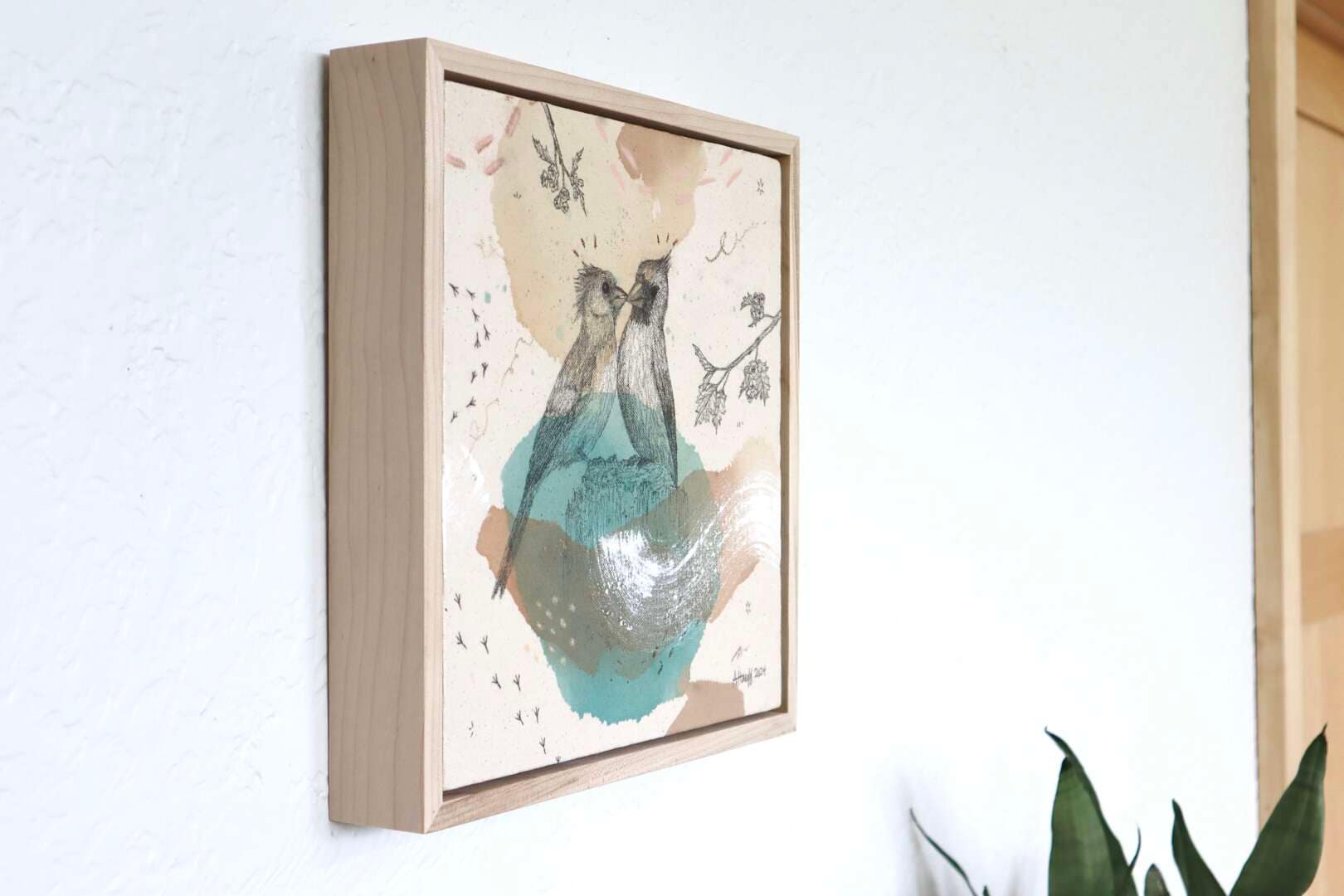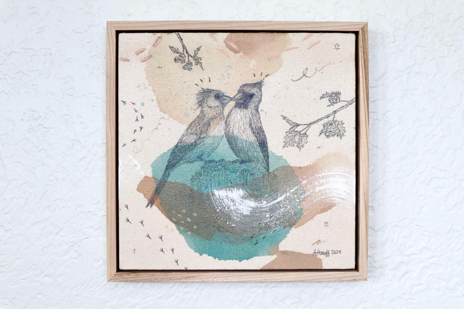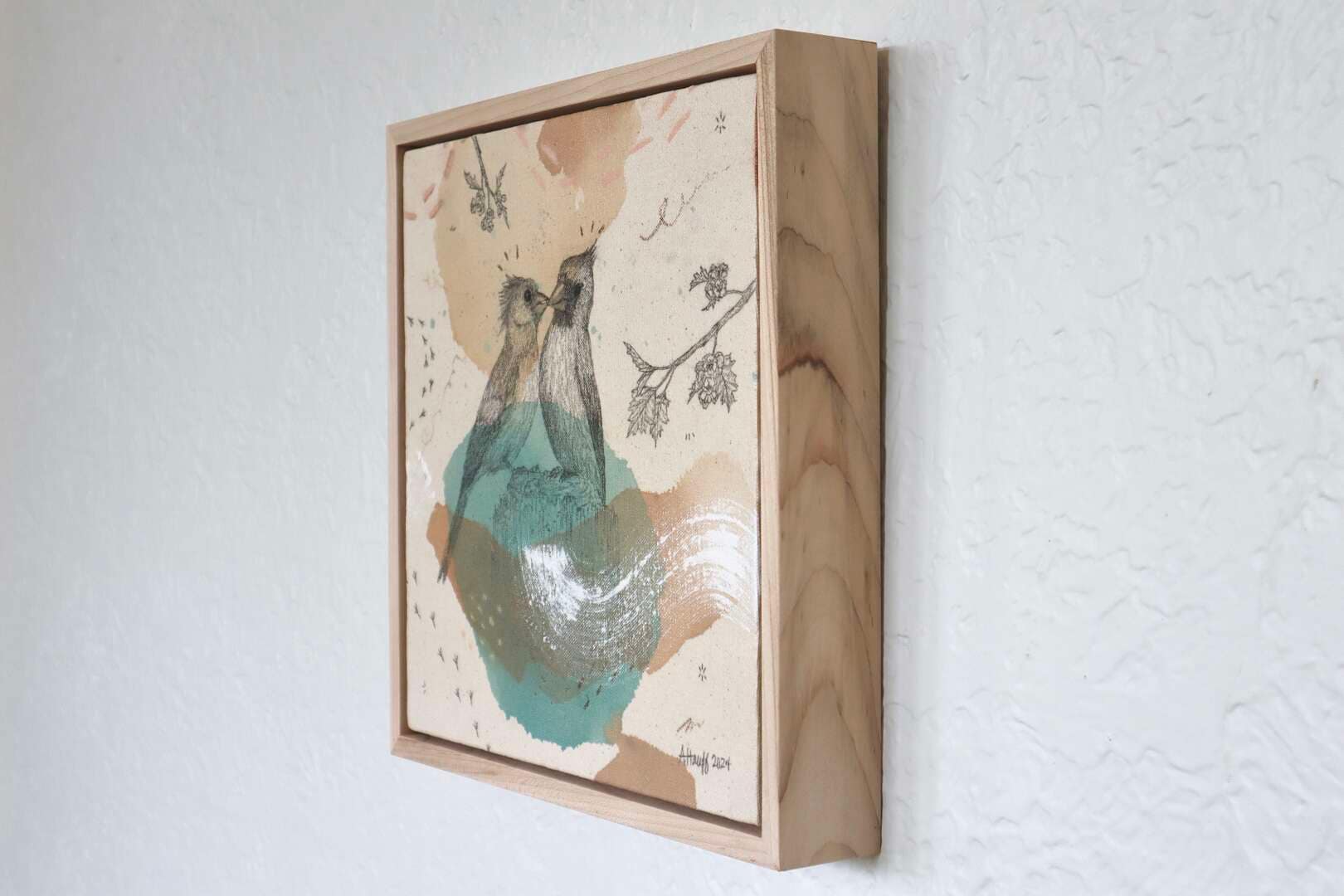 Original mixed media on raw stretched canvas with maple float frame.
