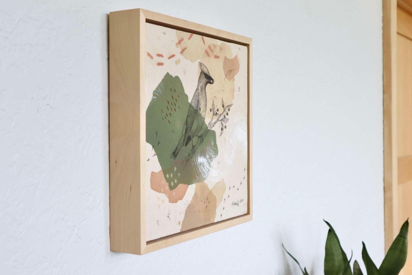 Original mixed media on raw stretched canvas with maple float frame.