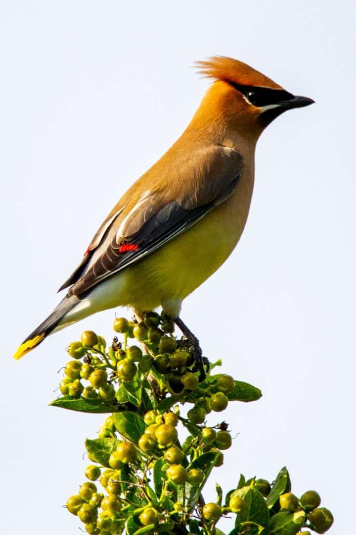 These strikingly beautiful birds are native to the US and live year-round in the upper contiguous states. Their name comes from their appetite for cedar berries in winter and ‘waxy’ red tips of some birds’ secondary wings. They have a silky, smooth appearance with a tan and grey body, black mask, and lemon-yellow lower belly and tail tip. This is another bird that sports a crest.