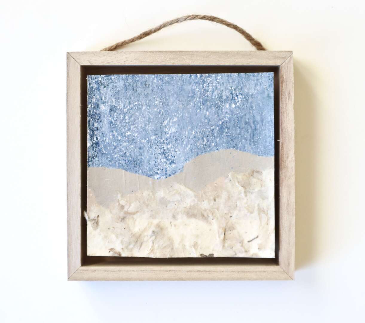 This ornament features handmade collage papers inspired by the prairie landscape’s seasons and times of day. I created the thinner collage paper by hand and used textured handmade papers by other artisans. Each 4×4 inch collage sits on a wood cradle inside the 5×5 inch shadow frame. Jute twine and a small alligator clip are attached for hanging options. Wood stamped on the back. Comes with a storage box.