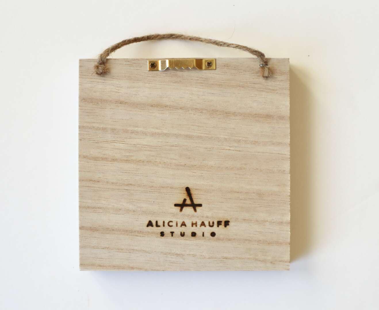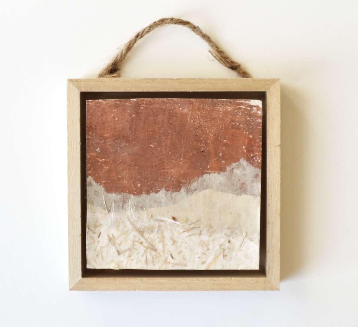 This ornament features handmade collage papers inspired by the prairie landscape’s seasons and times of day. I created the thinner collage paper by hand and used textured handmade papers by other artisans. Each 4×4 inch collage sits on a wood cradle inside the 5×5 inch shadow frame. Jute twine and a small alligator clip are attached for hanging options. Wood stamped on the back. Comes with a storage box.