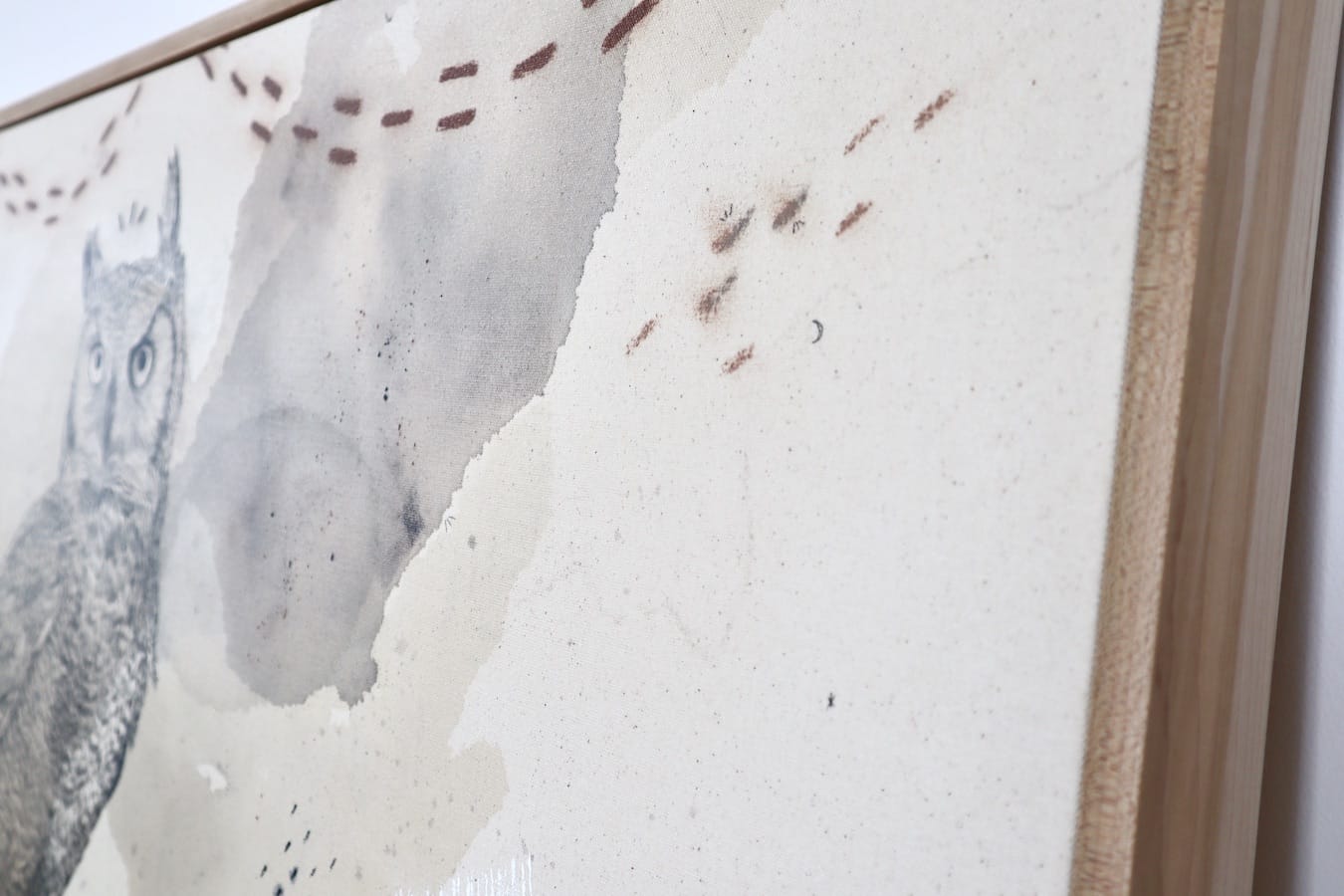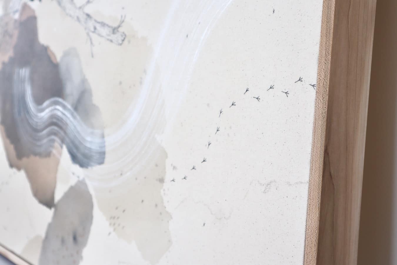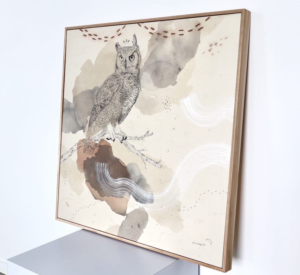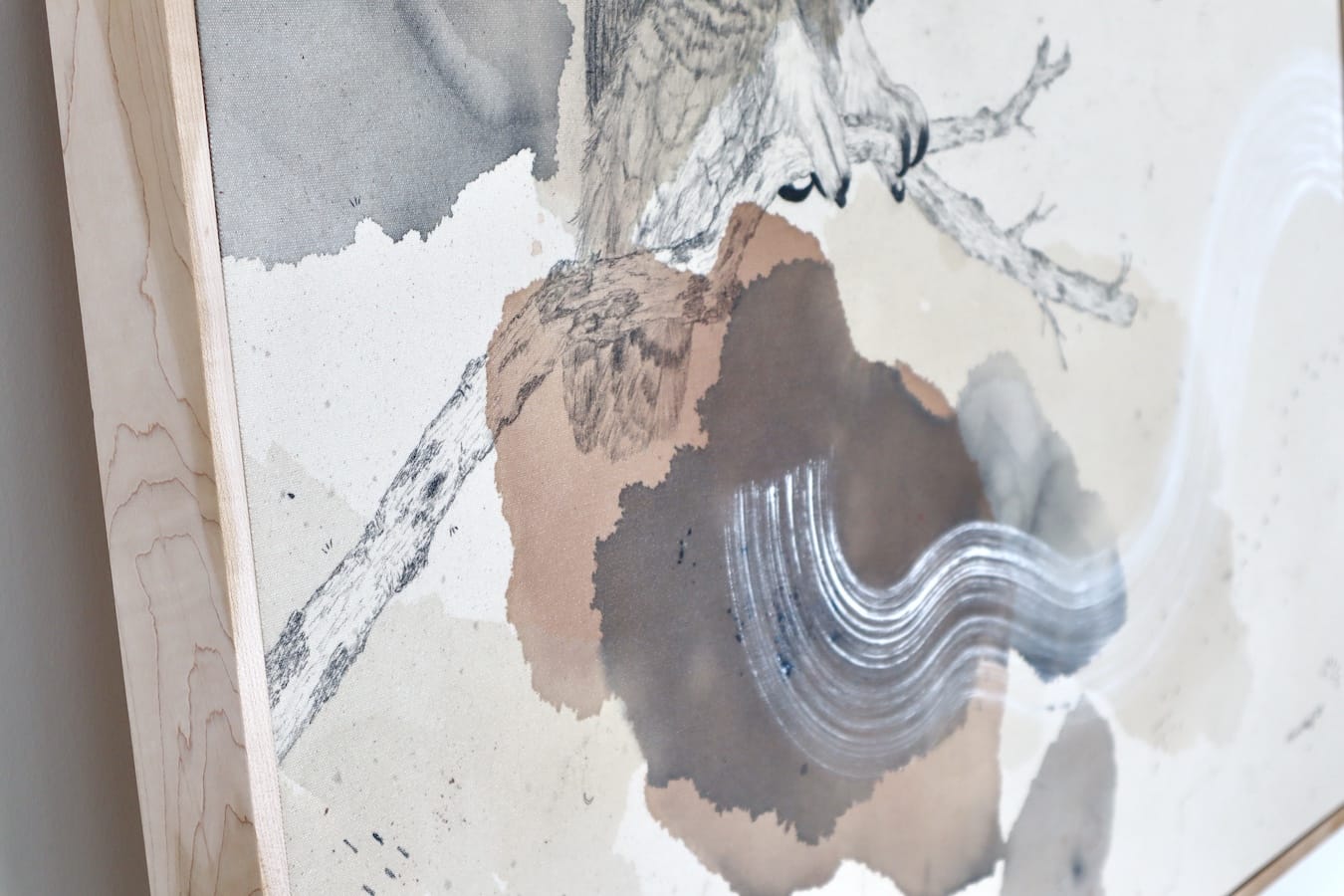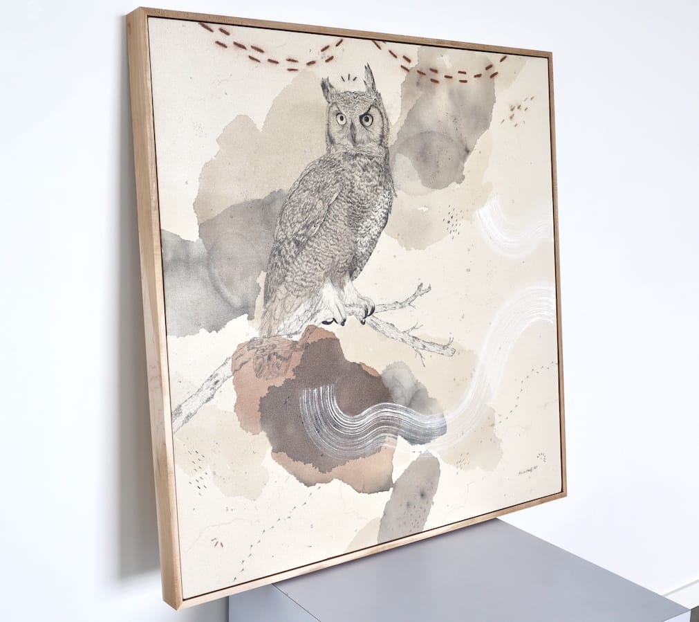 Original mixed media on raw stretched canvas with hard maple float frame.