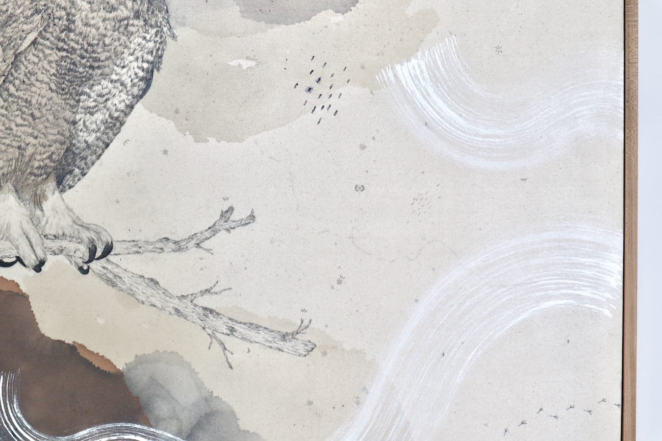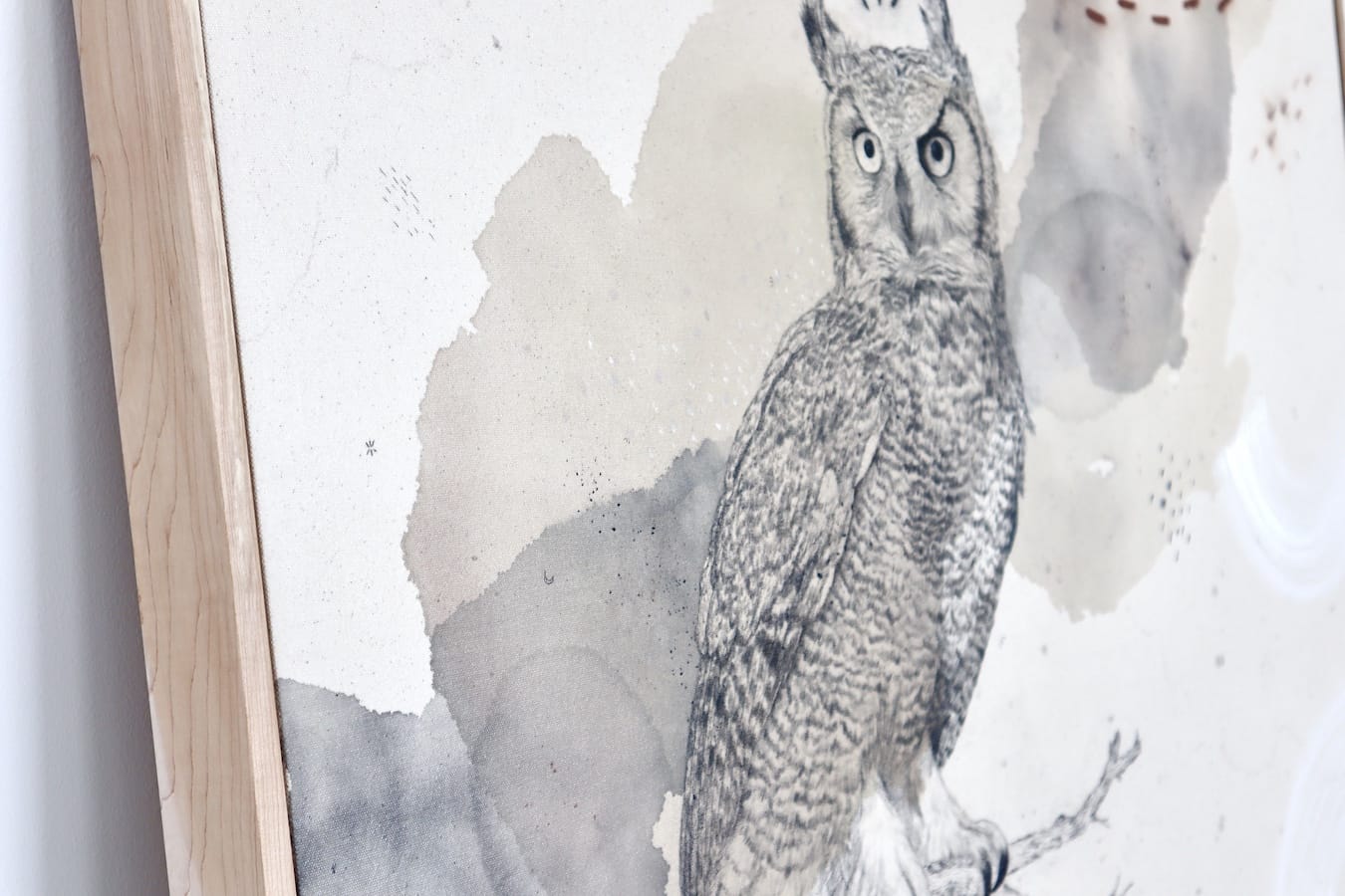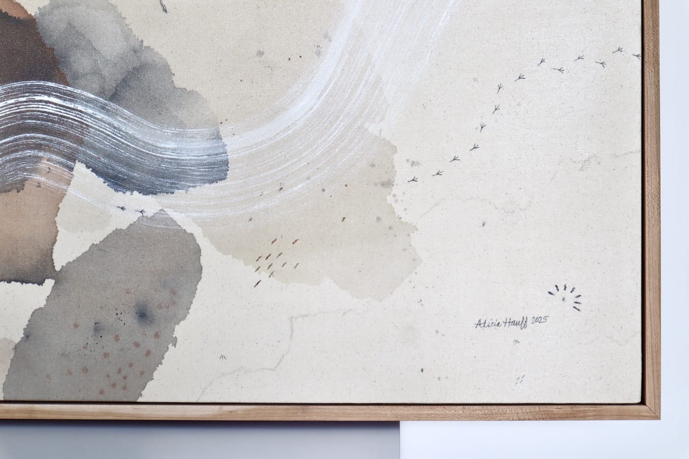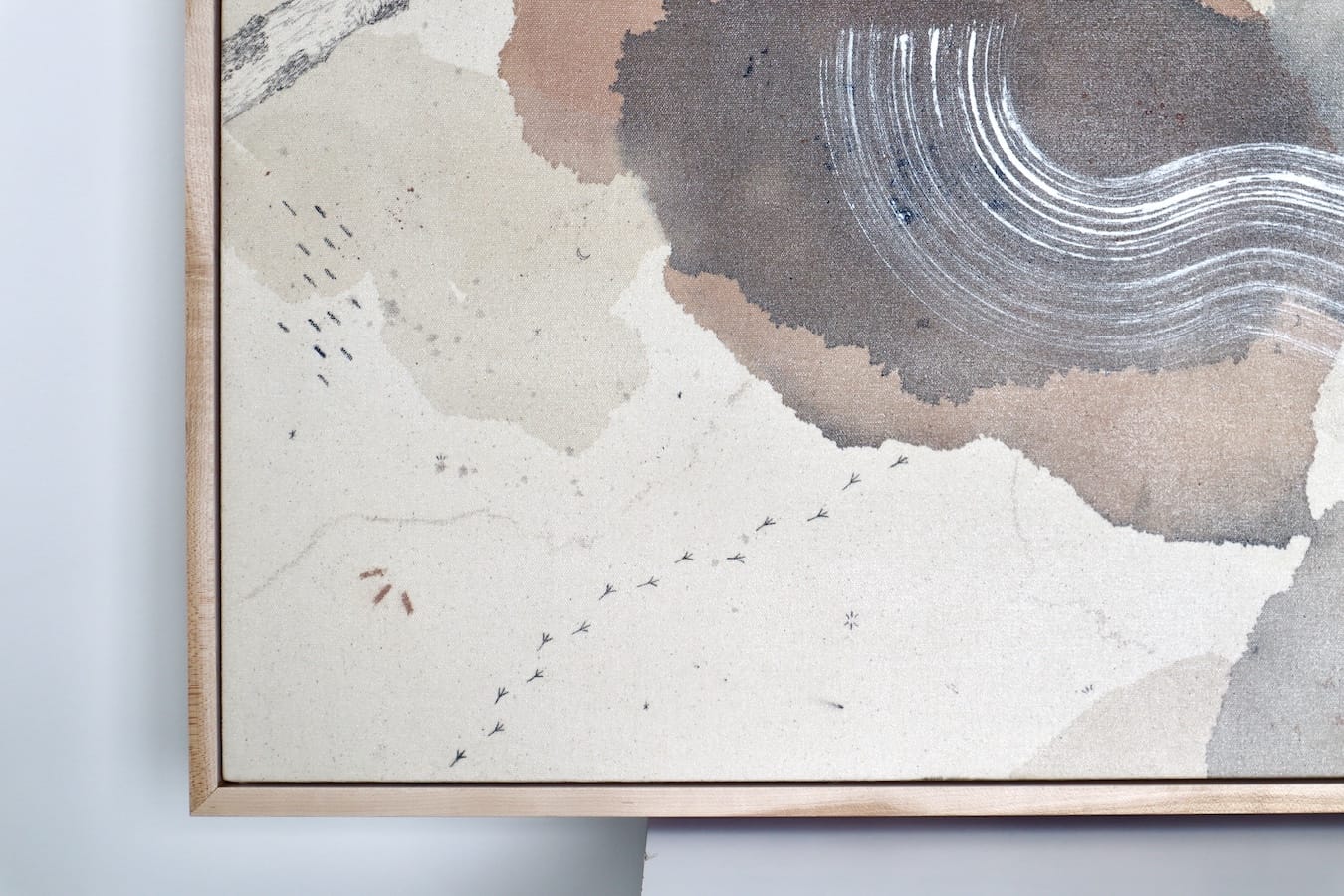 Original mixed media on raw stretched canvas with hard maple float frame.