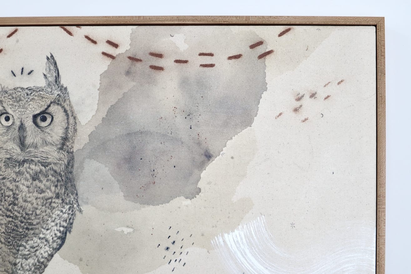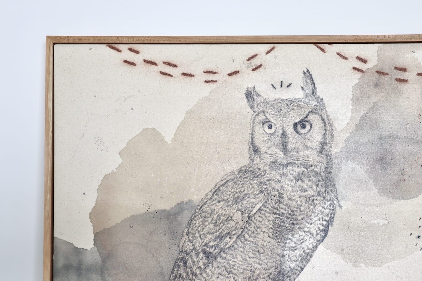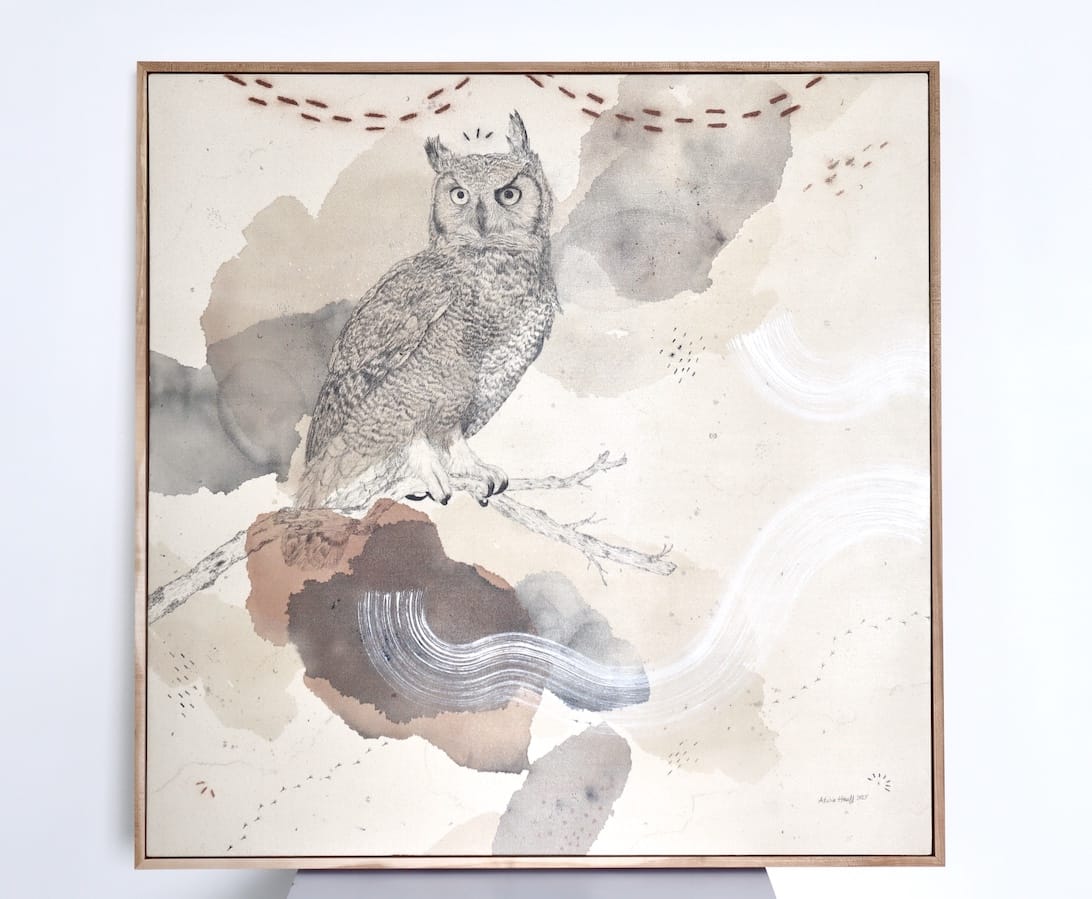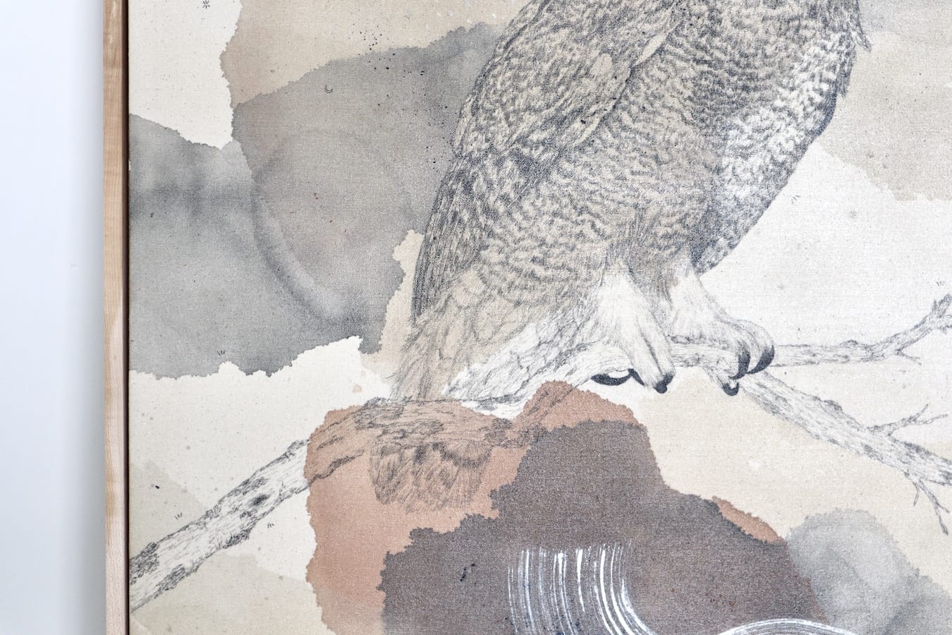 Original mixed media on raw stretched canvas with hard maple float frame.