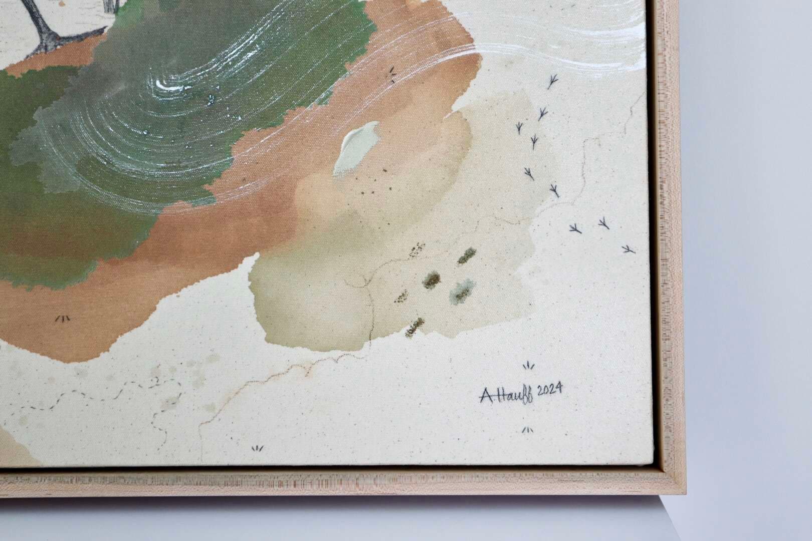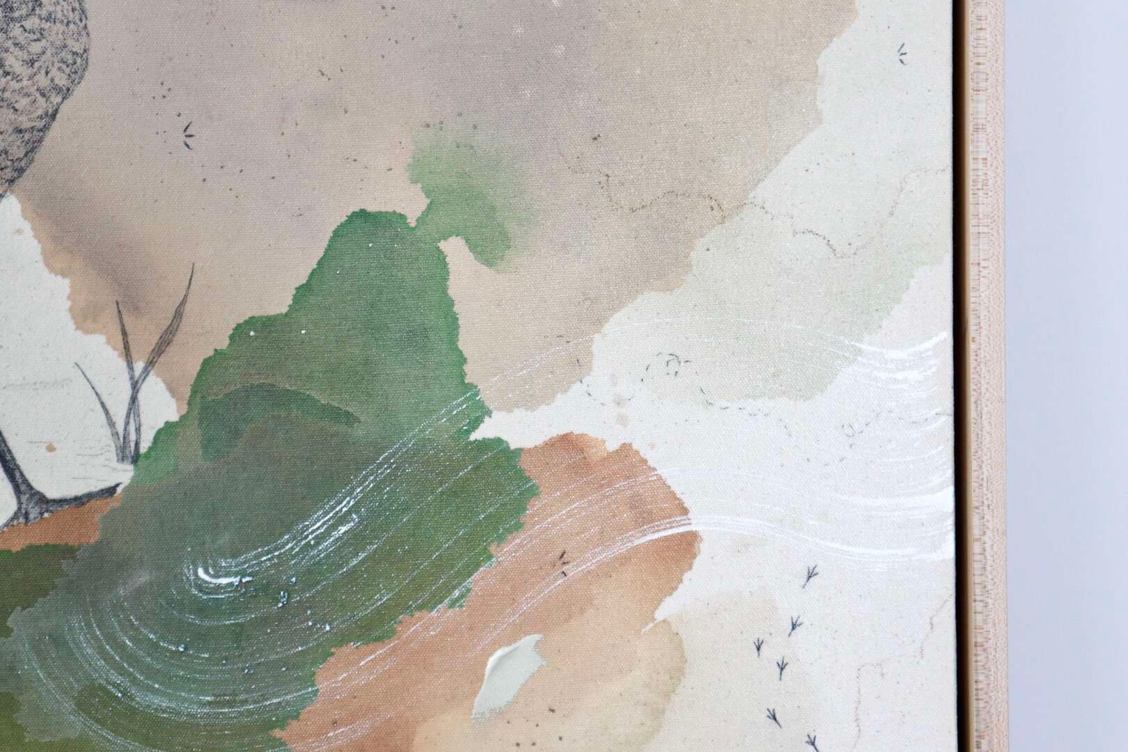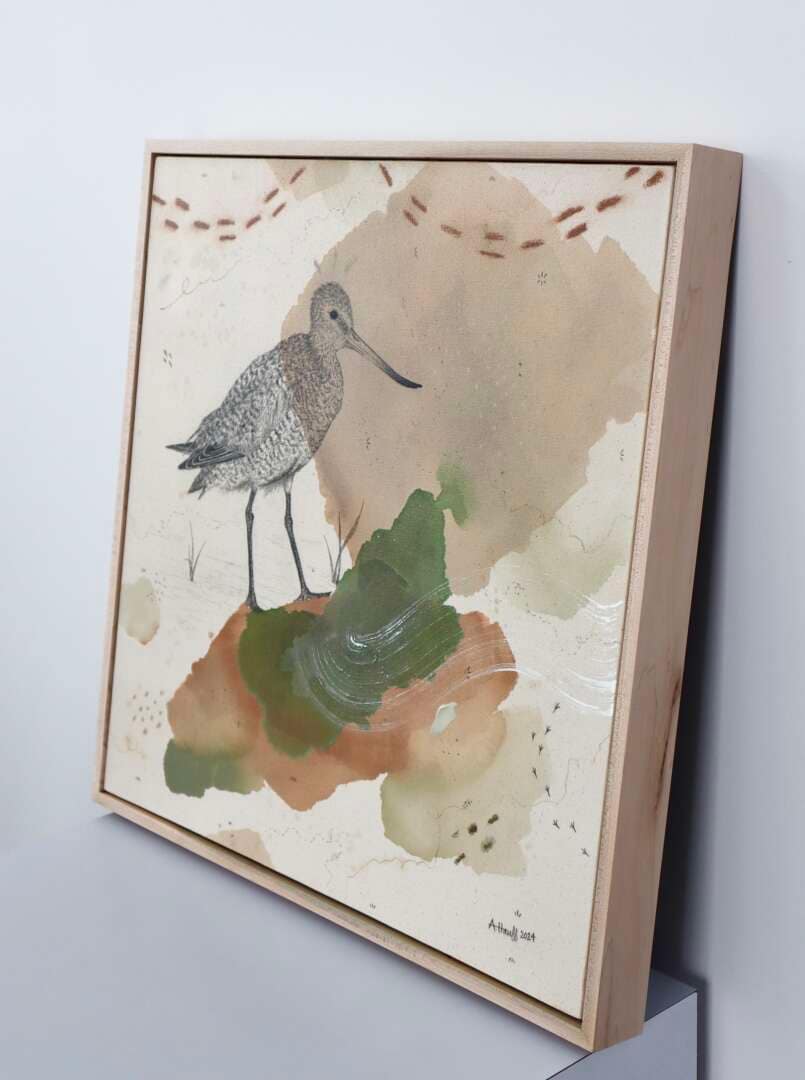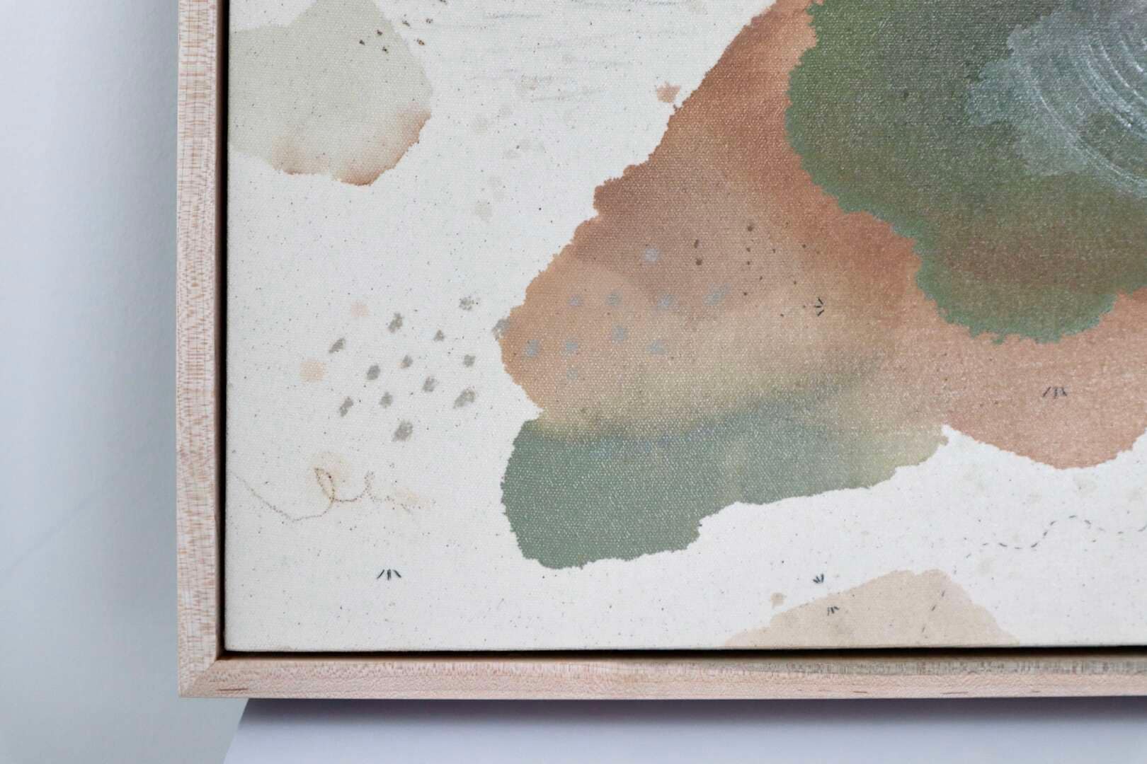 Original mixed media on raw stretched canvas with maple float frame. Alternative hardwood frames available upon request.