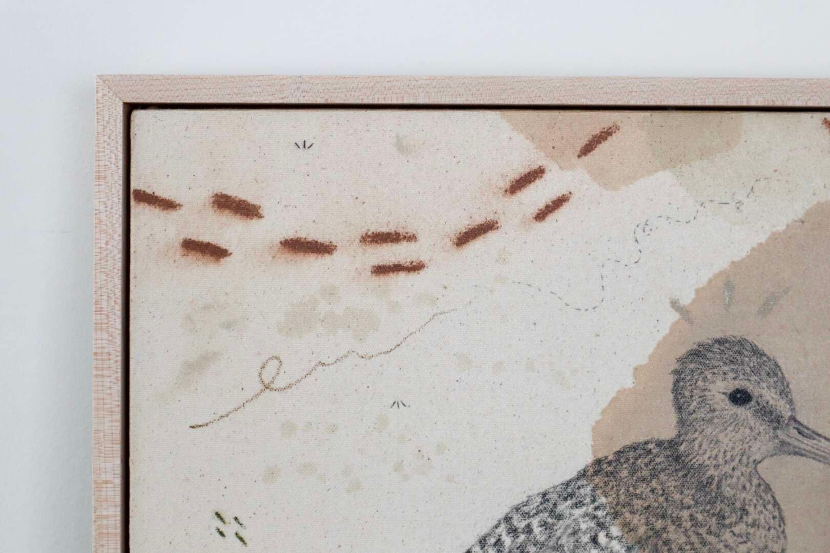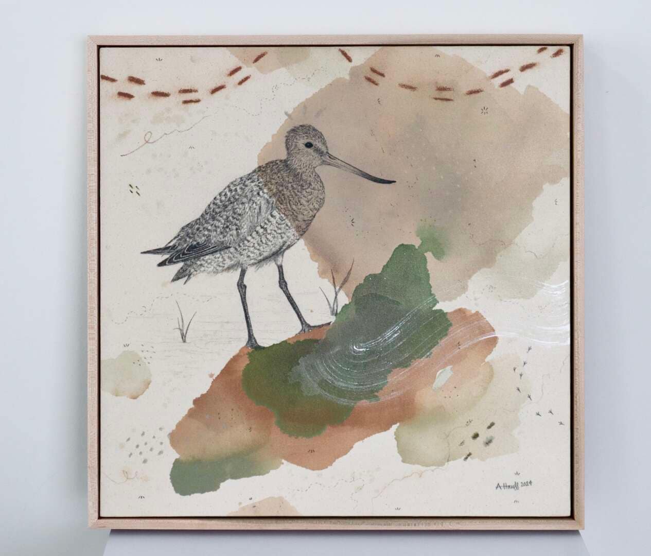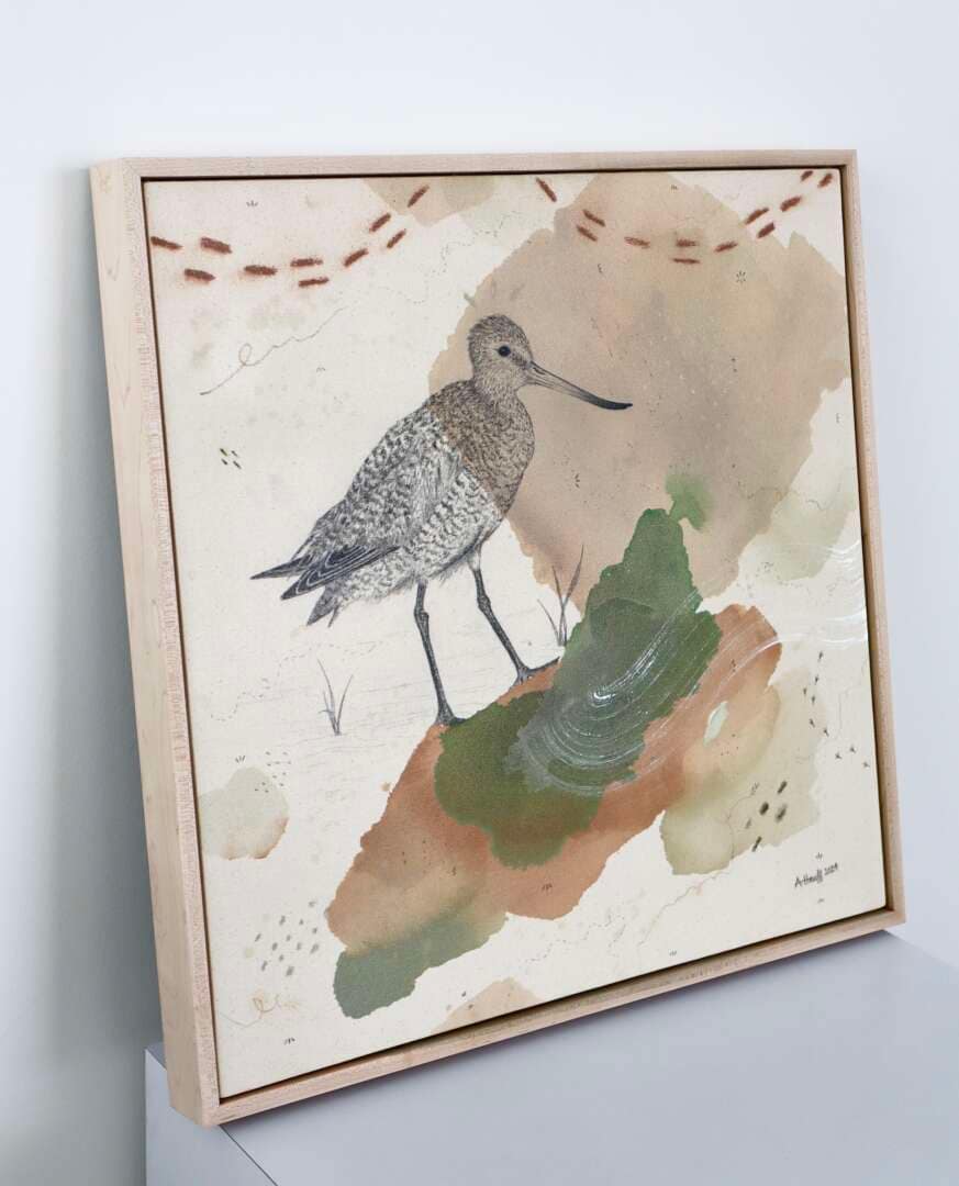 Original mixed media on raw stretched canvas with maple float frame. Alternative hardwood frames available upon request.