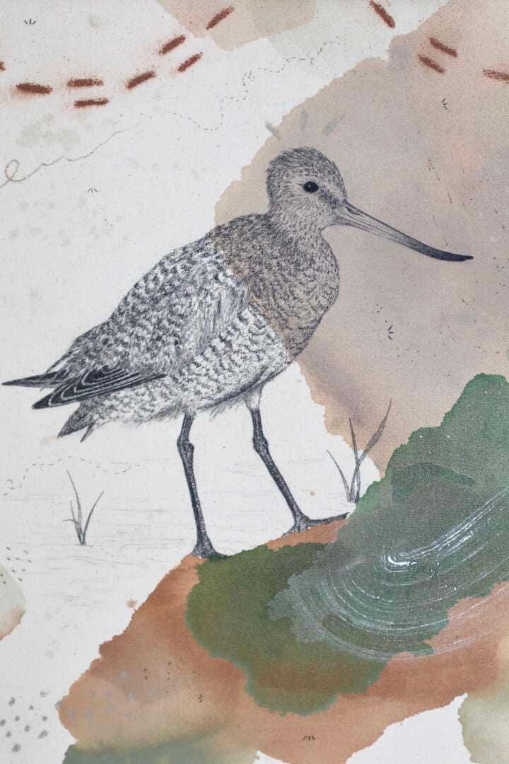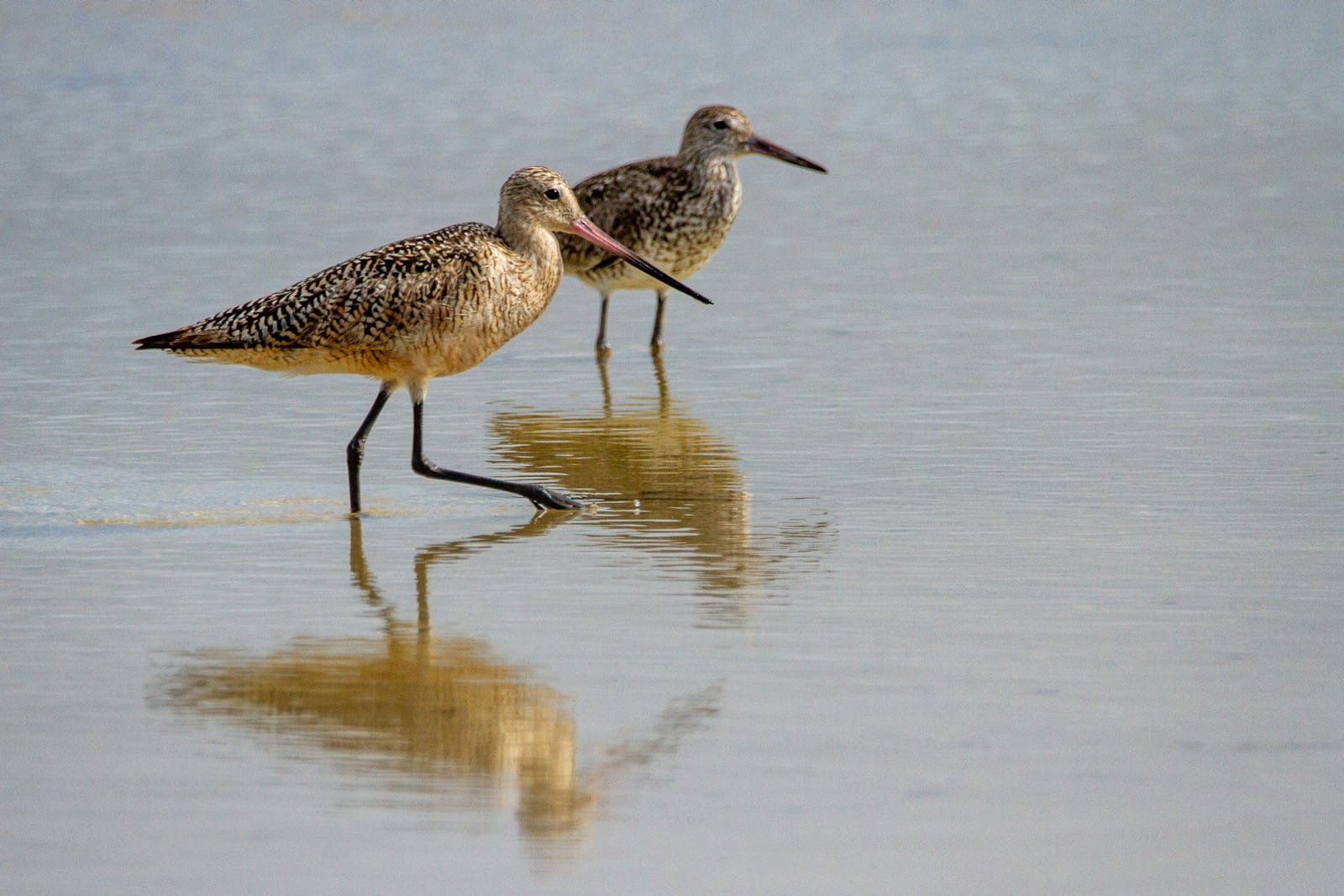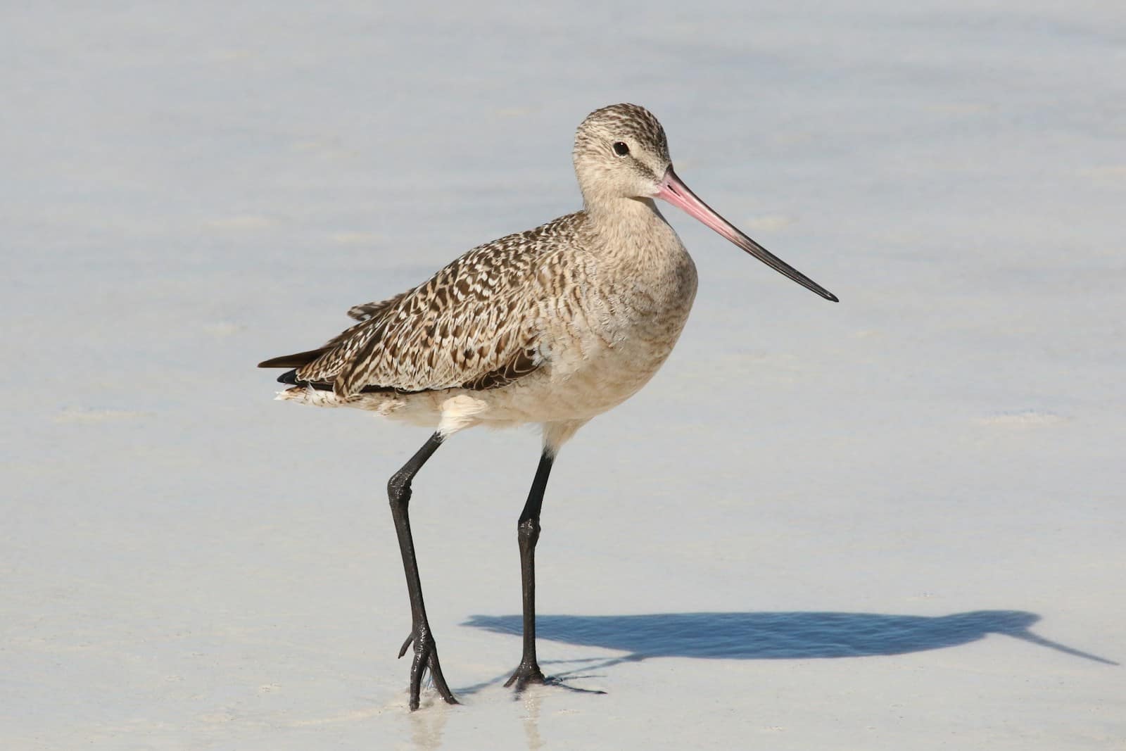 A graceful member of the sandpiper family, the Marbled Godwit can be found almost exclusively in the northern prairies in the summer and coastal regions over winter. They flock together, occasionally with other sandpipers, and forage by probing deep in the mudflats for food. Their long, sword-like beak is slightly upturned at the end and two-toned. Diet includes aquatic invertebrates, worms, insects, aquatic plant tubers, leeches, and small fish.They forage almost exclusively on plant tubers during migration.