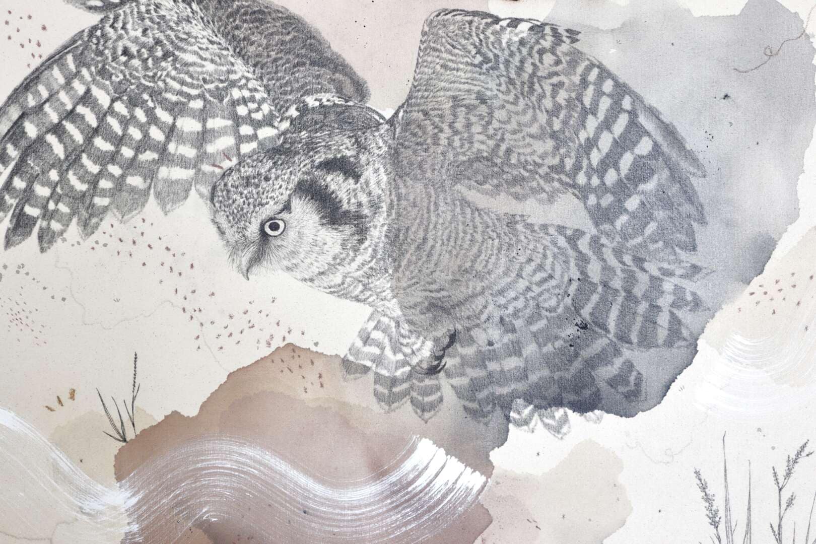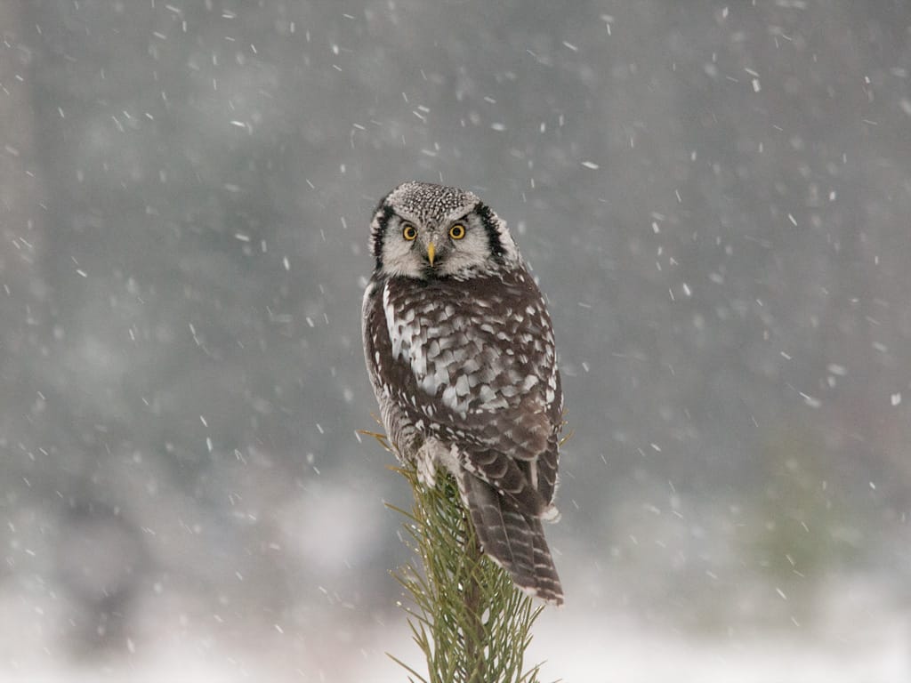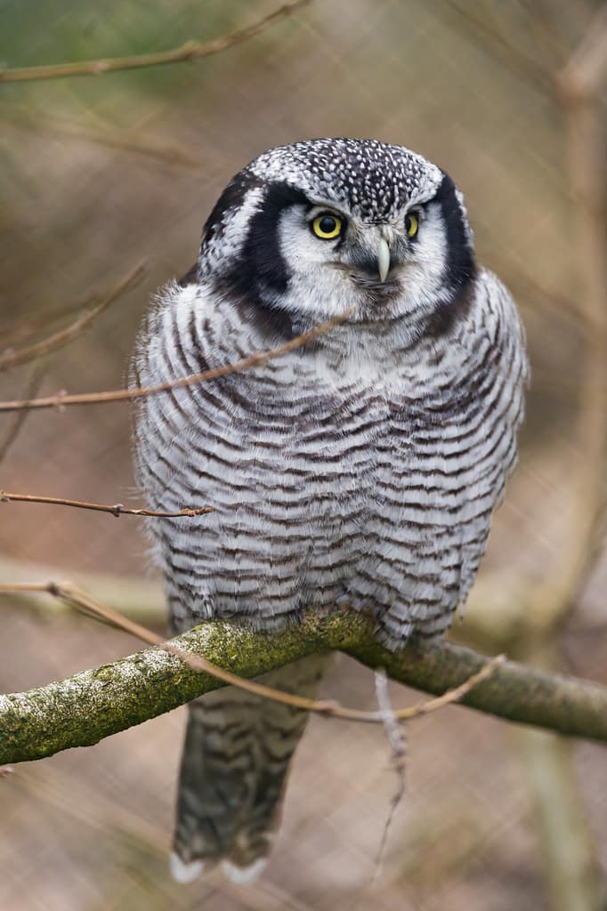 Hawklike in both appearance and behavior, this owl is primarily active during the day in the boreal forests of northern Canada and Alaska. Yellow eyes peer from a whitish face with a V-shaped speckled head and distinctive black borders. They are otherwise brown with whitish spots and heavy horizontal barring along the front and underparts. Hawk owls are nonmigratory but do move around, tracking available prey. At times, it can be seen in southern Canada and the northern US. They perch along the tops of solitary tall trees, flying fast and low between trees and sometimes hovering. Once prey is spotted, they attack in very fast flight, like falcons.