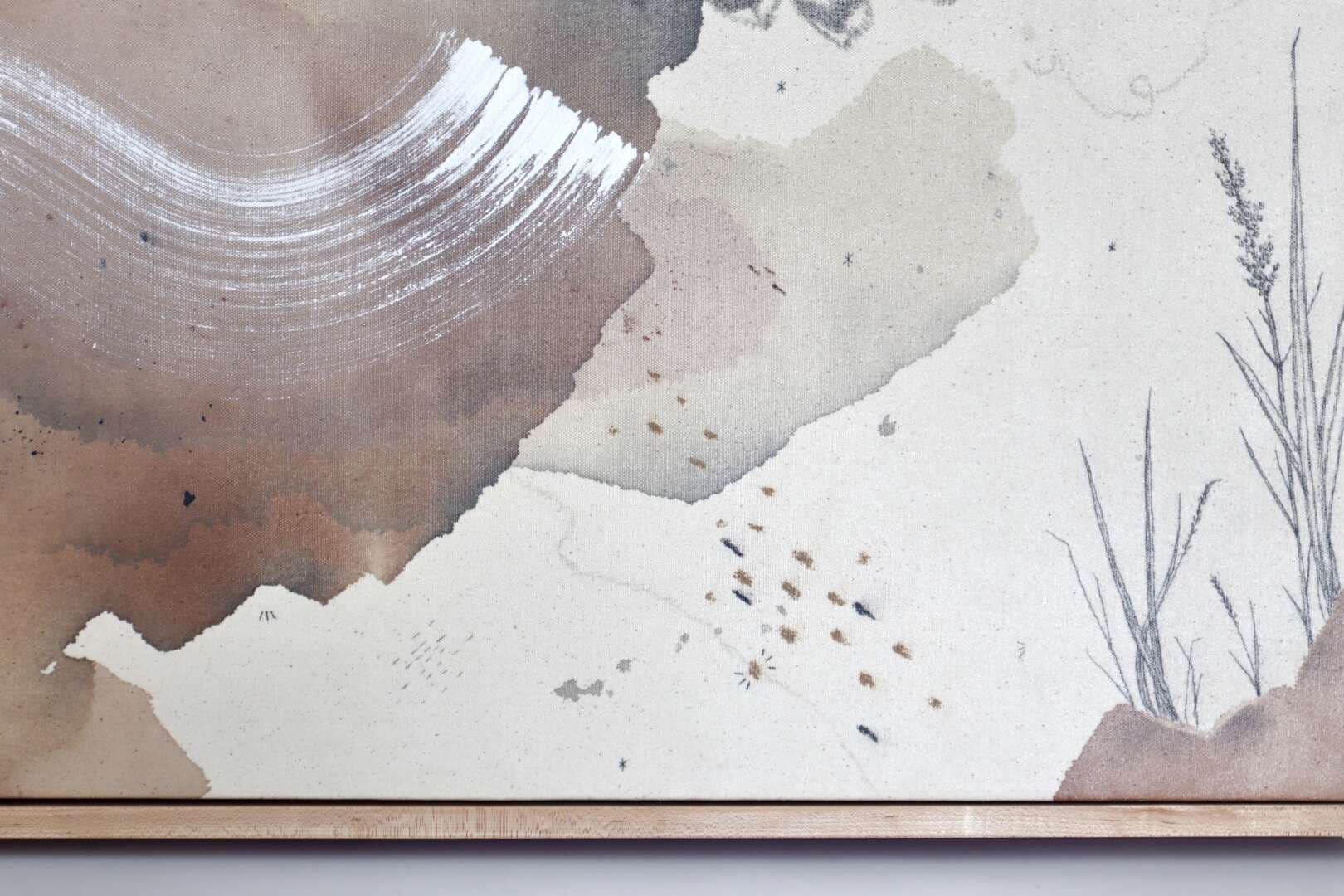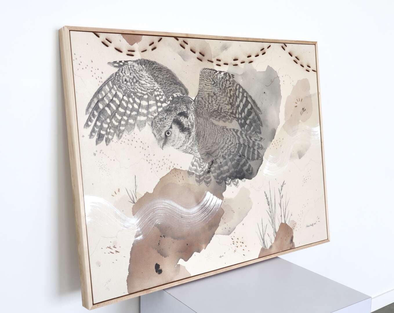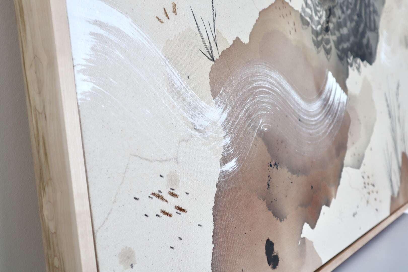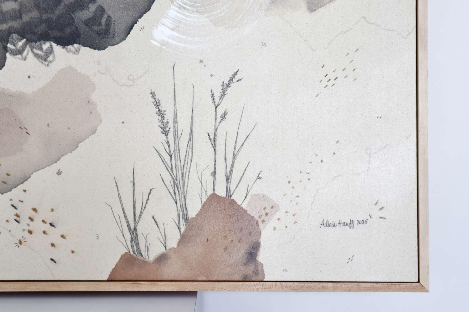Original mixed media on raw stretched canvas with hard maple float frame.