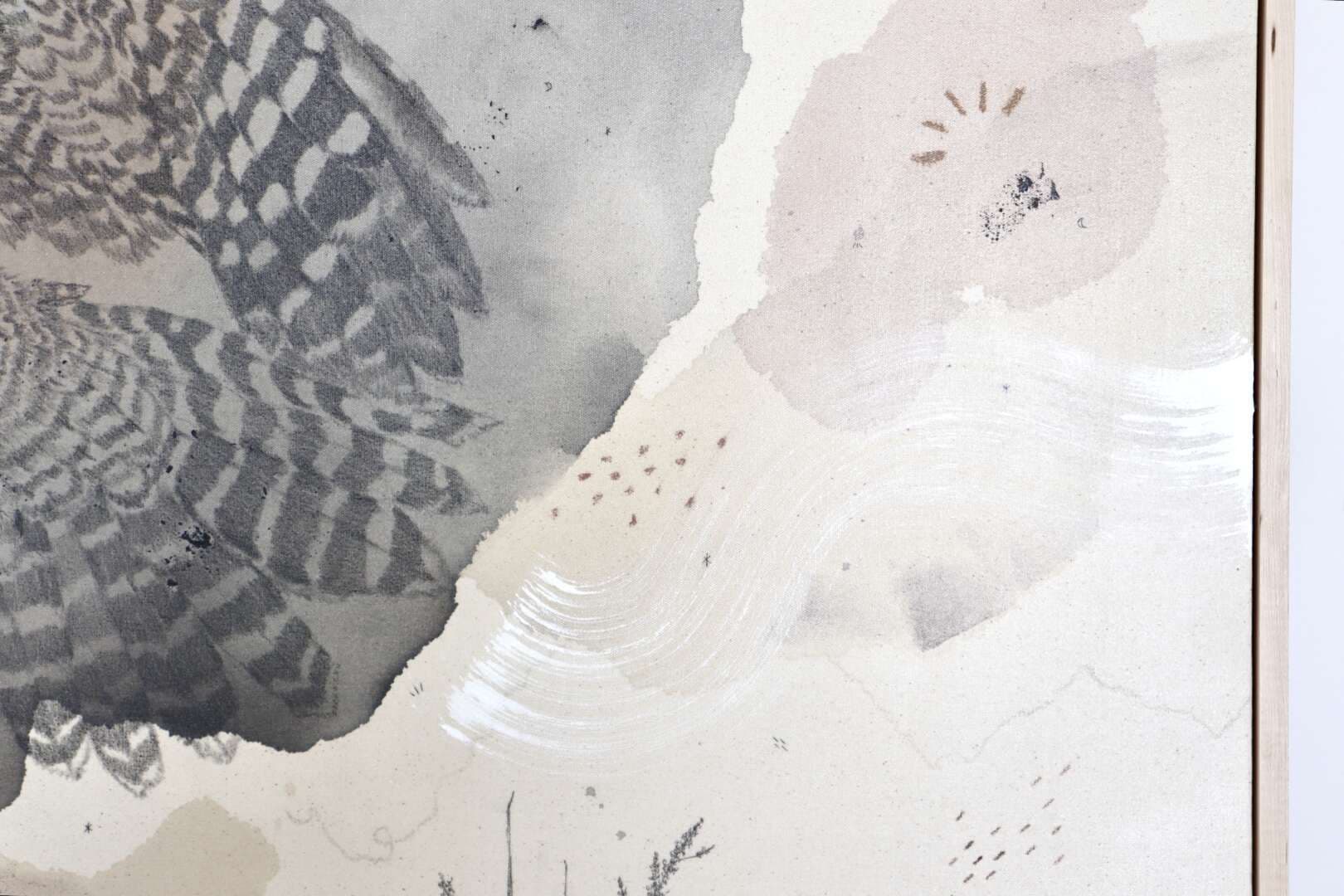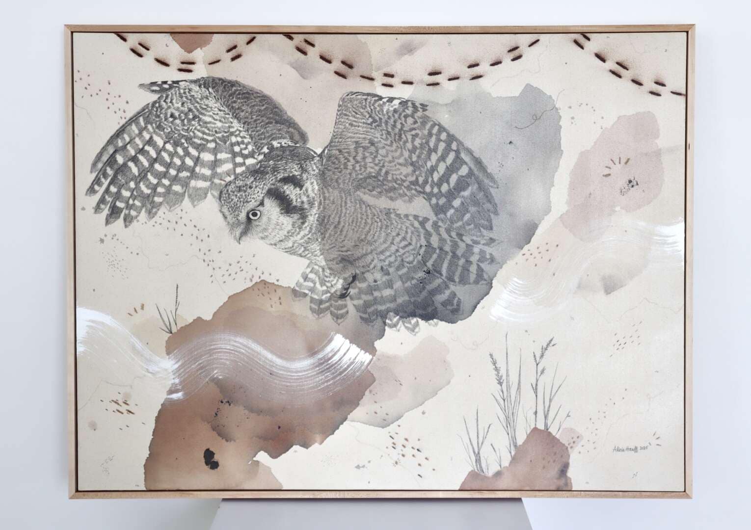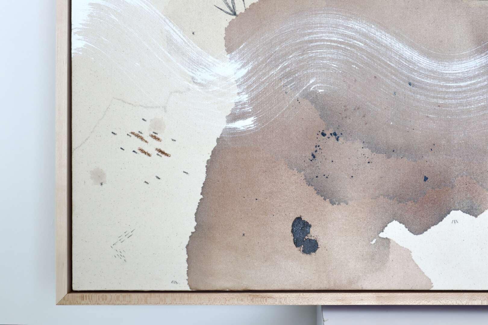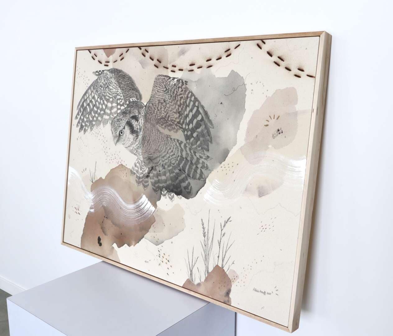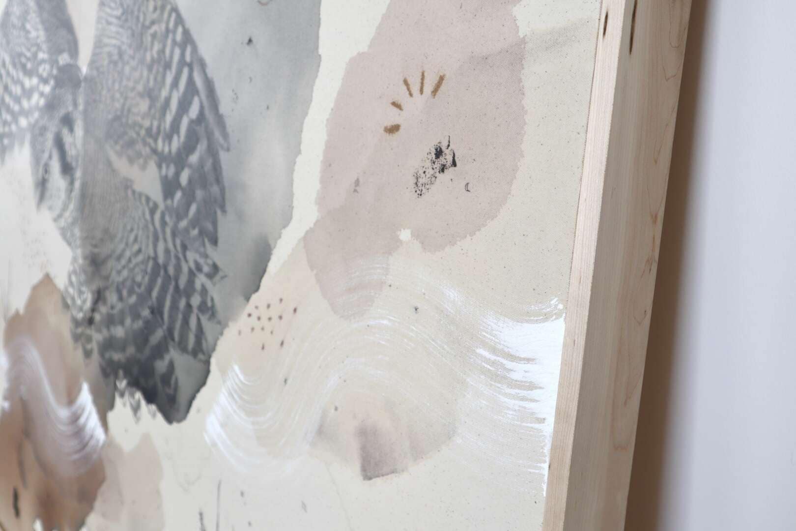 Original mixed media on raw stretched canvas with hard maple float frame.