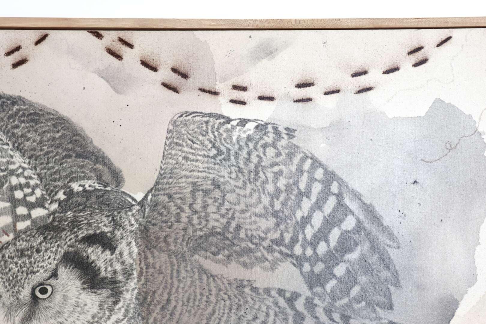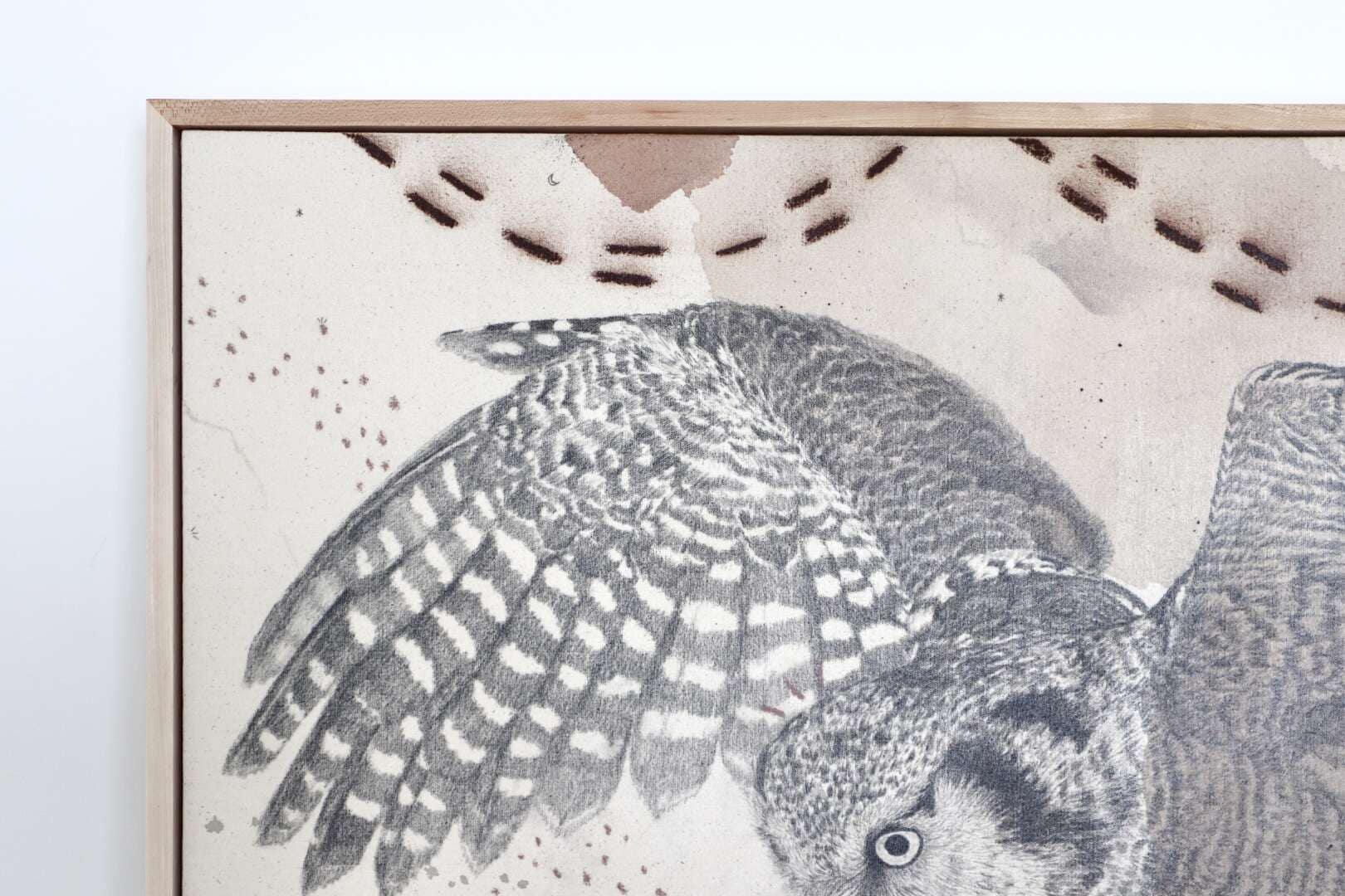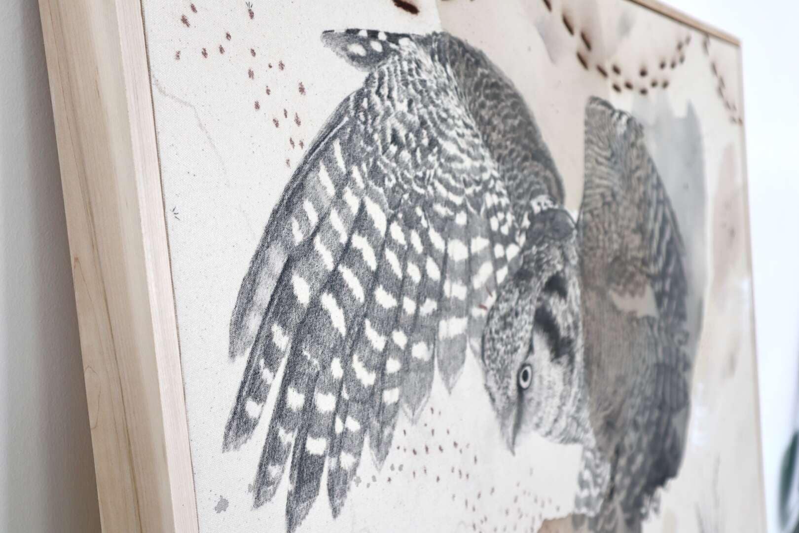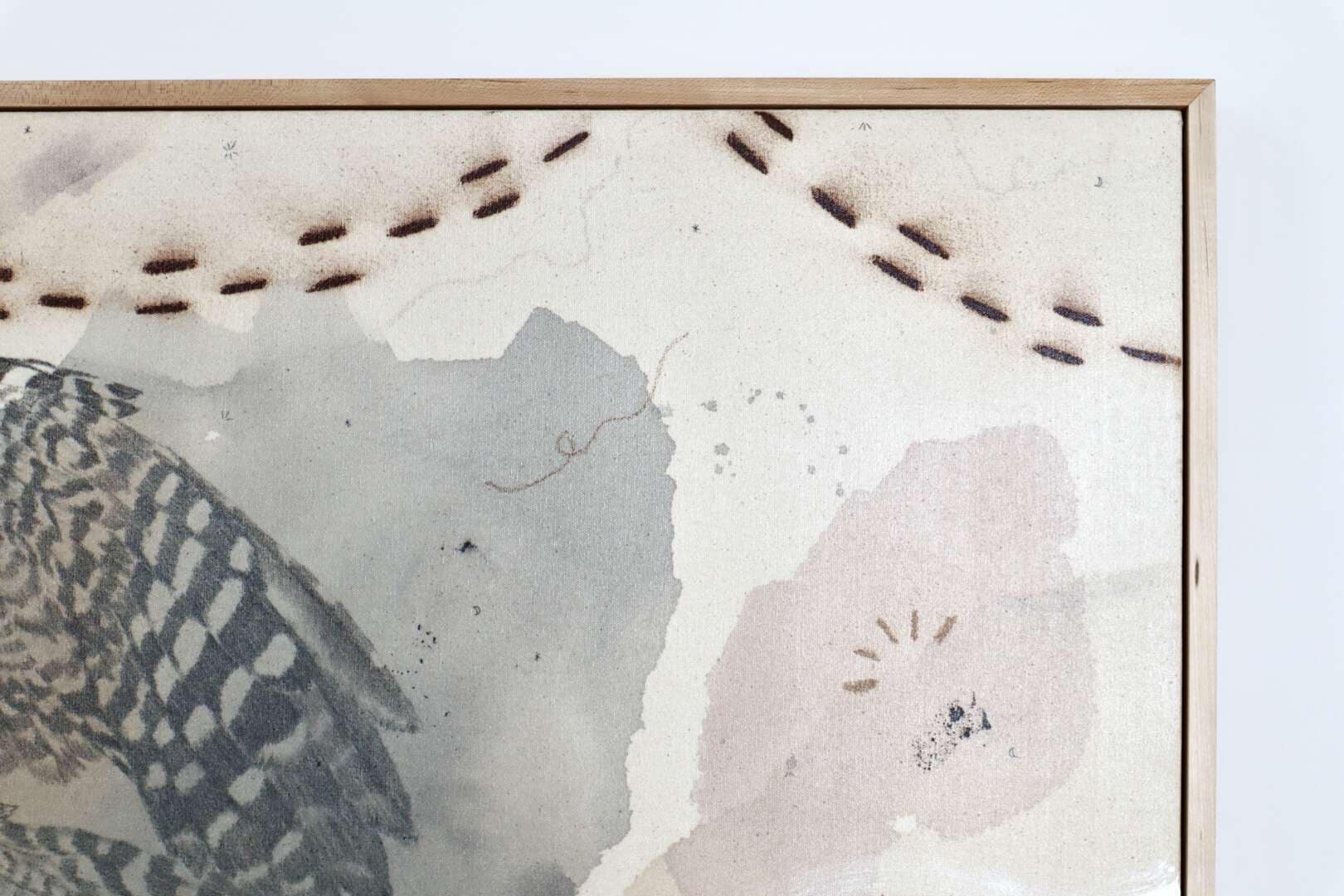 Original mixed media on raw stretched canvas with hard maple float frame.