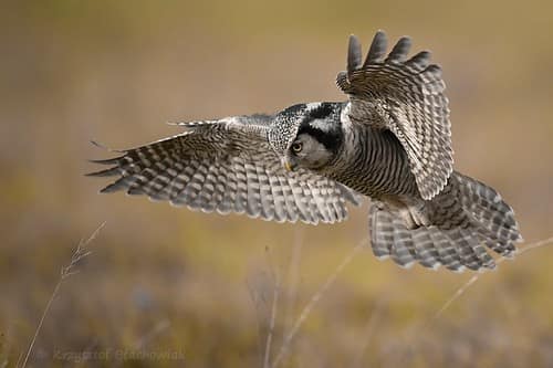 Diet is mainly small mammals, especially voles, in the summer. They also eat birds such as grouse or ptarmigan in the winter. Hawk Owls take advantage of abundant prey by caching small mammals to eat later, storing them in tree crevices, holes in trees, or among dense spruce boughs. Hunting and courting take place within their territory during the breeding season. A male trying to court a female flies in circles with its wings held stiff while singing; then he lands on a prominent perch where he calls for a mate. Once paired, the male offers food to his mate and continues to feed her during incubation. Pairs stay together for a single breeding season. Northern Hawk Owls tend to be solitary year-round but seem relatively tolerant of other birds, including other owls within their territory. But they are not tolerant of intruders, including humans at the nest site, and will attack any intruder that comes near.