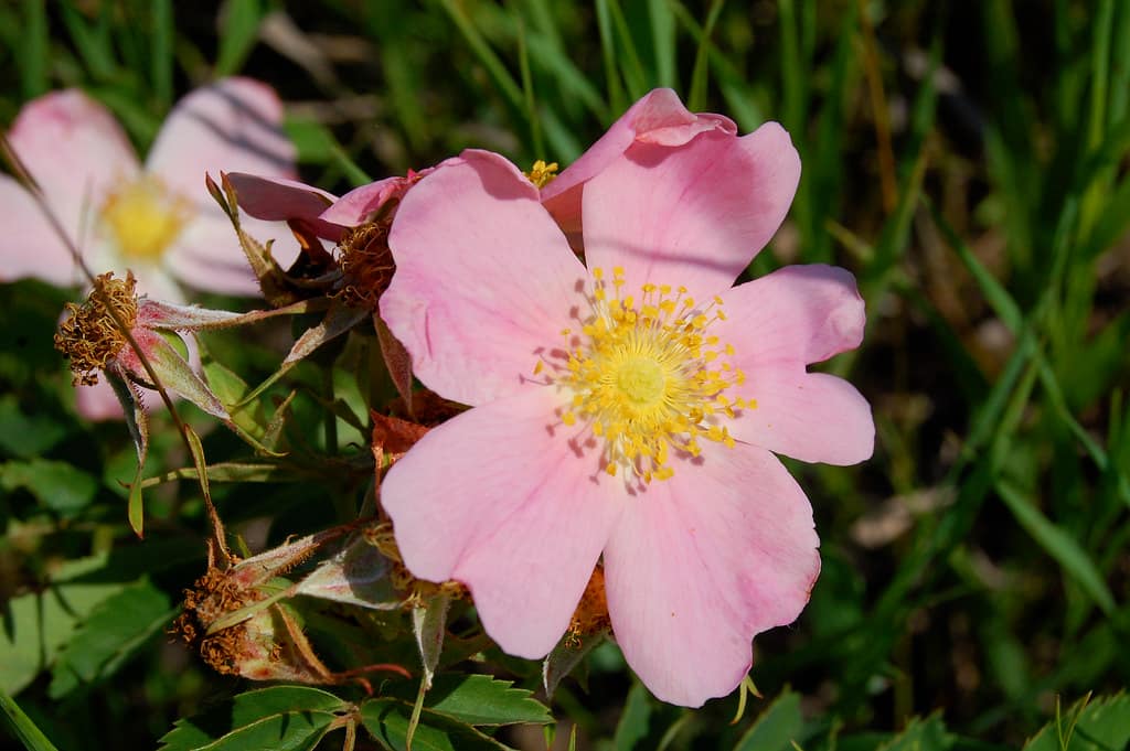 Prairie rose is renowned for her beauty symbolic of life, vitality and survival. Other names include “dog rose,” “pasture rose,” and “bristly rose.” It is characterized by 5 wavy/notched petals deep pink in color to white or bicolored, with yellow central stamens, and blooms May to September. Petals and rosehips are edible, historically used in medicines, teas, jams, and soups. Rosehips are very nutritious and provide food for wildlife in the winter season. Growth is bushy and upright, with a height of up to 40 inches.