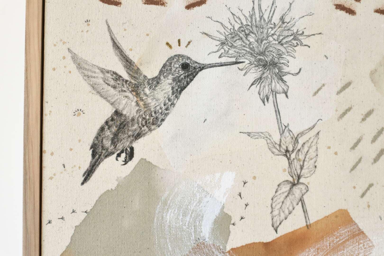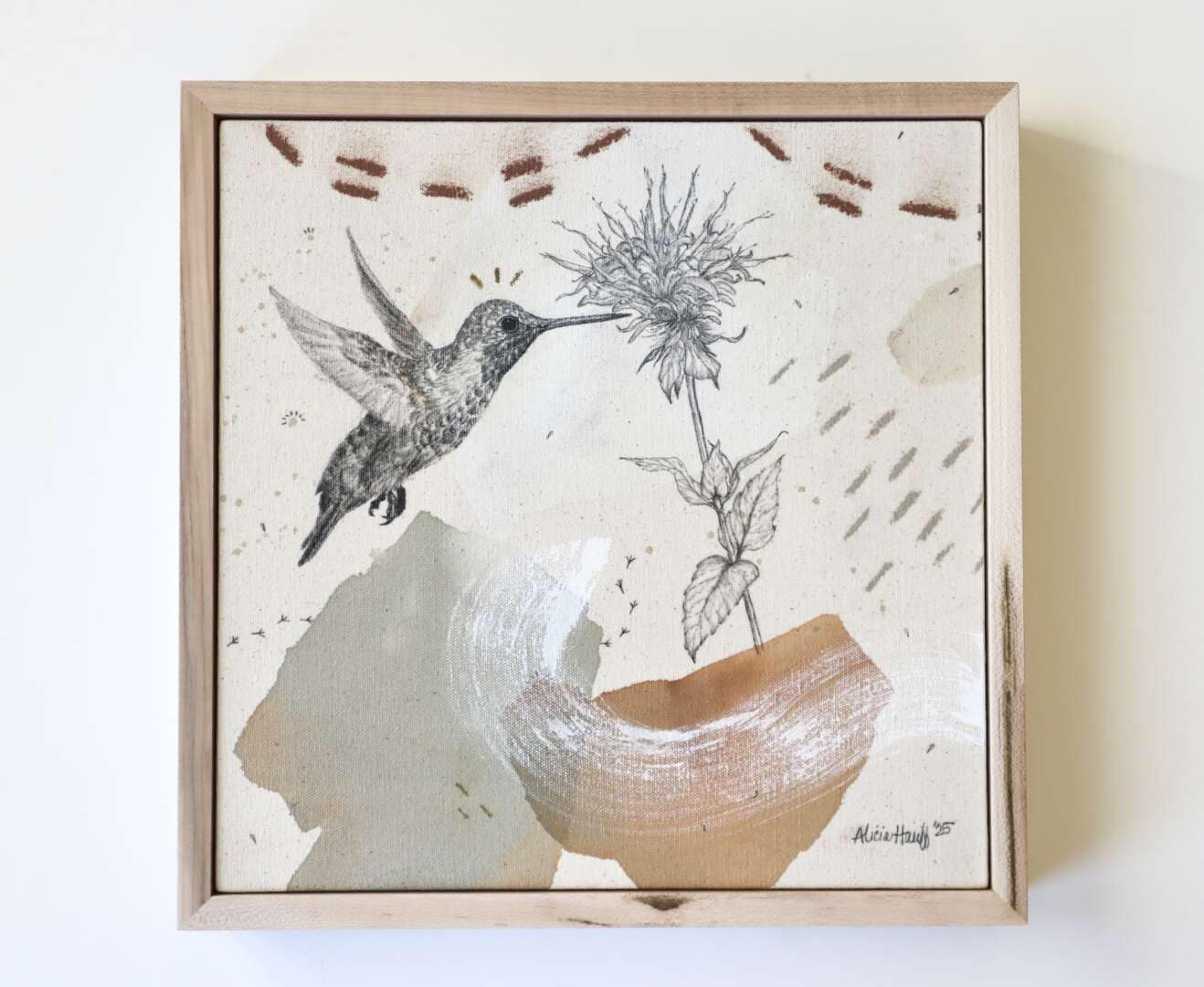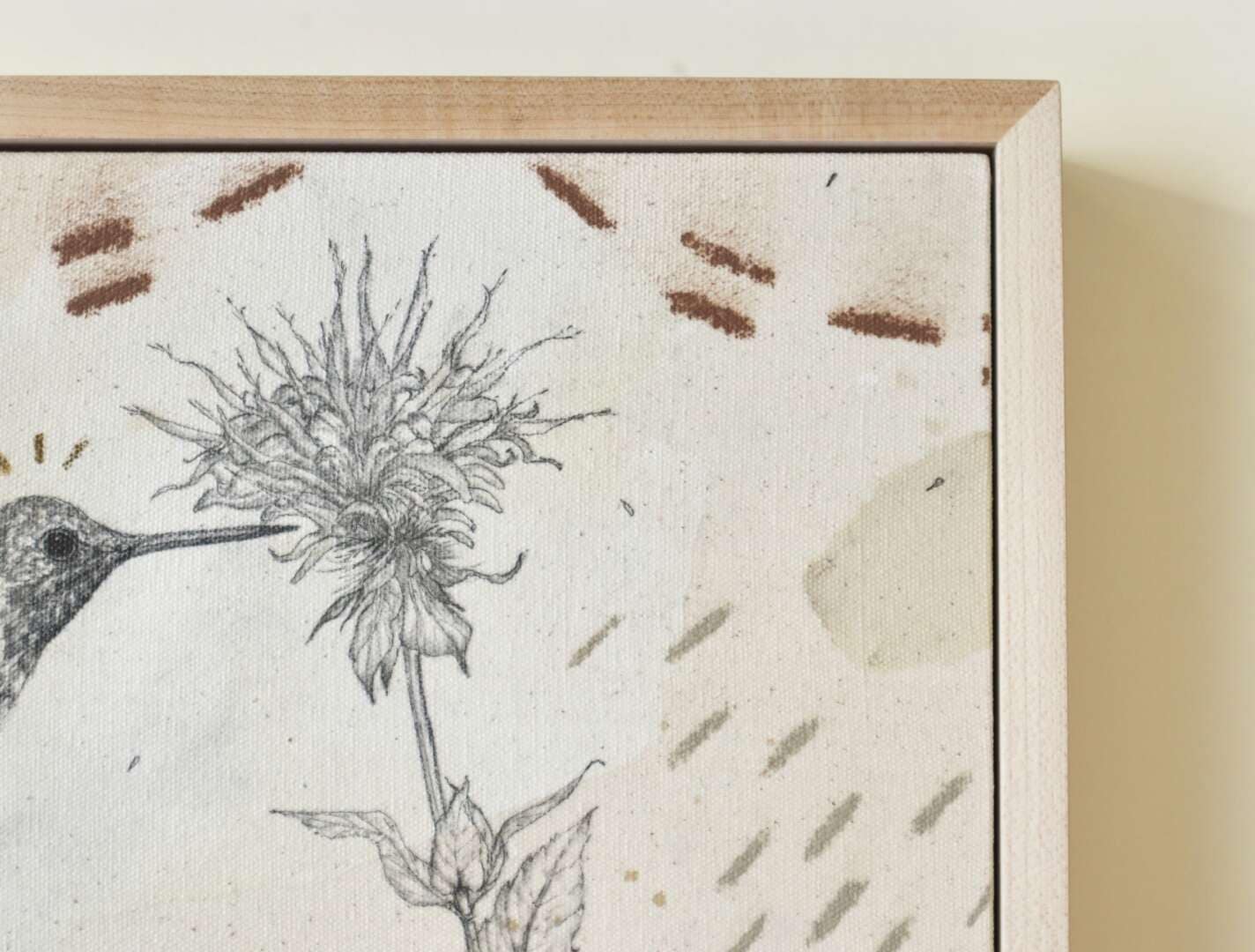 This spring, I invested in a smart hummingbird feeder for our backyard. It hangs on a maple tree branch out our kitchen window, and lets me know who visits with photos and video. I’ve been faithfully making new sugar-water nectar every few days and keeping the feeder clean. I was inspired to create a piece with a native wildflower they love: Wild Bergamot, or Bee Balm.
