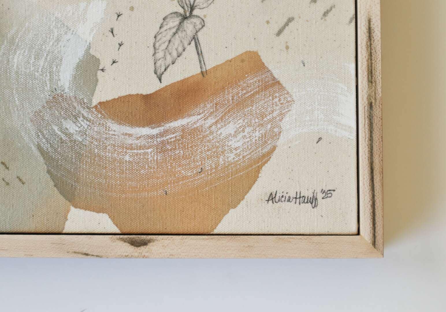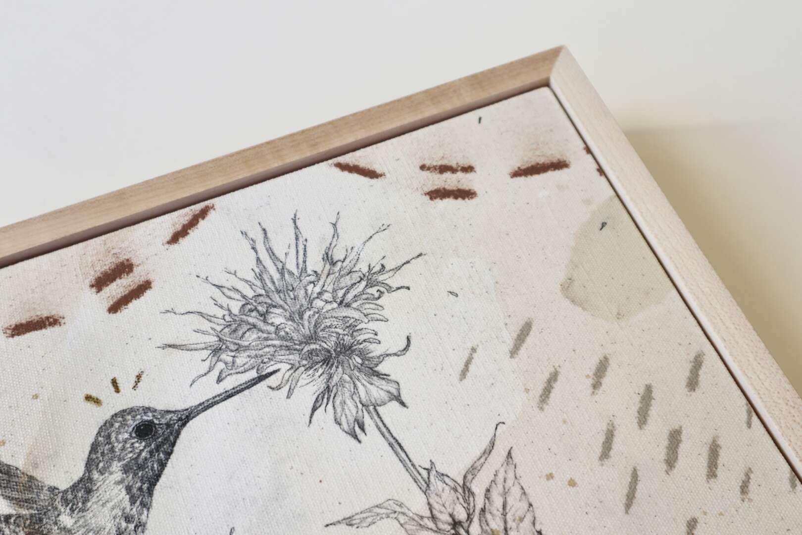 Original mixed media on raw stretched canvas with hard maple float frame.
