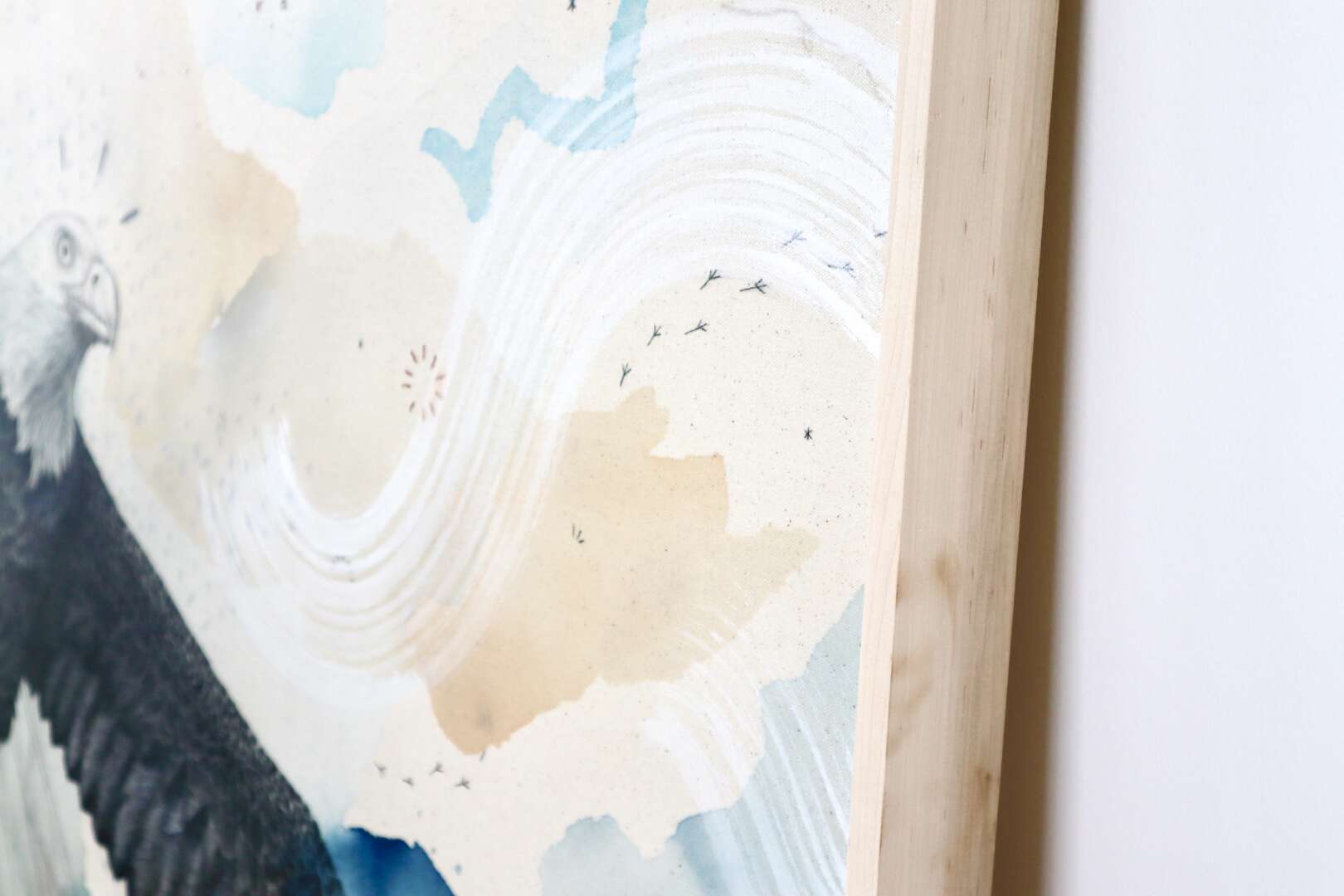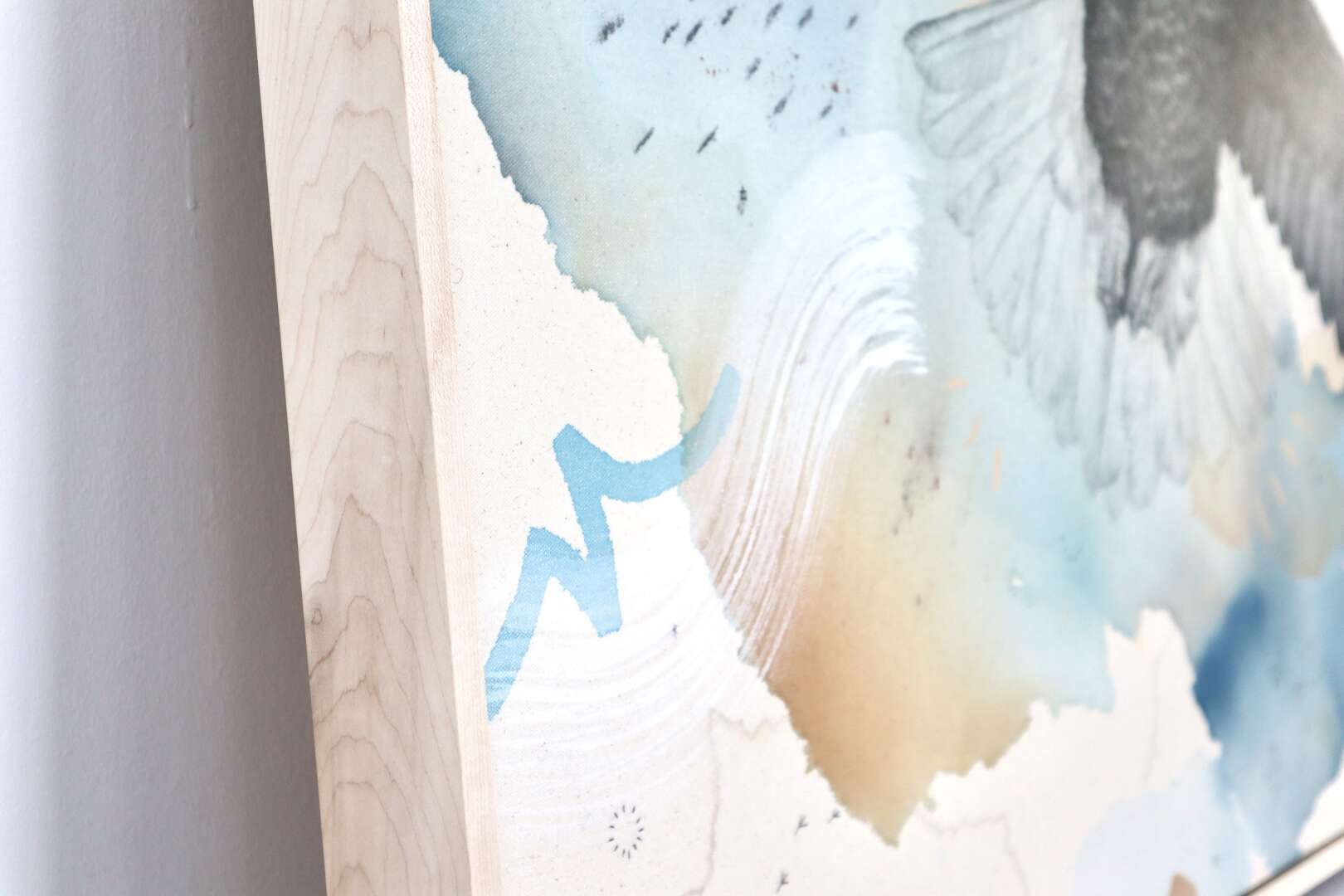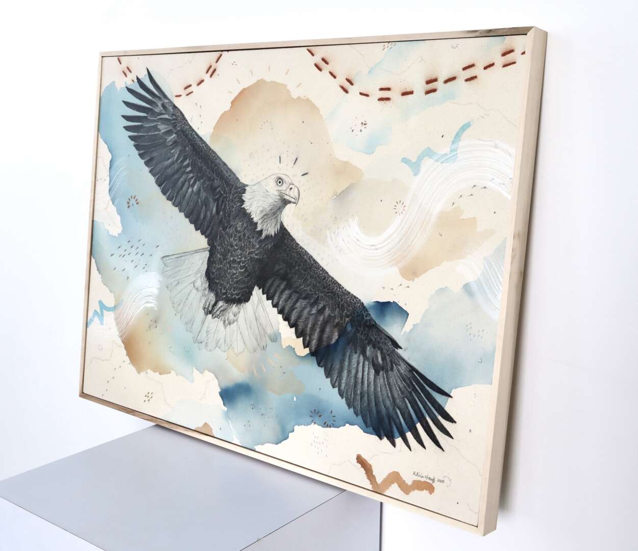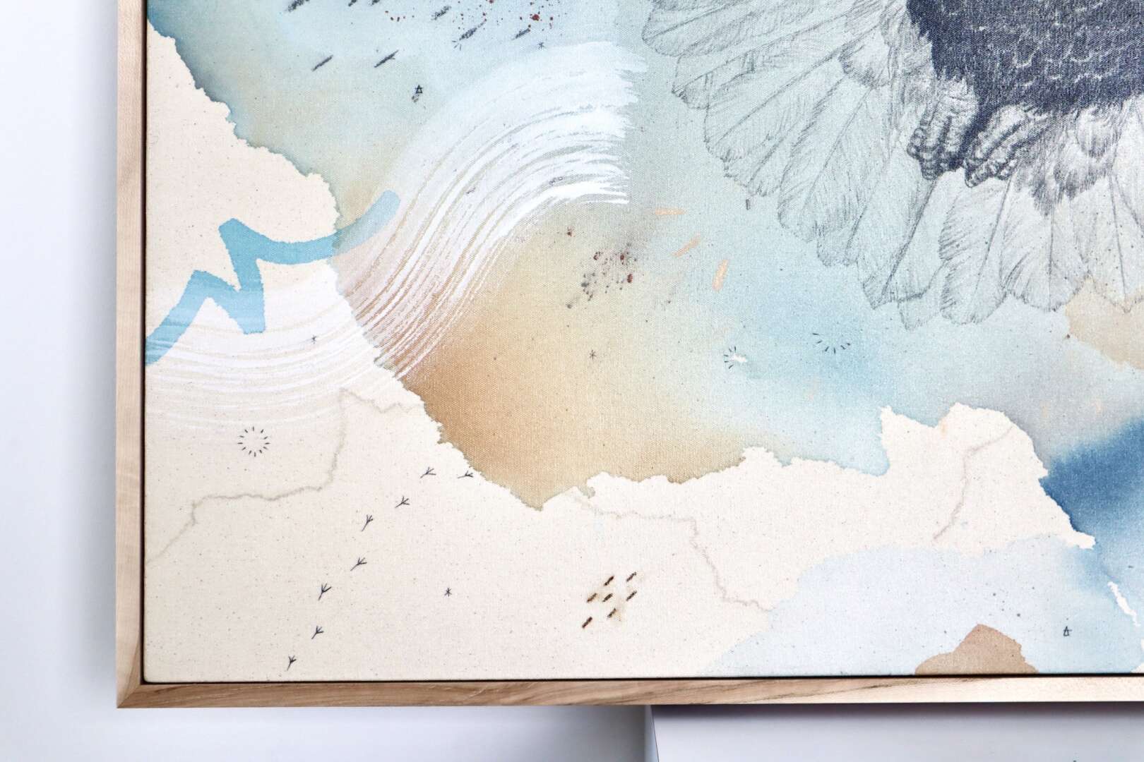 Original mixed media on raw stretched canvas with hard maple float frame.