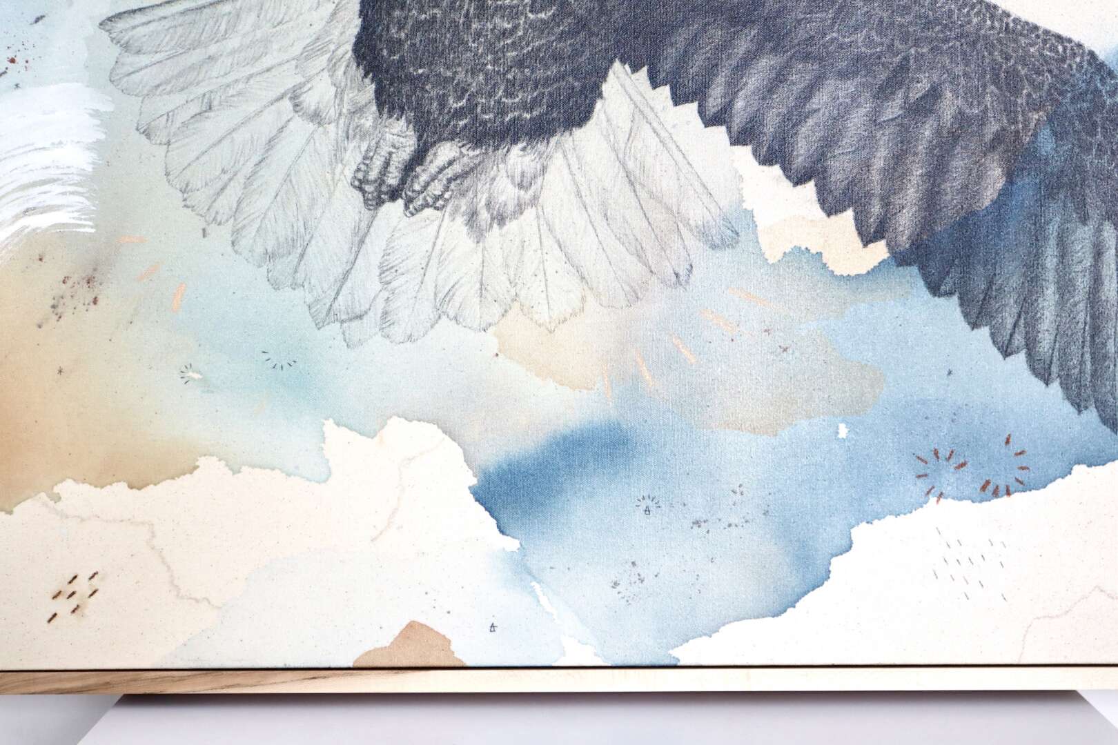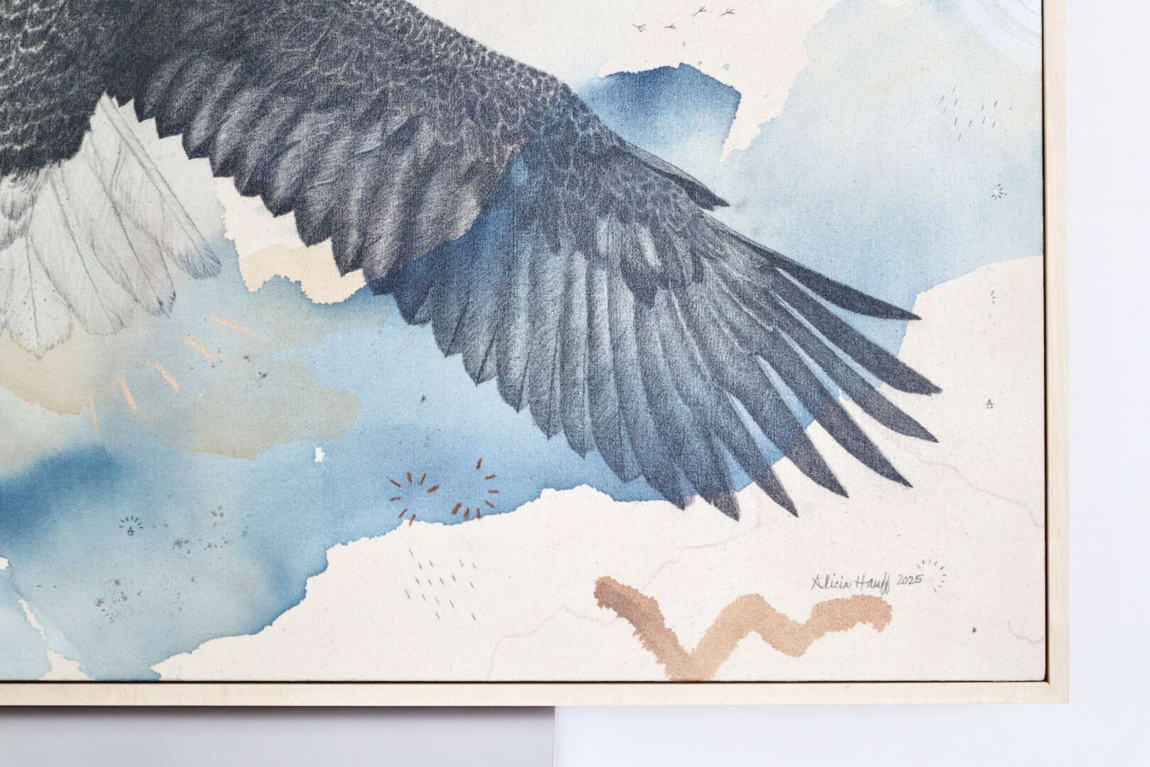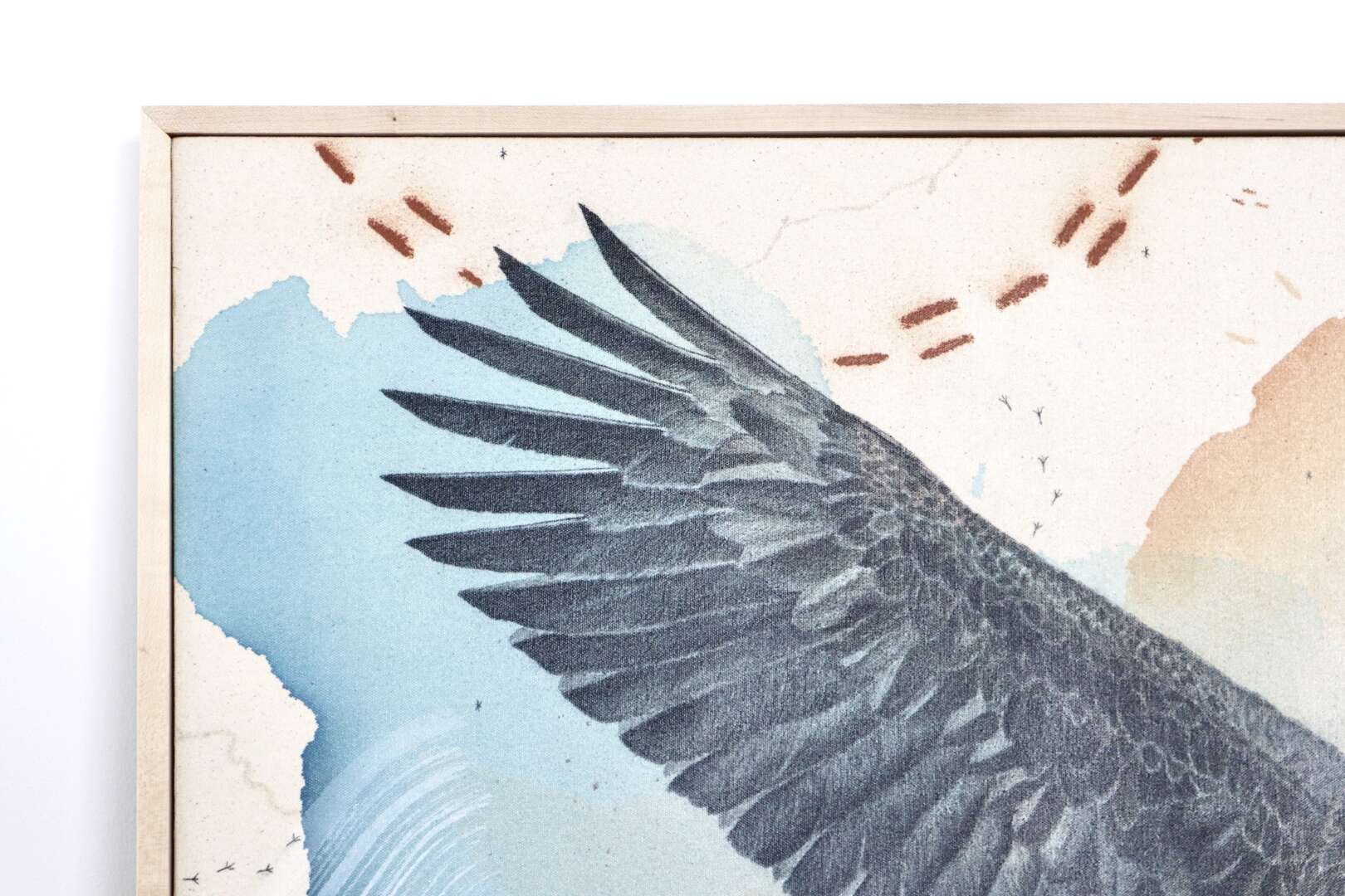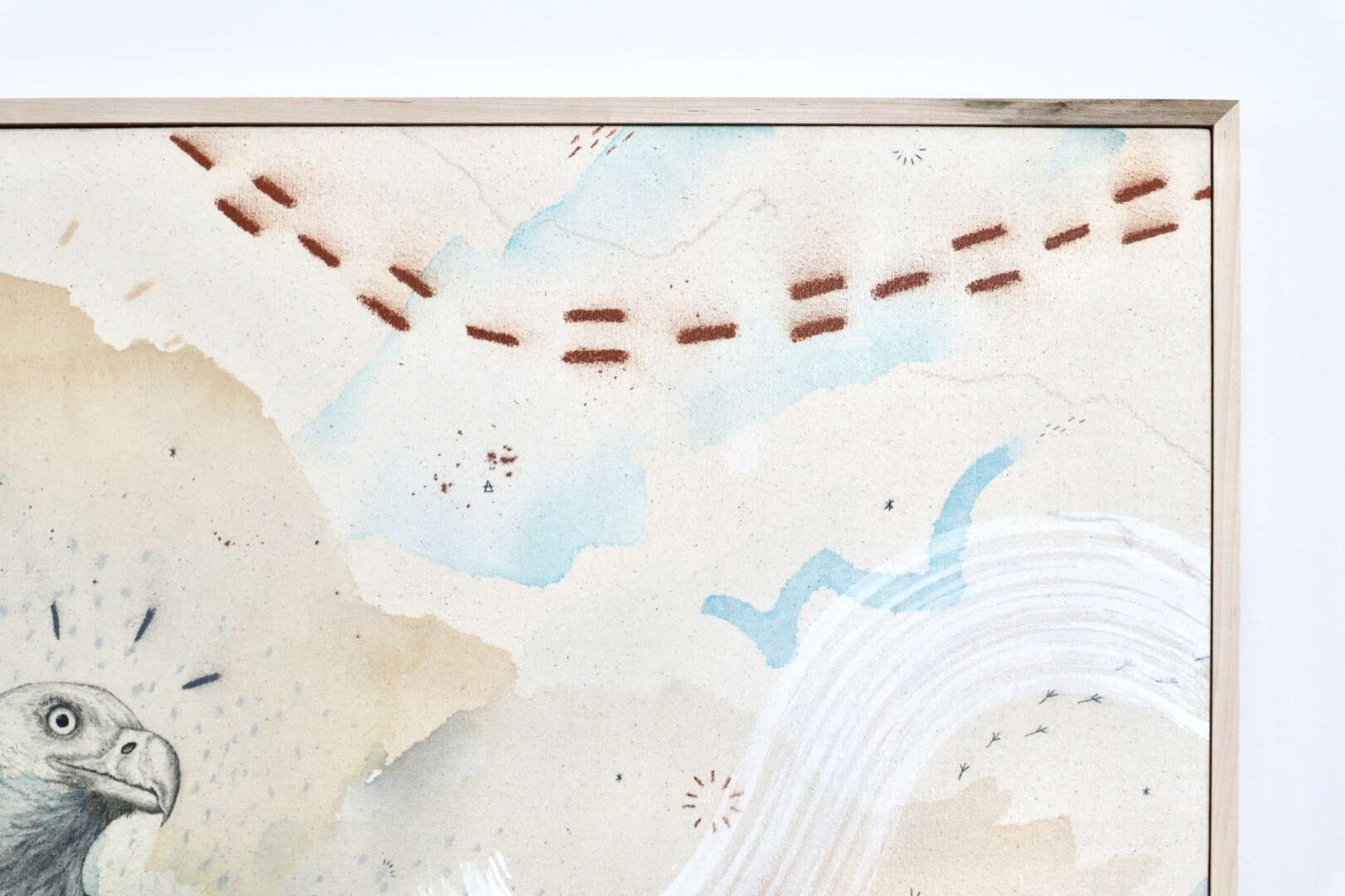 Original mixed media on raw stretched canvas with hard maple float frame.