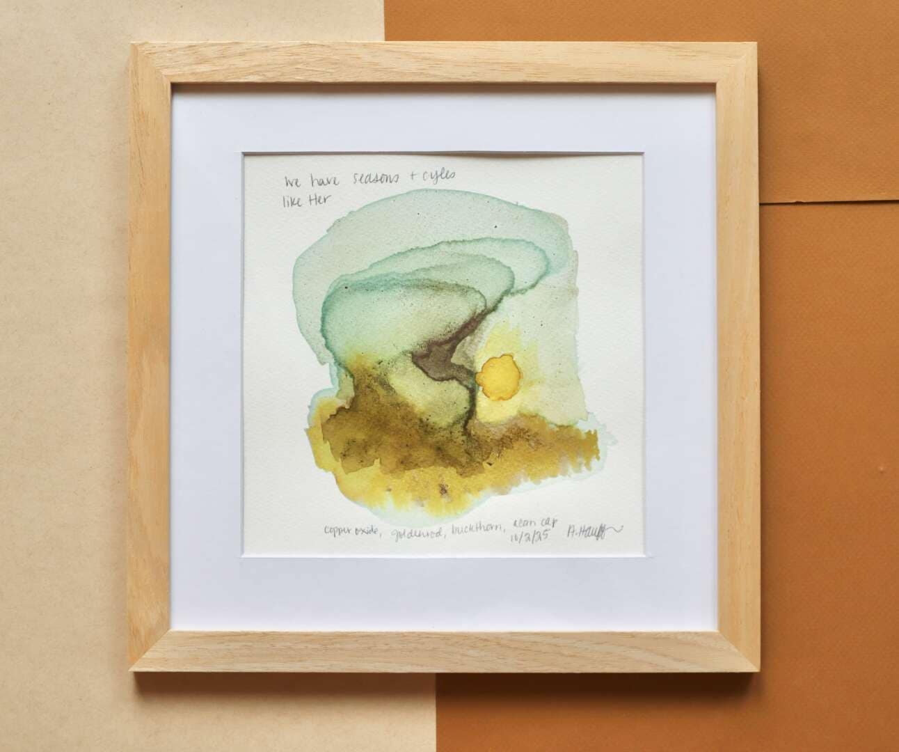 Wildcrafting color from the land, whether foraged, grown from seed, or second life from the waste stream, is alchemical in nature. I wanted to shift from the typical stamped grid to a more free-flow, abstract landscape with messages inspired by time spent outdoors. “We have seasons and cycles like Her” points to our shared humanity; we are made from earth’s elements, constantly in motion and changing. To embrace one’s seasons and cycles is to live with humility and in close connection to natural rhythms, not man-made timetables.