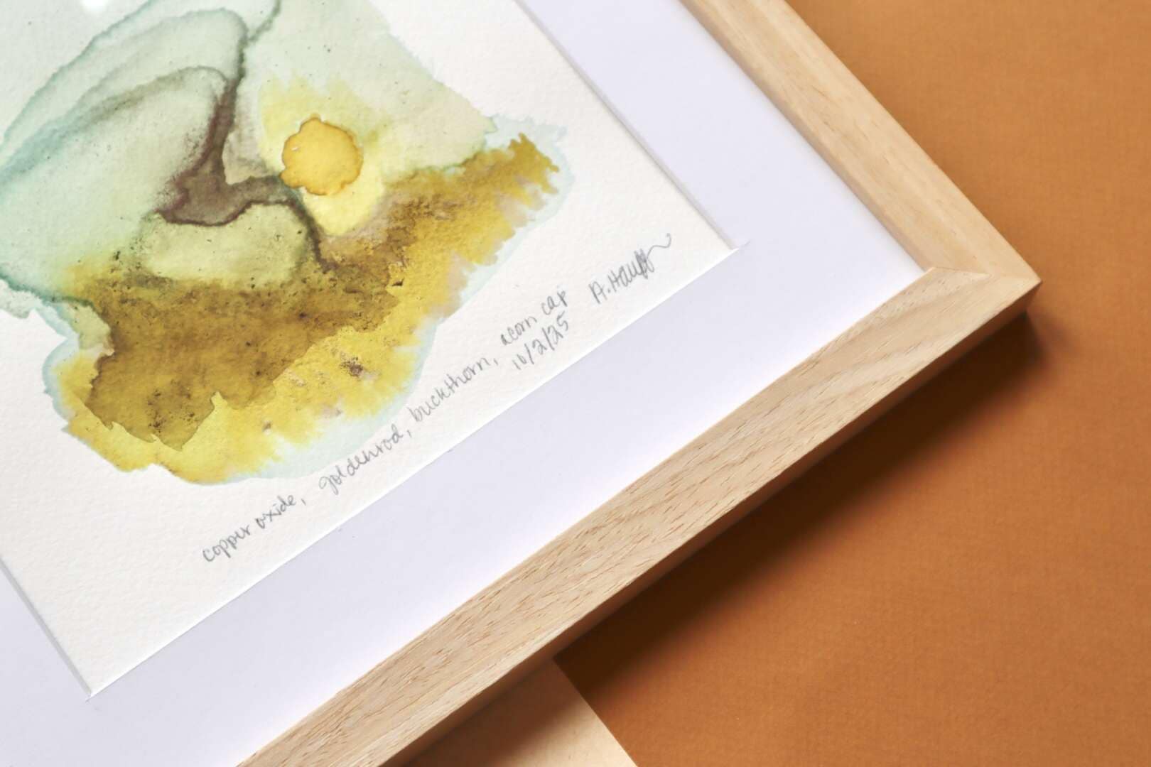 This ink sketch was created with inks from copper oxide, goldenrod blooms, buckthorn berries, and acorn caps. Framed in natural wood with a white mat, ready to hang.