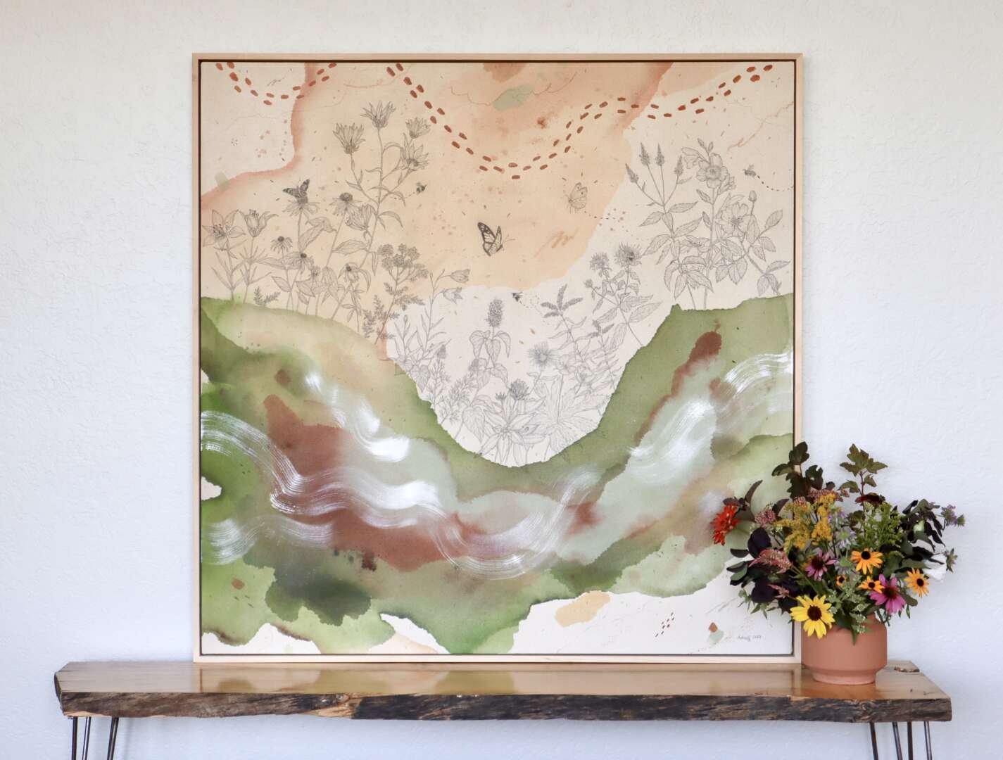 Original mixed media on raw stretched canvas with maple float frame.