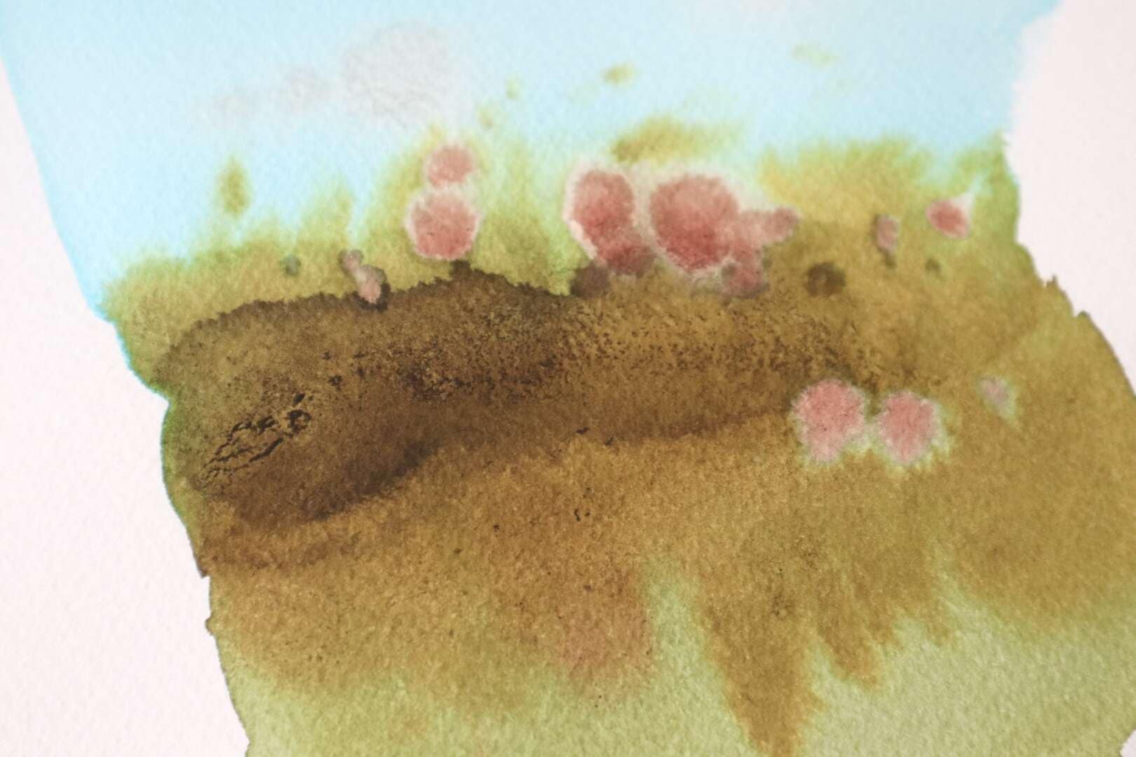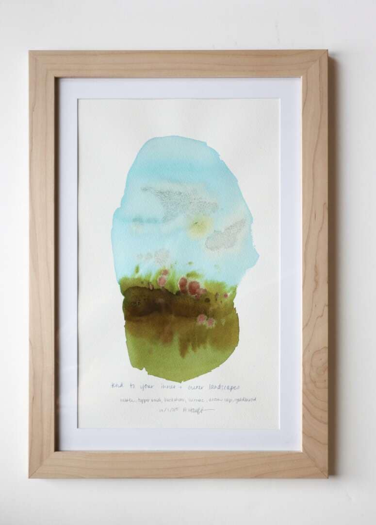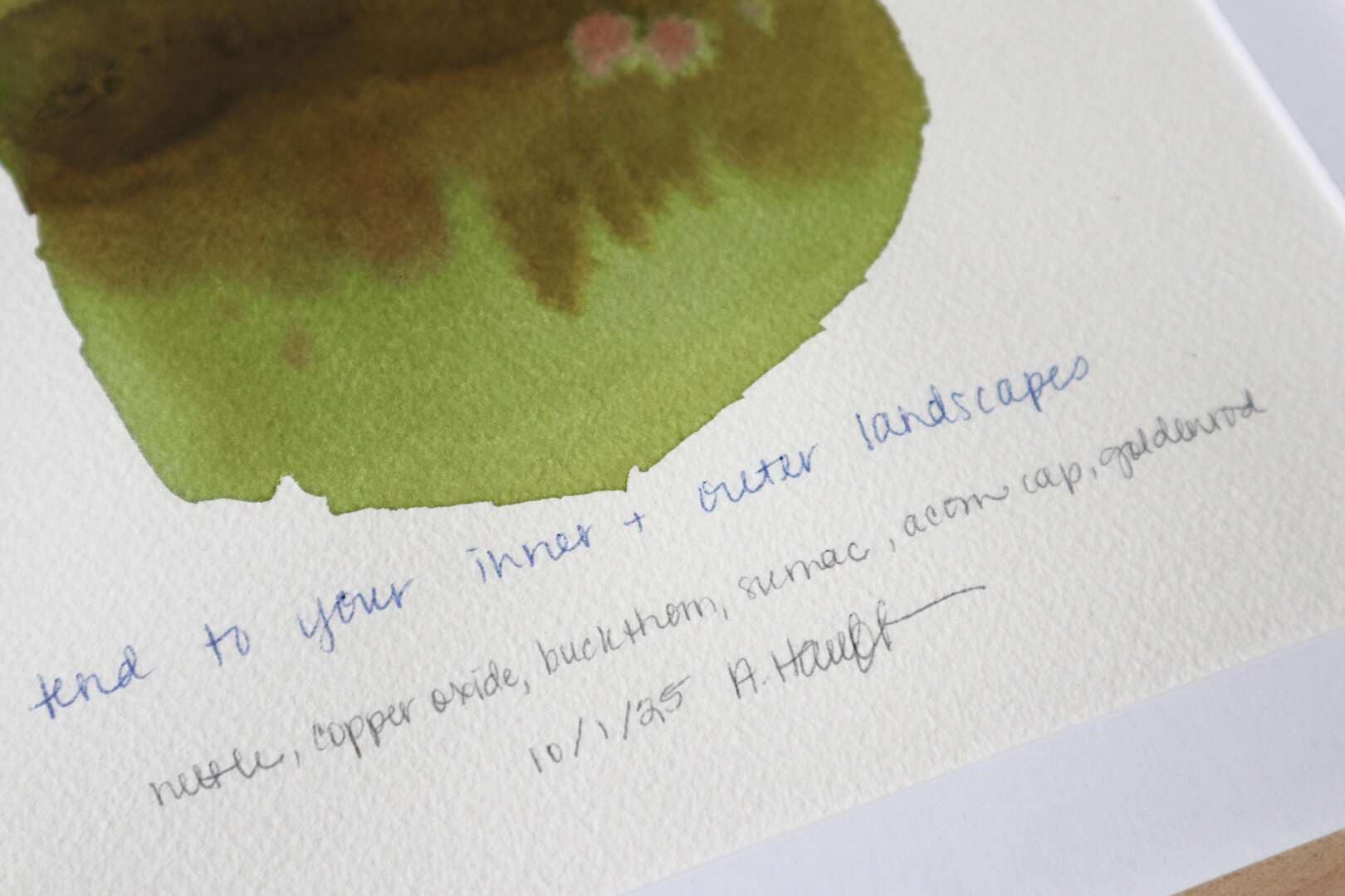 Wildcrafting color from the land, whether foraged, grown from seed, or second life from the waste stream, is alchemical in nature. I wanted to shift from the typical stamped grid to a more free-flow, abstract landscape with messages inspired by time spent outdoors. “Tend to your inner and outer landscapes” is a gentle call to remember we are terrestrial beings; we are made from earth’s elements, constantly in motion and changing. We are impacted by our landscapes, and impact them in turn, interconnected.
