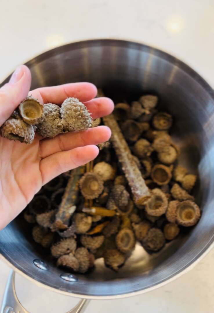 Acorn cap grey-brown: This was one of the first inks I ever created, and one of my favorites. With many an oak tree in my neighborhood, I don’t have to walk far to forage some fallen acorn caps. The recipe calls for a couple rusty nails (plenty in our garage), and I’ve learned that creates more of a brown than warm grey.