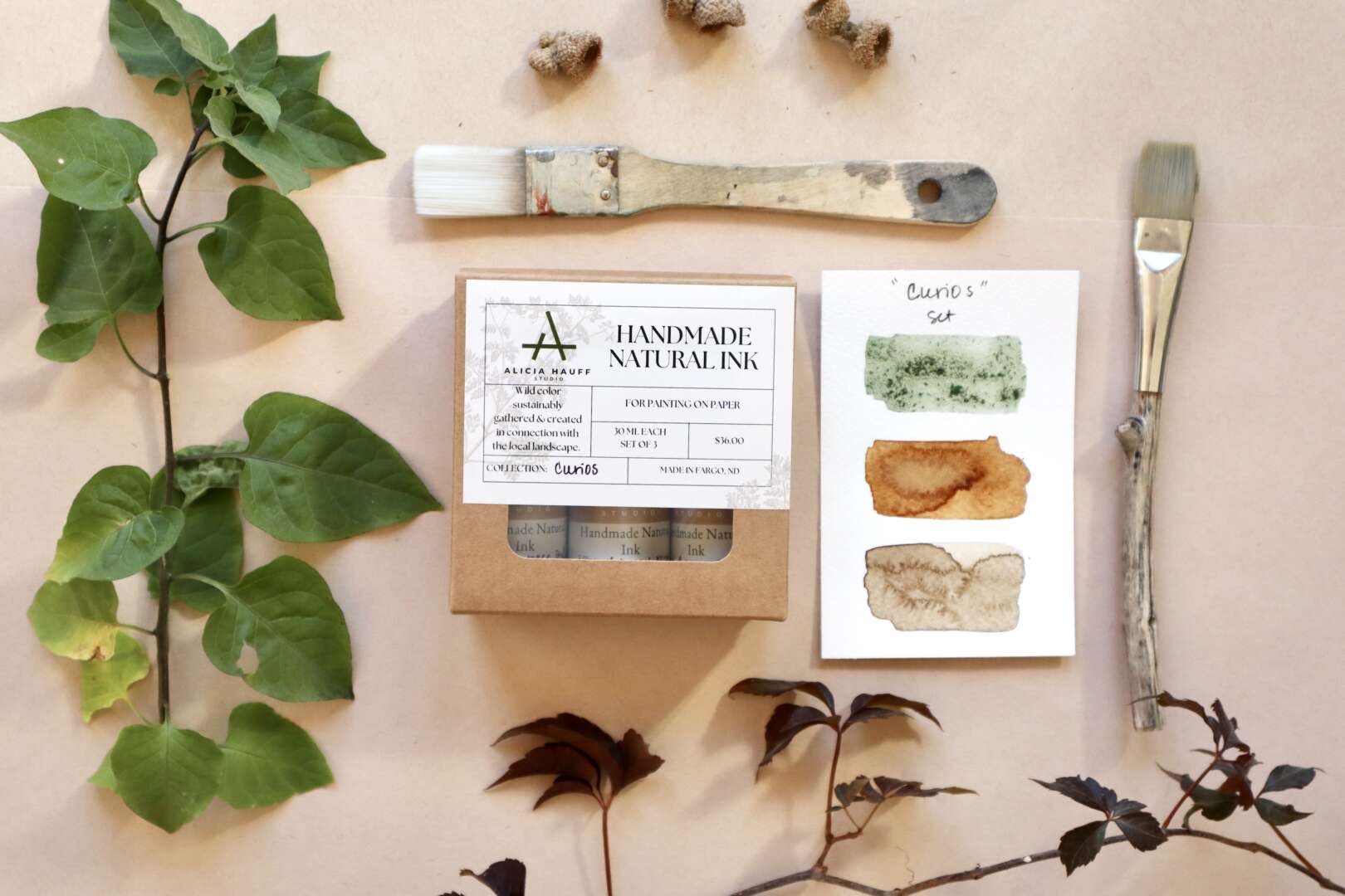 Ground chicory root: A few years ago I read about chicory having antioxidants and being used as a coffee alternative in the Civil War. This chicory is ground in Louisiana, and I had purchased it to drink it. I never fully transitioned to chicory coffee, but this is one of my all-time favorite inks to play with! It’s a rich leather-tan like color and feathers beautifully when dropped into water with the wet-in-wet technique.