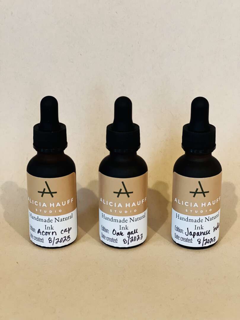 Oak gall: Oak what? Oak galls are formed from a specific gall wasp that likes to lay eggs on oak branches, resulting in these little green-turned-brown clusters of balls attached to oak branches. You may have seen them on a walk, especially in winter. They’re ground down and simmered with ferrous sulfate. The recipe called for black, but I got a black-blue. This is the ink that goes back centuries, used to write Beowulf, the Magna Carta, and the Declaration of Independence. It’s about as colorfast as it gets, aside from black walnut–due to the tannins.