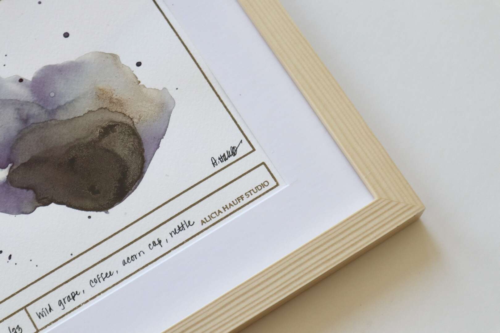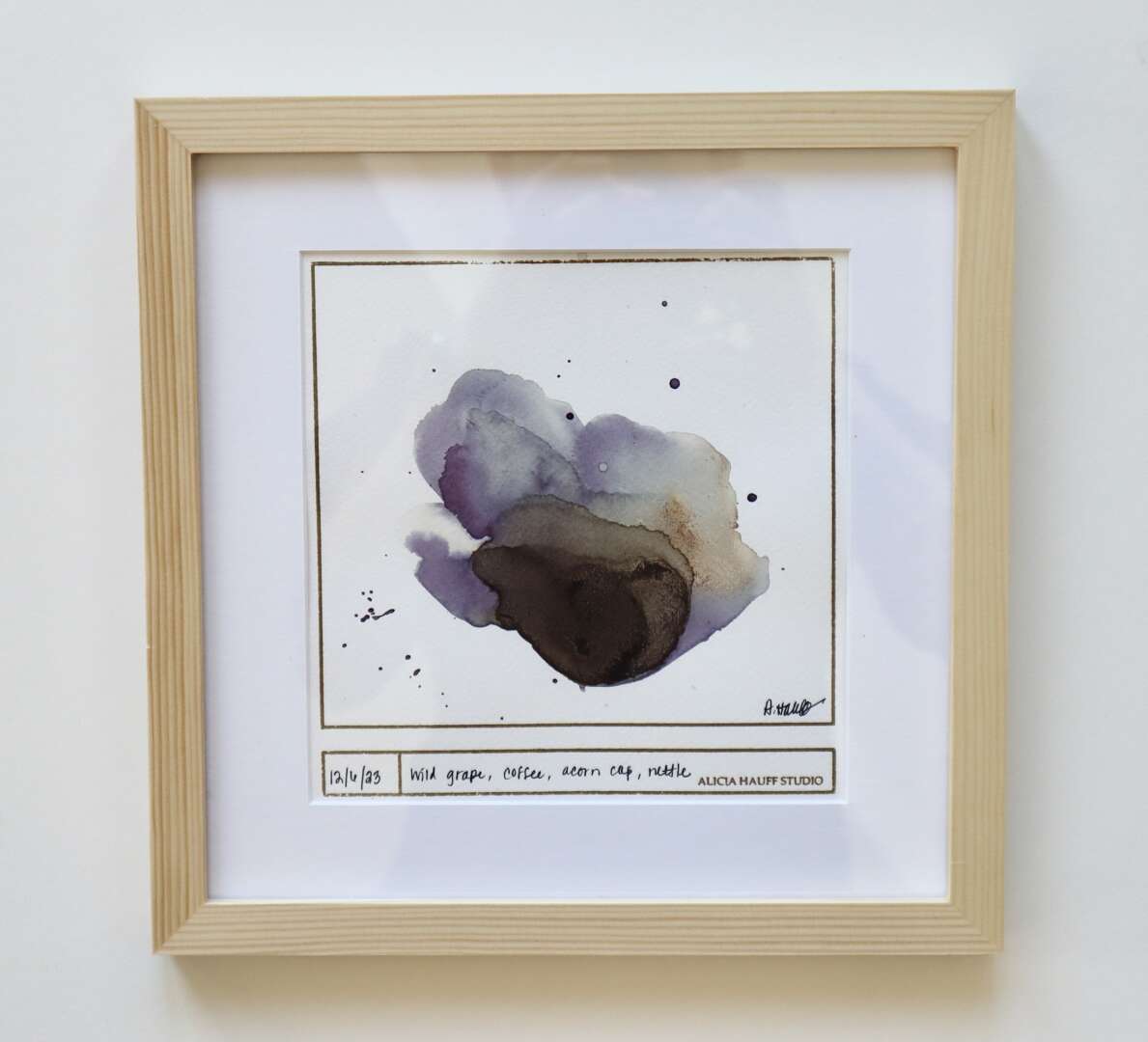 A mark of place and time, this wild ink sketch was created with abstract colors from wild grape, coffee, acorn caps, and nettle. Matted in a simple 10×10 inch pine frame with a stand in the back.