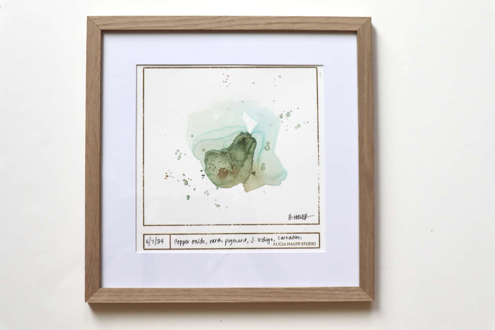 This ink sketch was created with copper oxide (perennial jar in my garage), foraged earth pigment, Japanese indigo I grew from seed, and pink carnation flowers. Framed in white oak with a white mat, ready to hang.