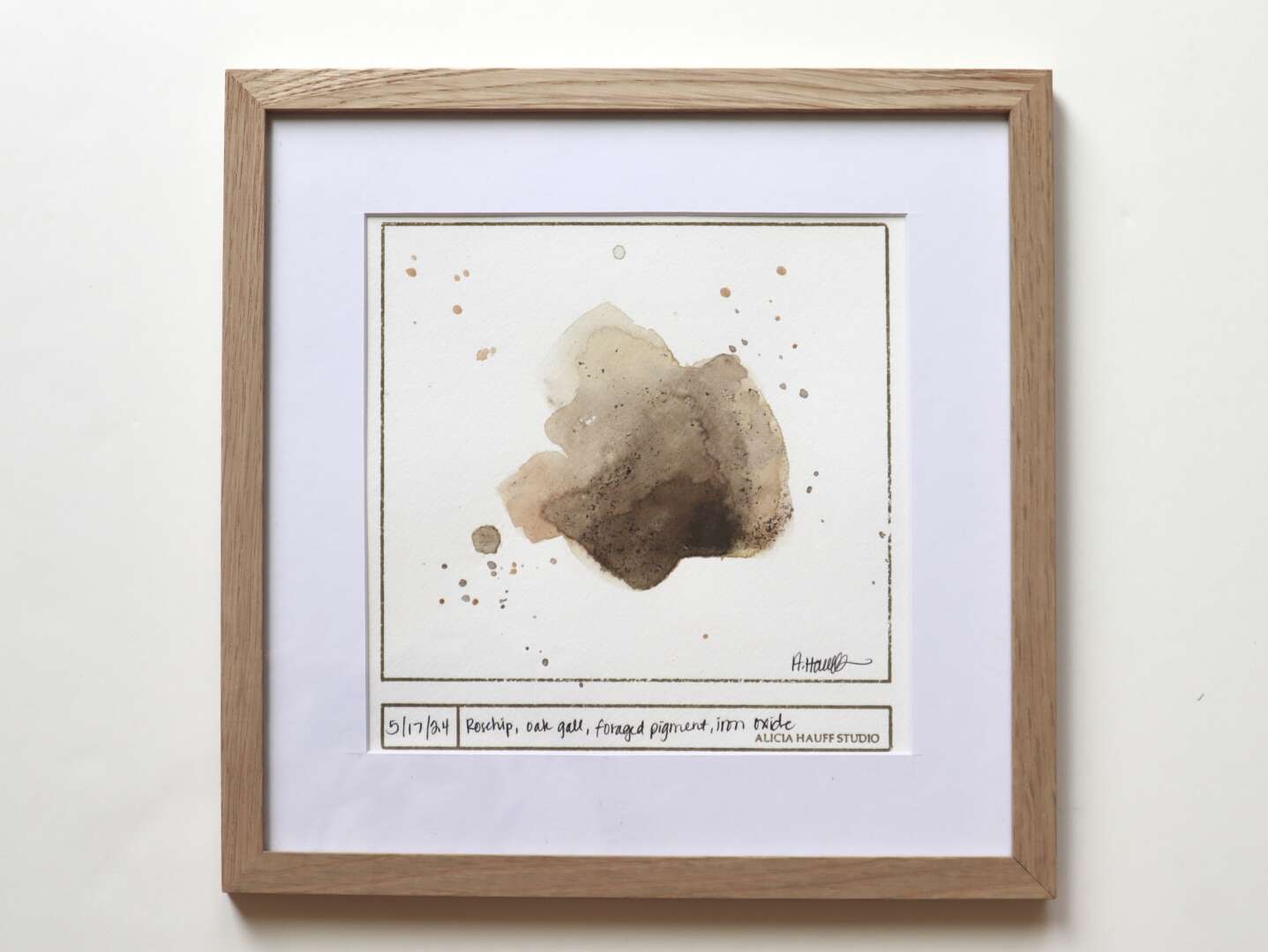 This ink sketch was created with orange rosehips from my garden, oak galls from my neighborhood oak trees, foraged pigment, and iron oxide. Framed in white oak with a white mat, ready to hang.