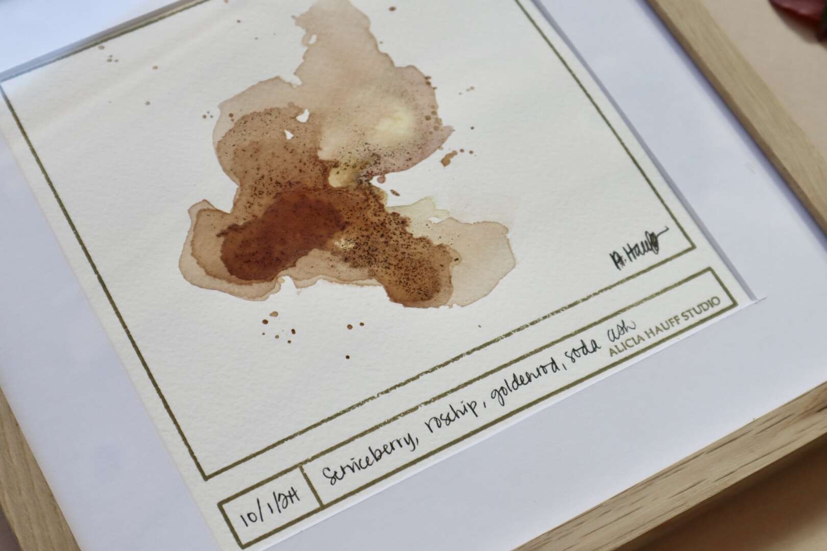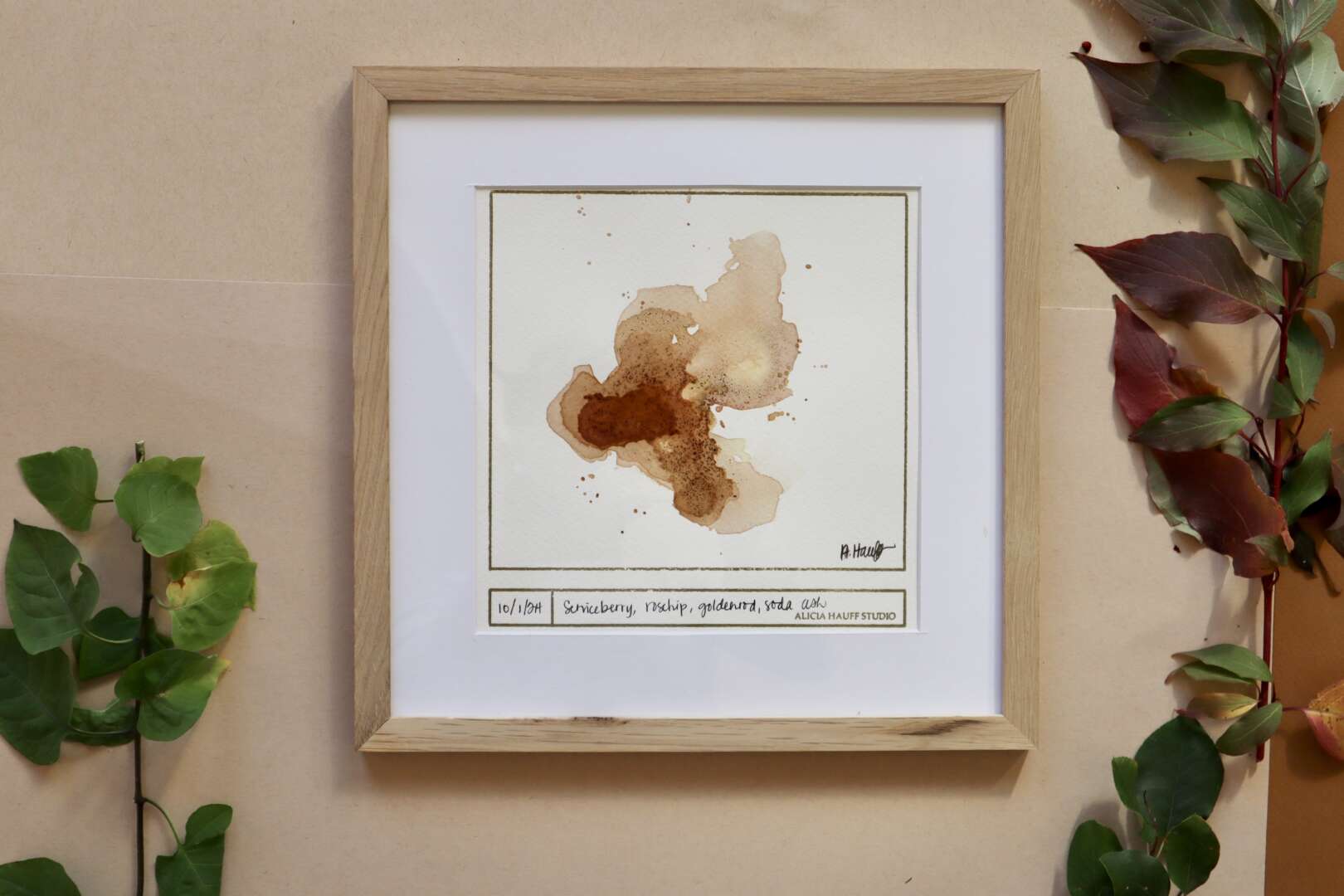 This ink sketch was created with serviceberries, rosehips, goldenrod flowers, and soda ash water. Framed in white oak with a white mat, ready to hang.