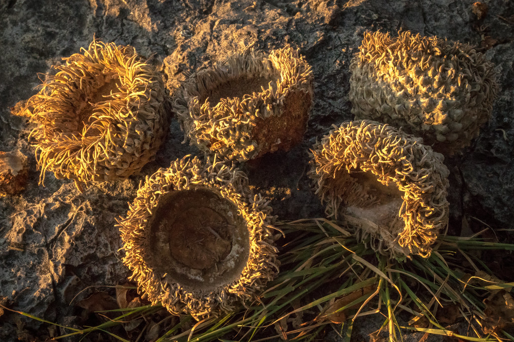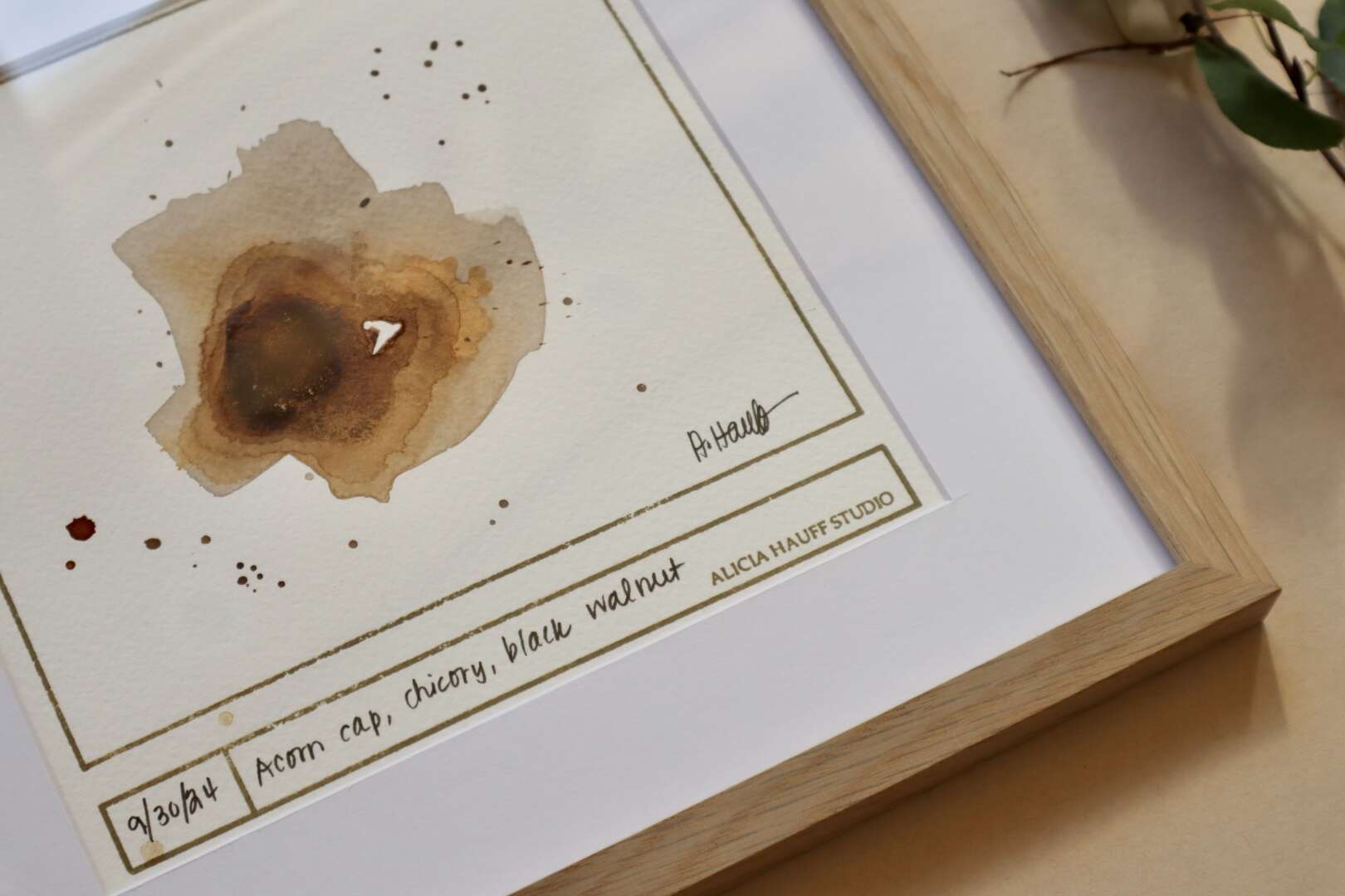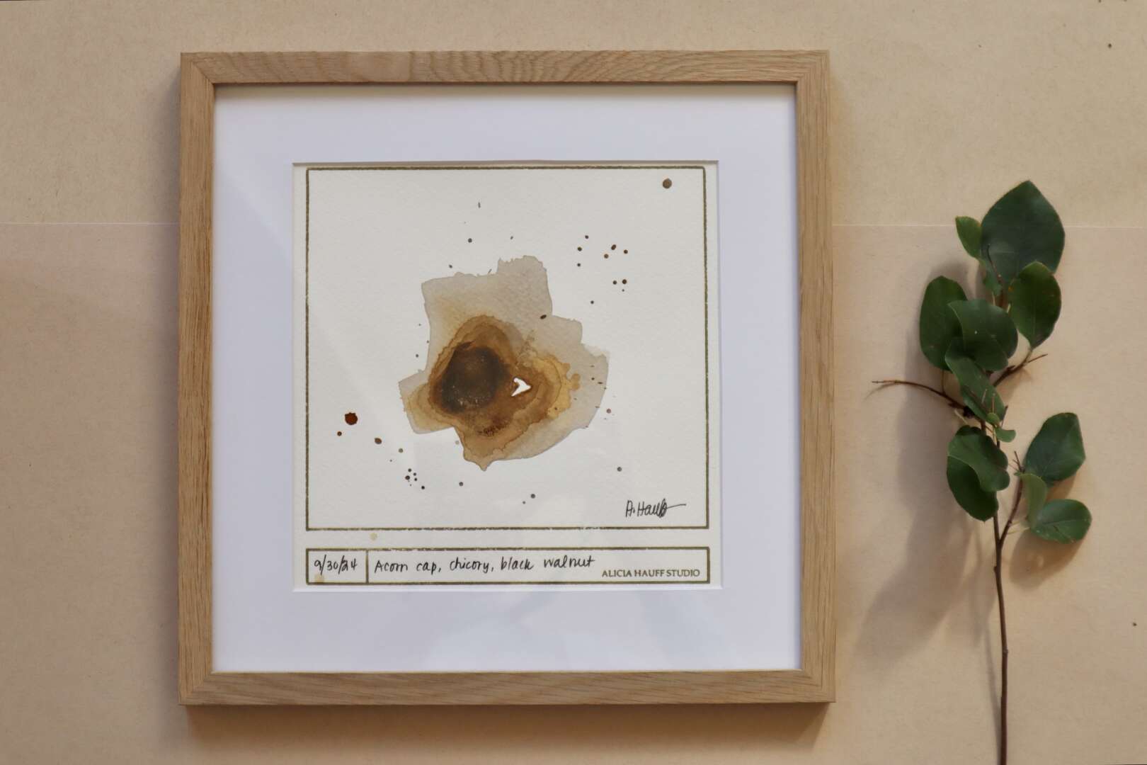 This ink sketch was created with acorn caps, ground chicory root, and black walnut husks. Framed in white oak with a white mat, ready to hang.